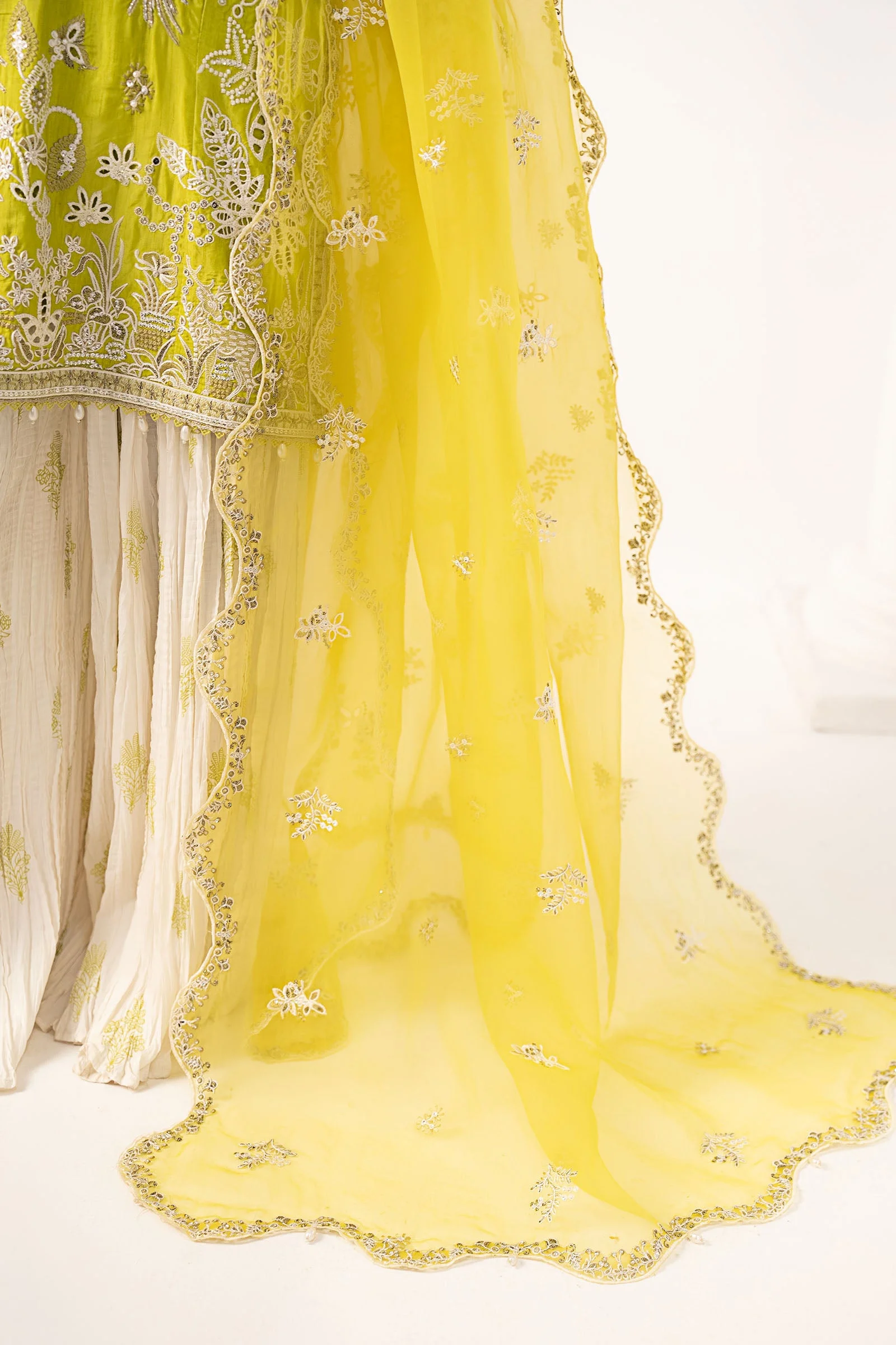 This exquisite sharara suit features intricate embroidery across the shirt and dupatta, bringing together classic craftsmanship and modern aesthetics. The vibrant acid green hue commands attention while remaining elegantly refined — ideal for festive occasions where you want to stand out beautifully. The crushed sharara adds a graceful, fluid movement that photographs beautifully at weddings and formal events.
