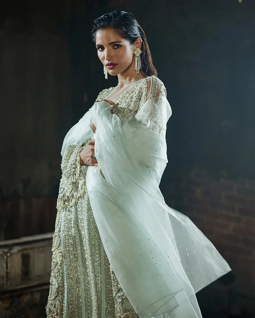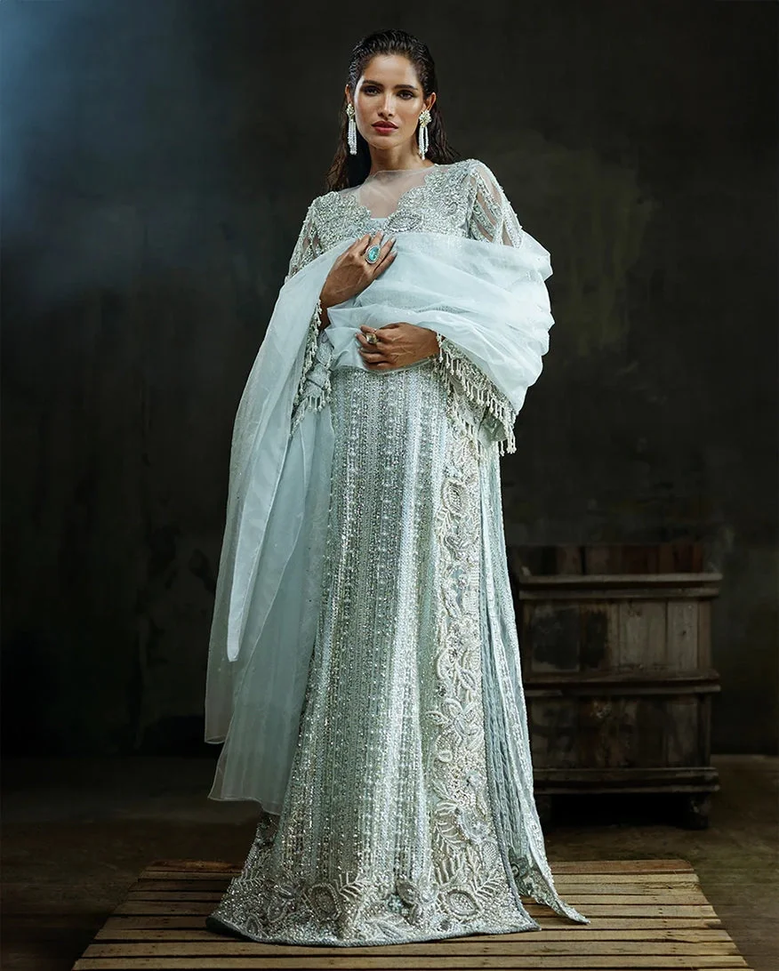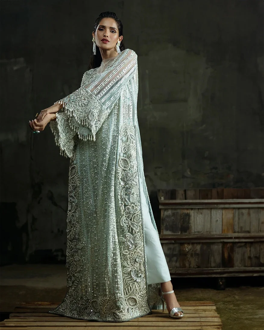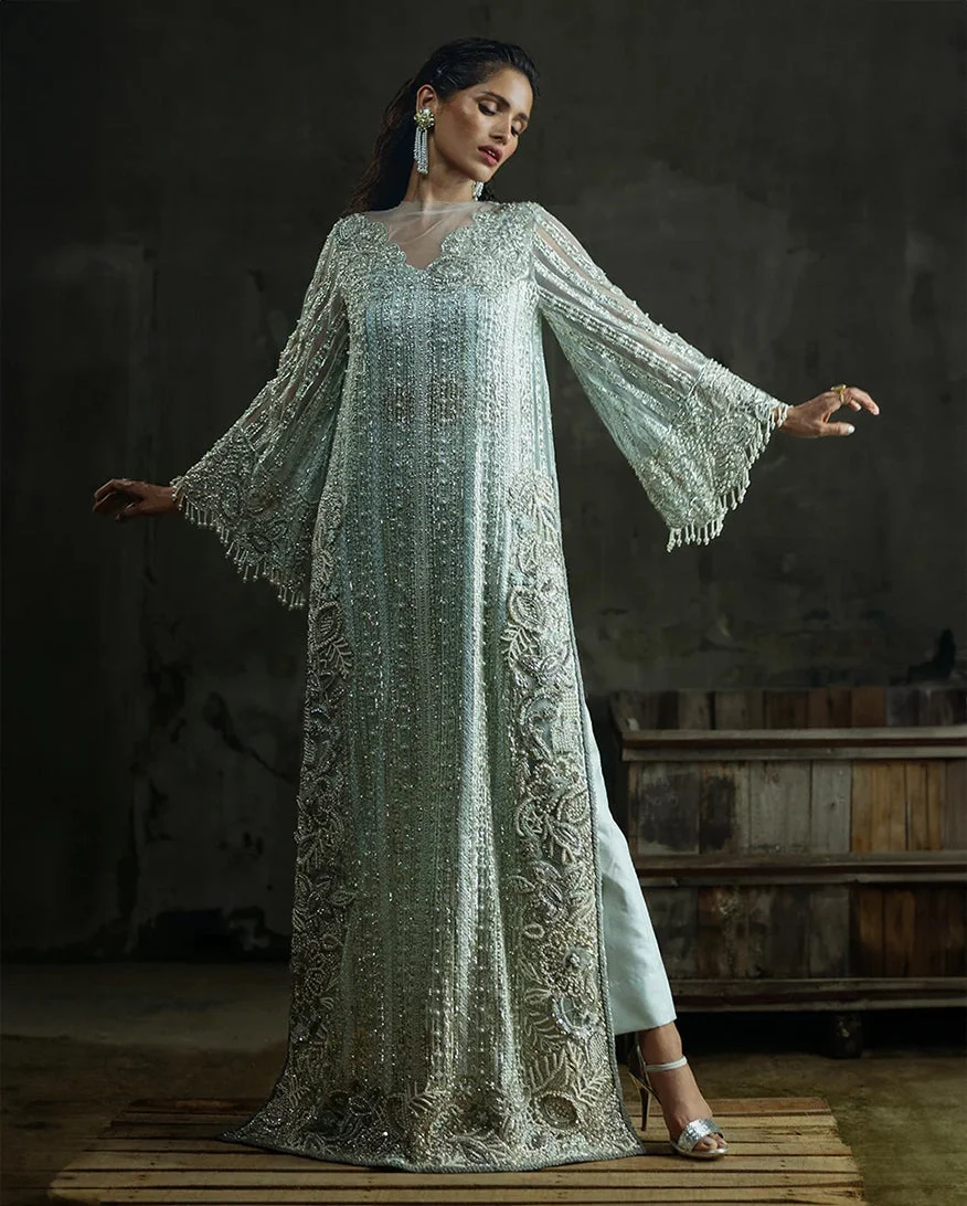 Every inch of this ensemble speaks to the extraordinary skill and vision behind Zilverah’s luxury formals collection. The focal point is the richly embroidered net shirt, adorned with intricate threadwork and embellishments that catch the light beautifully with every movement. Paired with flowing raw silk trousers and a diaphanous organza dupatta, the complete look exudes sophistication, grace, and timeless charm in a gorgeous aqua hue that stands out in any room.