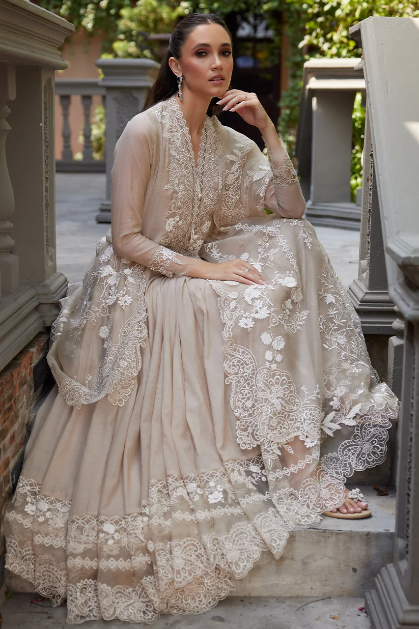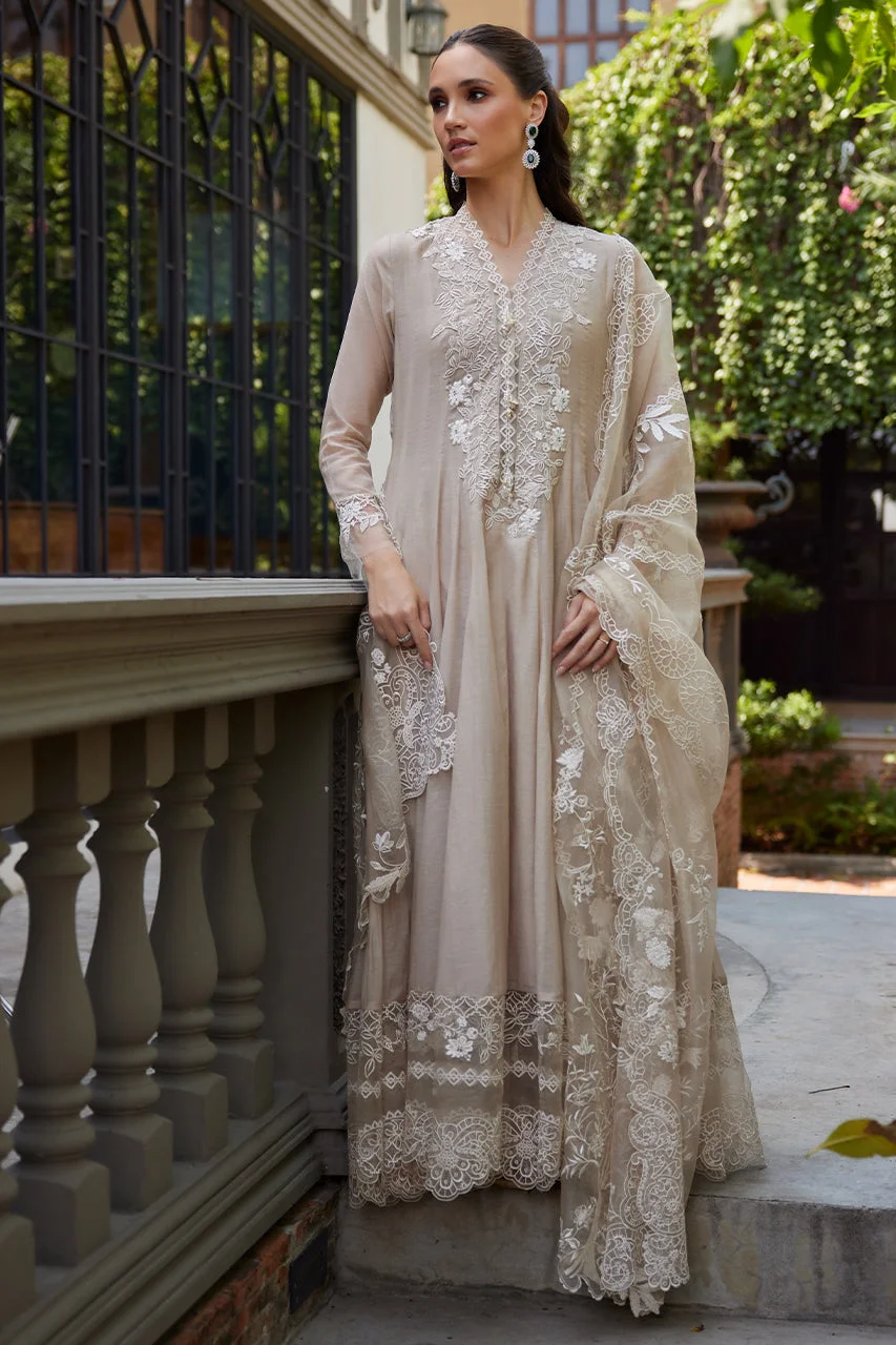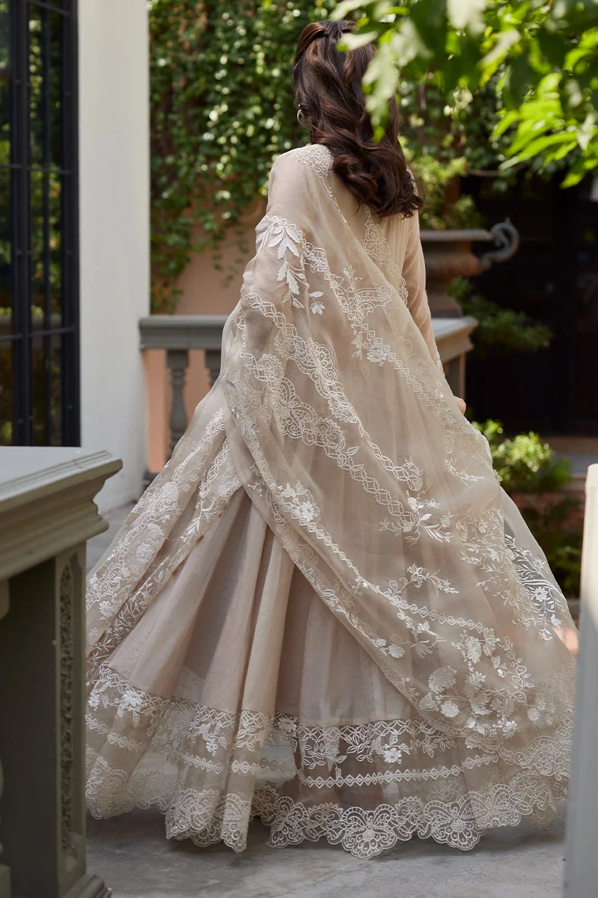 Elevate your festive wardrobe with this exquisite beige kalidar formal wear ensemble by Zilverah — crafted in luxurious Kora Silk with intricate white floral embroidery, cutwork detailing, and handmade tassels that exude timeless Pakistani elegance. Perfect for Eid celebrations, weddings, and upscale parties, this floor-skimming 3-piece set arrives with a beautifully embroidered organza dupatta to complete your look. Order now at PKR 44,000 with free delivery across Pakistan on orders above PKR 10,000.