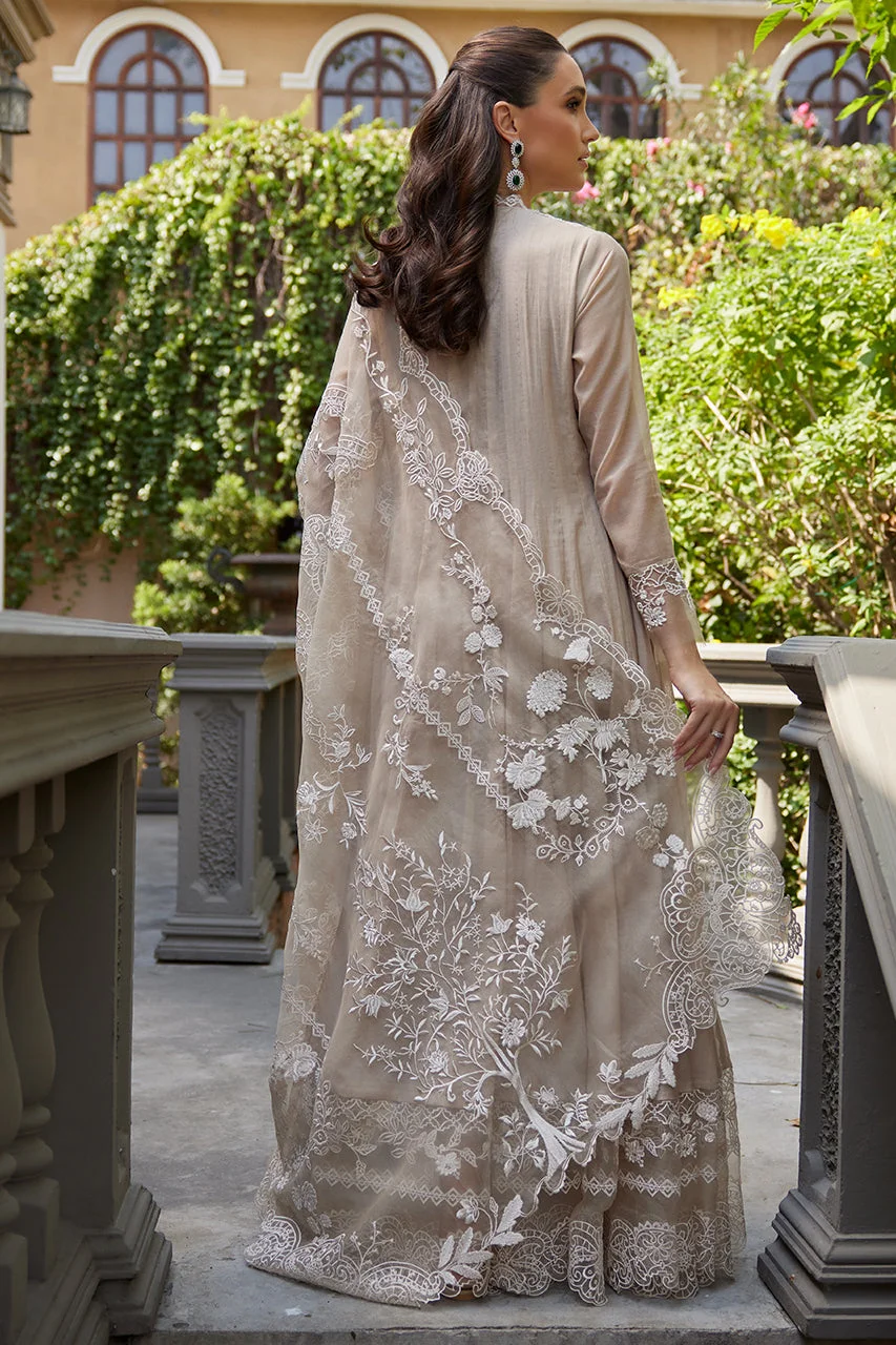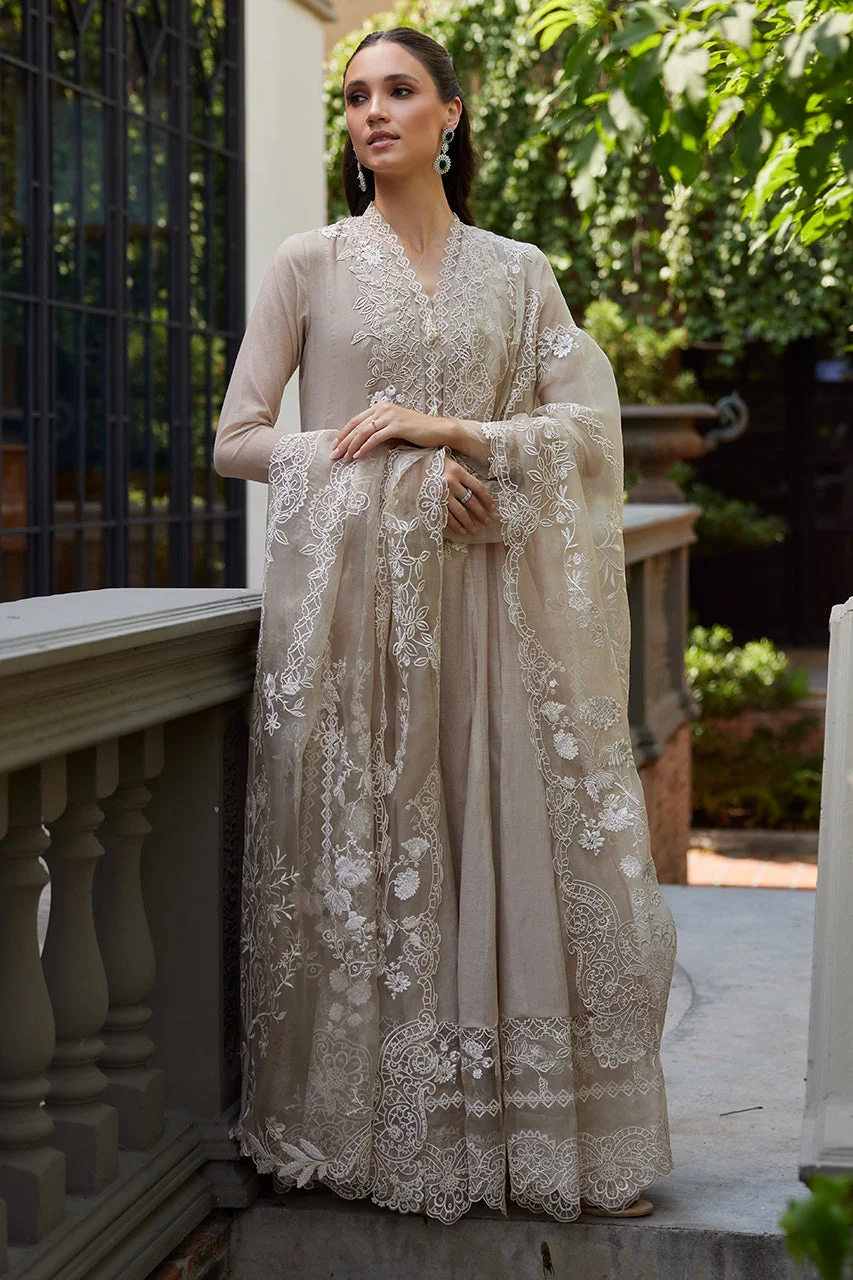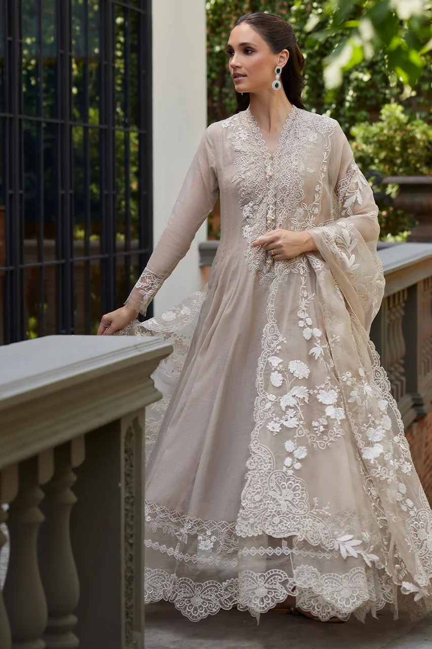 Elevate your festive wardrobe with this exquisite beige kalidar formal wear ensemble by Zilverah — crafted in luxurious Kora Silk with intricate white floral embroidery, cutwork detailing, and handmade tassels that exude timeless Pakistani elegance. Perfect for Eid celebrations, weddings, and upscale parties, this floor-skimming 3-piece set arrives with a beautifully embroidered organza dupatta to complete your look. Order now at PKR 44,000 with free delivery across Pakistan on orders above PKR 10,000.