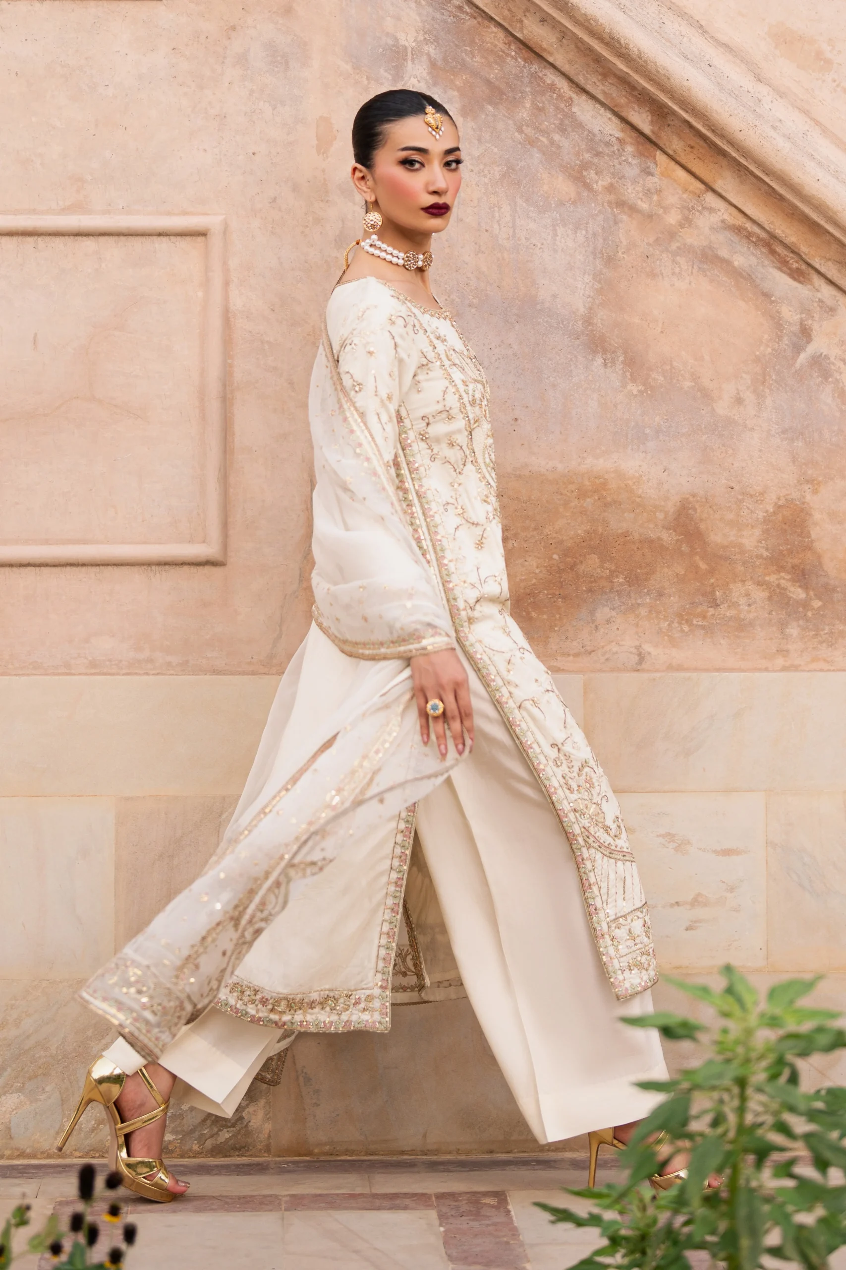 Pair this embroidered shirt with ivory or champagne silk trousers for a cohesive, polished look. Add statement gold jhumkas and a nude clutch to complete your ensemble. A soft chiffon dupatta in blush or gold tones would complement the sequin work beautifully. Keep your makeup warm and luminous to match the beige palette — think bronzed eyes and a nude lip for an effortlessly chic finish.