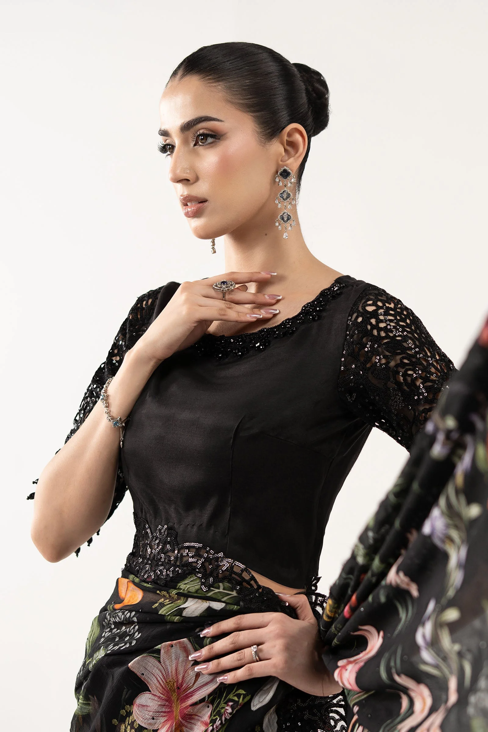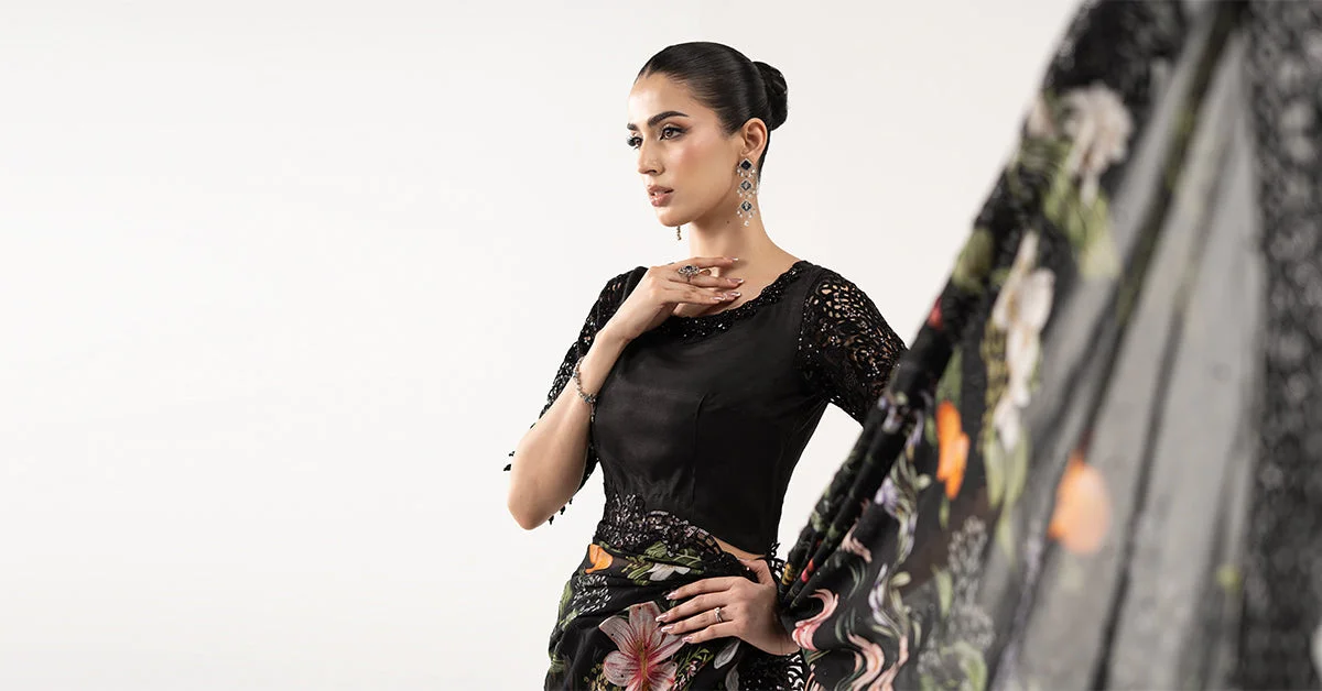 Elevate your wardrobe with the Zilverah Black Embroidered Chiffon Saree — one of the most coveted pieces in luxury party wear this season. Designed for the modern Pakistani woman who celebrates tradition without compromising on style, this exquisite saree is a must-have for every formal occasion. Whether you’re dressing up for a grand wedding in Lahore or an elegant Eid dinner in Karachi, this ensemble is crafted to turn heads and command attention.
