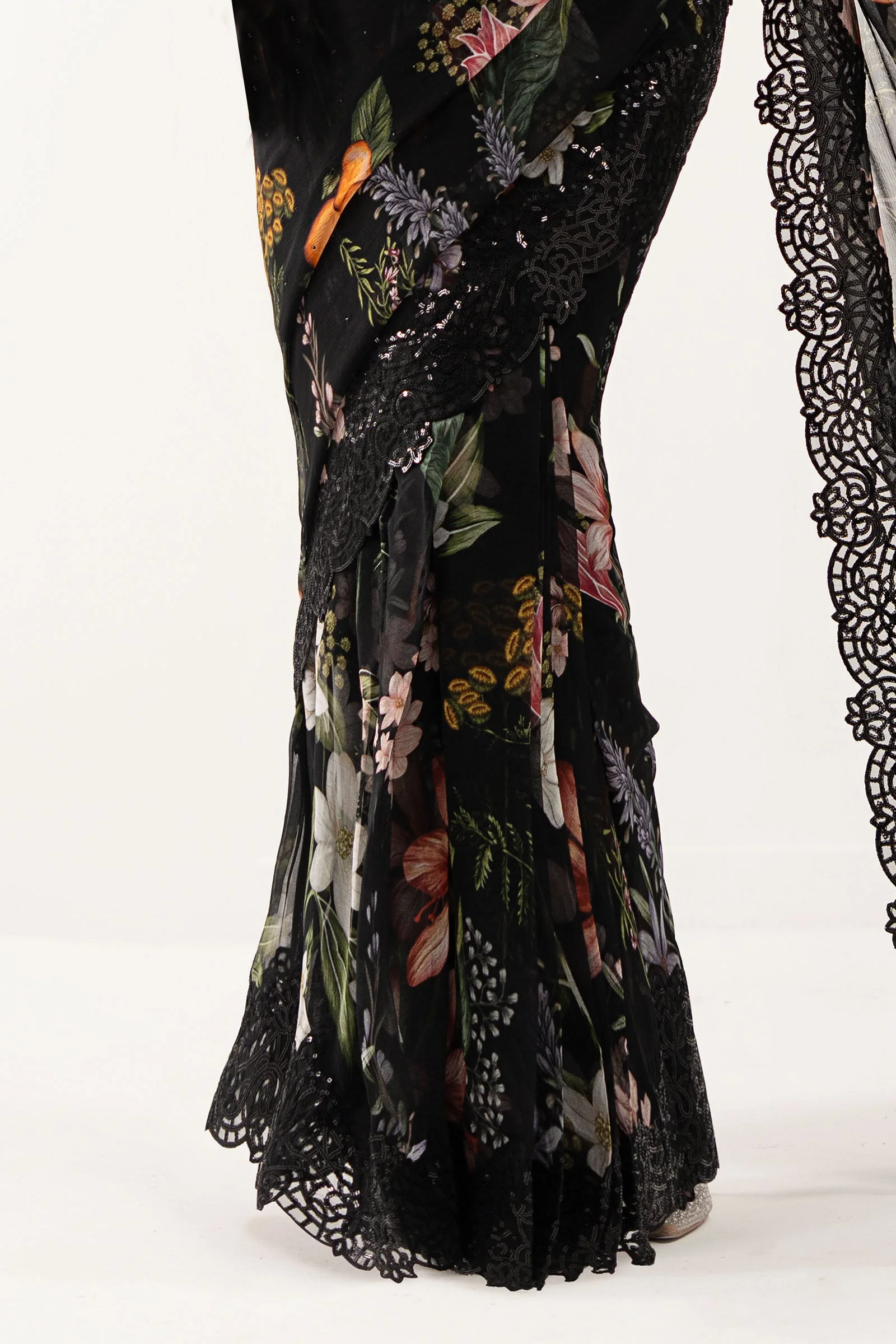 The saree features rich printed embroidery across the chiffon drape, delivering a visual grandeur that is both regal and refined. The deep black palette makes it universally flattering and incredibly versatile for evening events. Delicate embroidered motifs are thoughtfully placed to enhance the natural silhouette, giving the wearer an effortlessly graceful presence.