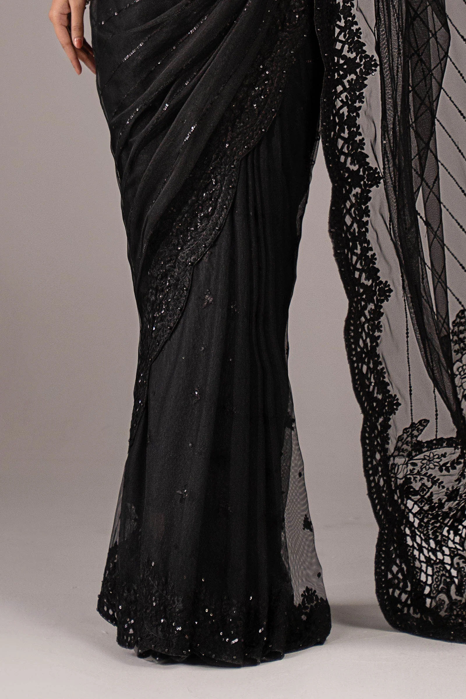 The saree features all-over intricate embroidery on luxurious net fabric, delivering a rich, multi-dimensional texture that catches the light beautifully. The deep black palette makes it a versatile and sophisticated choice for evening wear and formal gatherings. The fitted embroidered raw silk blouse complements the flowing net saree with precision tailoring, creating a silhouette that is both classic and contemporary.