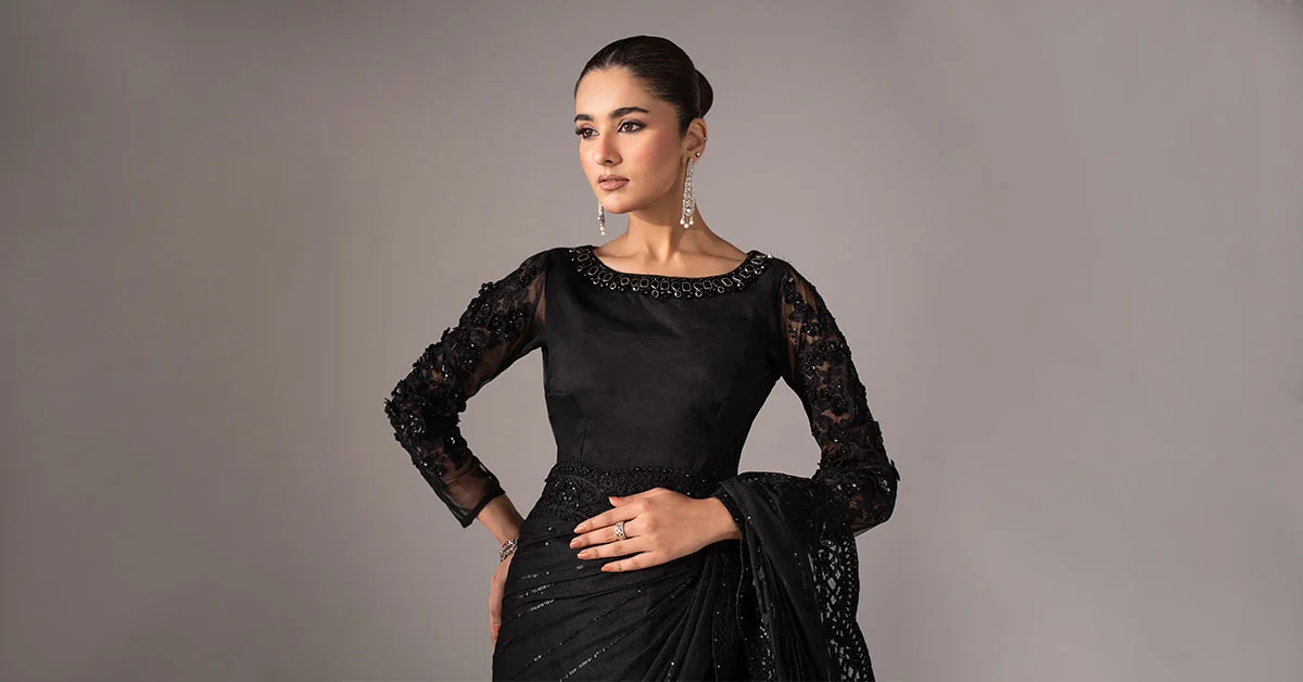This black embroidered net saree is your go-to for a range of special occasions in Pakistan: