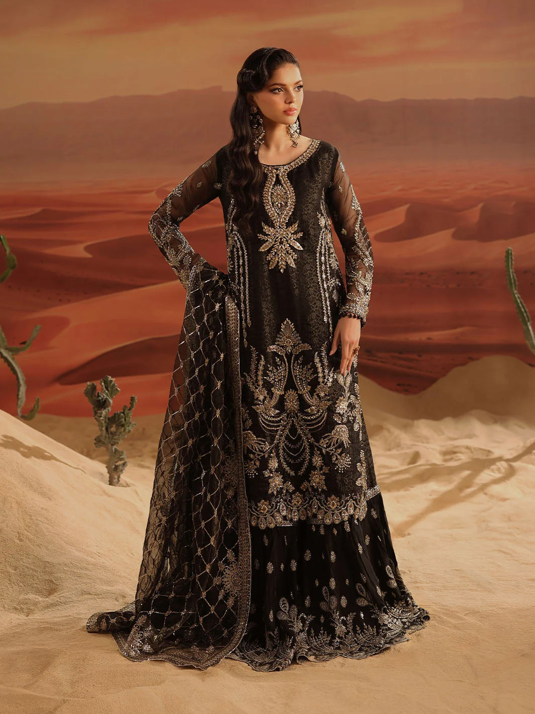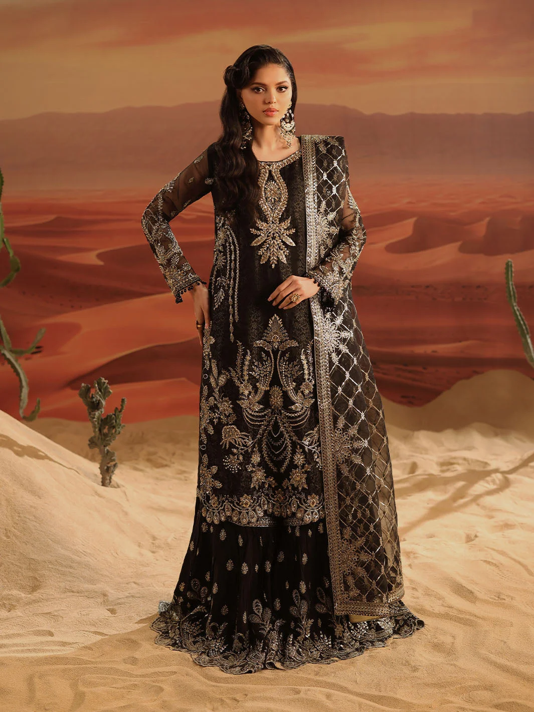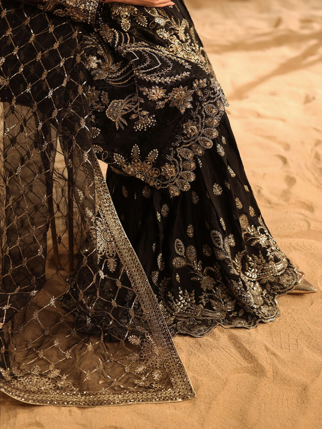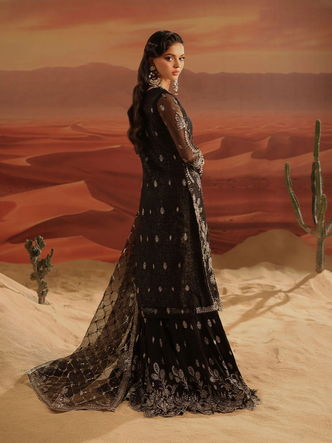 The Zilverah Black Gharara is a celebration of artisanal craftsmanship. The deep black base is elevated by meticulously applied silver embellishments that catch the light with every movement, creating a look that is both regal and contemporary. The flowing organza kameez features delicate embroidery work that frames the silhouette beautifully, while the jacquard gharara adds rich texture and volume that is quintessentially Pakistani in its grandeur.