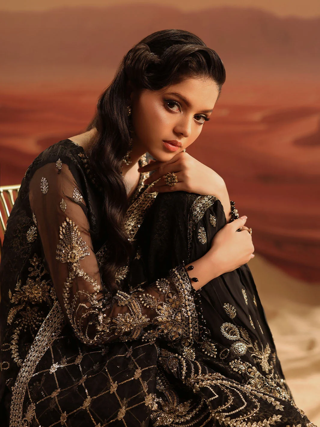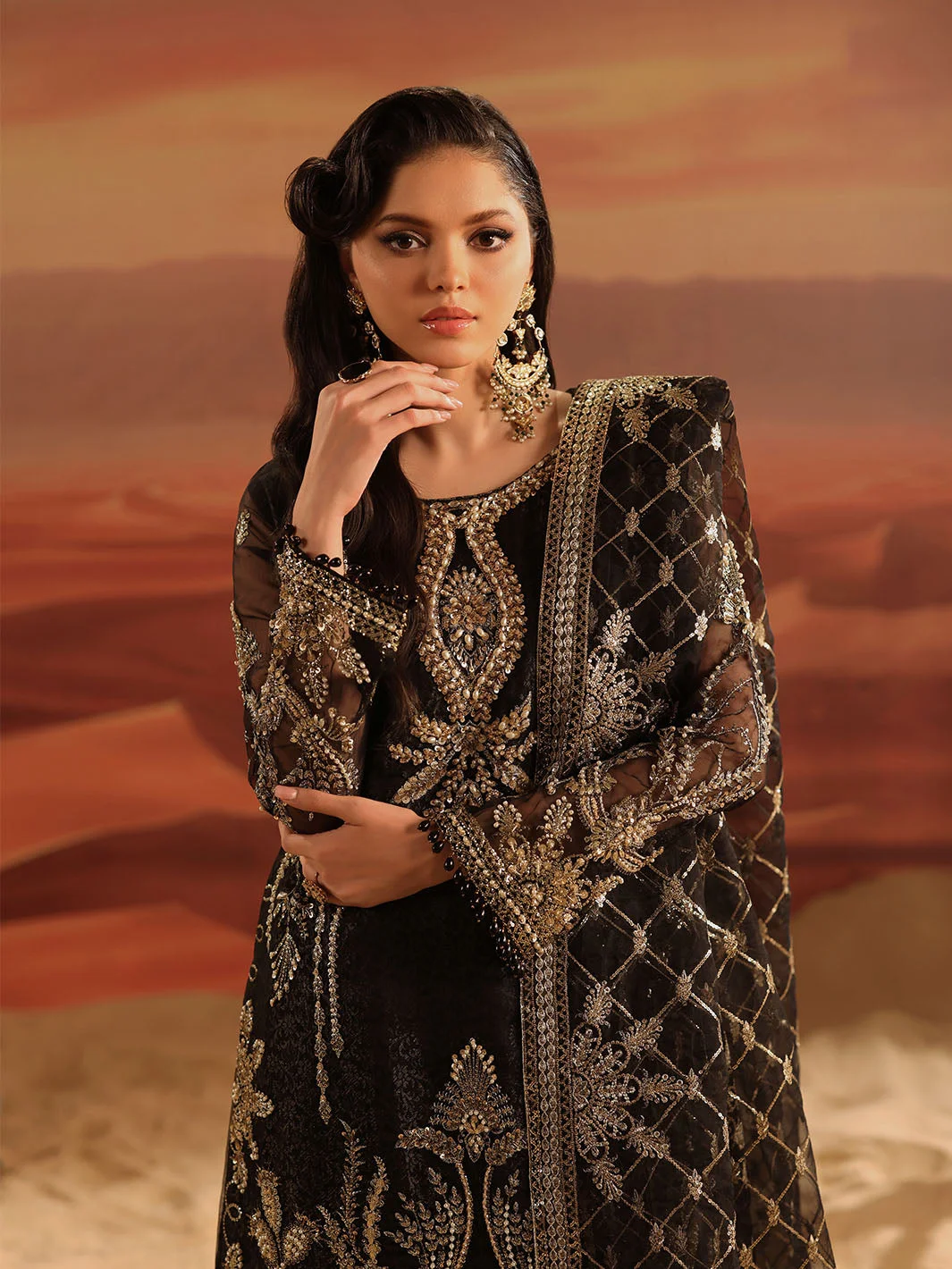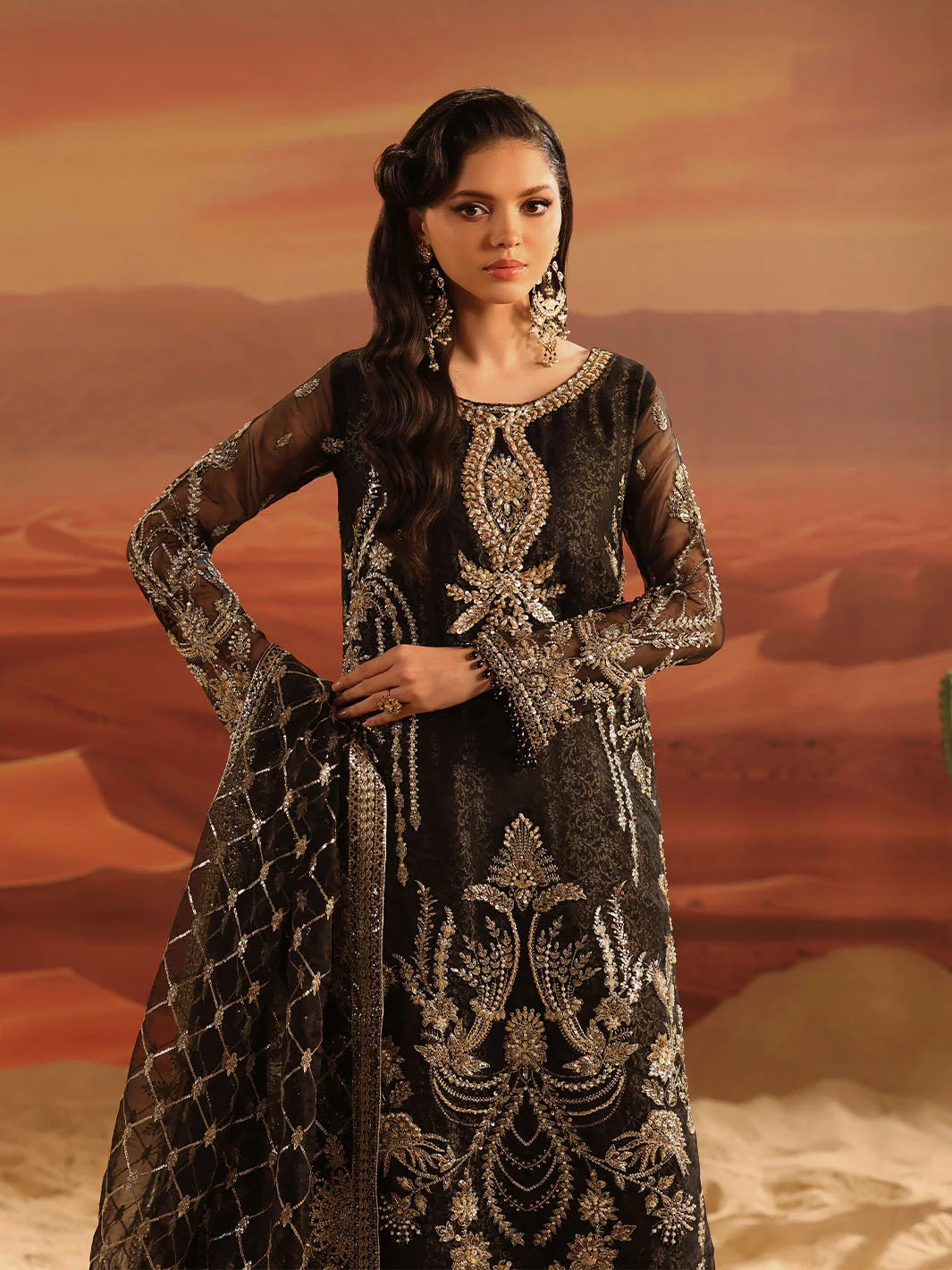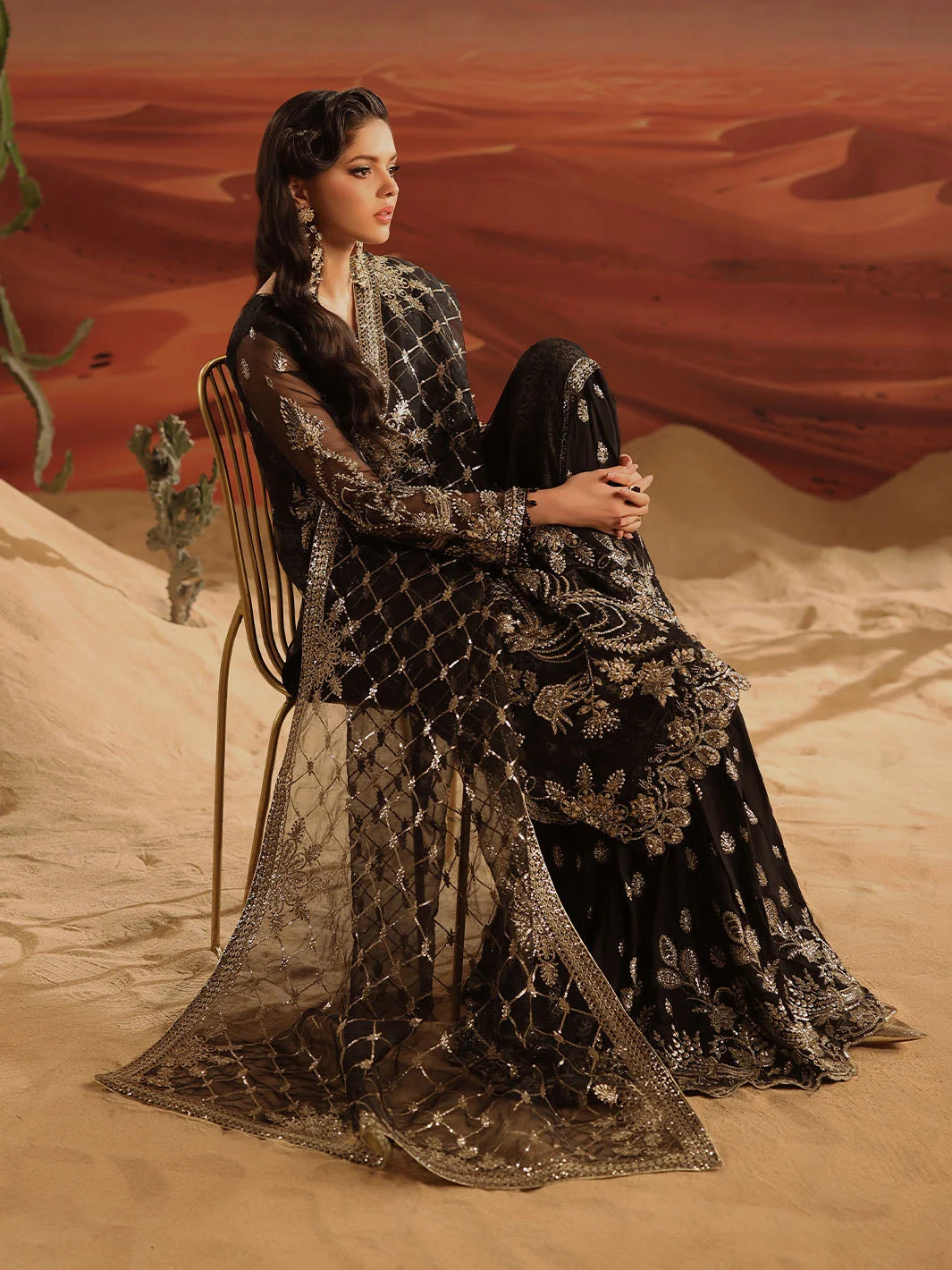 The Zilverah Black Gharara is a celebration of artisanal craftsmanship. The deep black base is elevated by meticulously applied silver embellishments that catch the light with every movement, creating a look that is both regal and contemporary. The flowing organza kameez features delicate embroidery work that frames the silhouette beautifully, while the jacquard gharara adds rich texture and volume that is quintessentially Pakistani in its grandeur.
