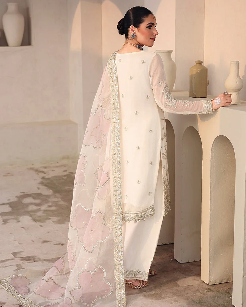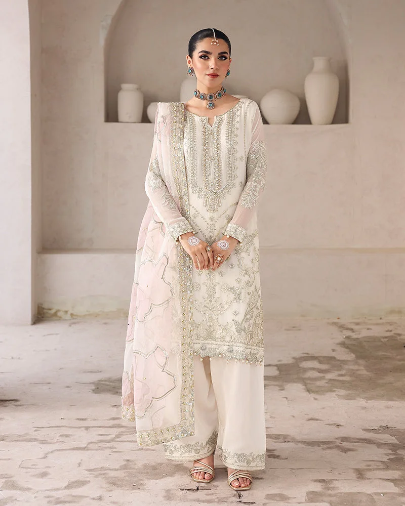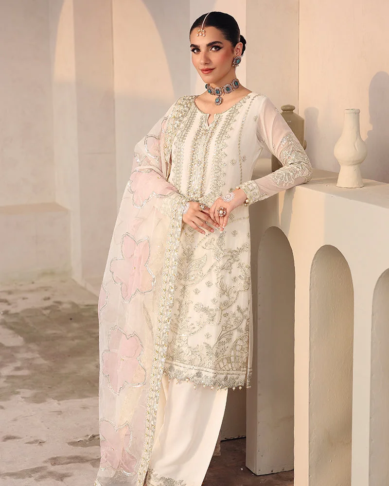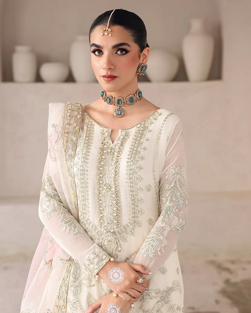 Make a dazzling statement in this Zilverah 3-piece party wear suit, crafted in luxurious chiffon with breathtaking sequin embroidery, pearl accents, crystals, cutdana detailing, and stunning 3D embellishments. Paired with an organza dupatta and a stylish viscose farshi shalwar adorned with spangle embroidery, this ensemble is everything you need to stand out at weddings, formals, and festive gatherings. Shop now at PKR 24,000 and enjoy free delivery across Pakistan on orders above PKR 10,000.