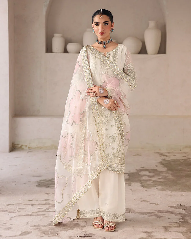 The organza dupatta continues the theme of opulence with matching sequin embroidery and pearl accents, while the viscose farshi shalwar features sparkling spangle embroidery that ties the entire look together seamlessly.