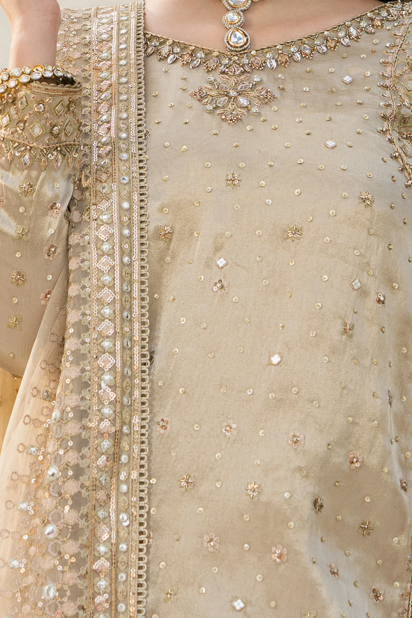 The shirt is crafted from premium tissue fabric, known for its smooth, lightweight surface and gentle natural sheen — a fabric beloved in Pakistani formal fashion for its luxurious drape and breathable comfort. The dupatta is crafted from net, adding an airy, ethereal layer that complements the soft glamour of the ensemble.