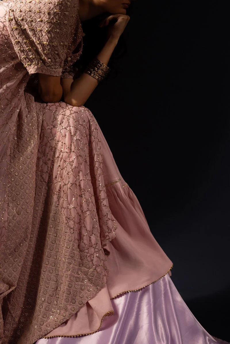 The centerpiece of this ensemble is an exquisitely crafted Anarkali-style kameez that radiates regal femininity. Every inch of the bodice is richly embellished with multi-tonal threadwork, shimmering sequin detailing, and elegant pearl accents that catch the light beautifully. Soft, romantic gathers fall gracefully from the empire waist at both the front and back, creating a flared silhouette that flows with every step. The feminine puff sleeves are thoughtfully finished with hand-applied gota work on cuffed hems — a hallmark of fine Pakistani artisanal craftsmanship.