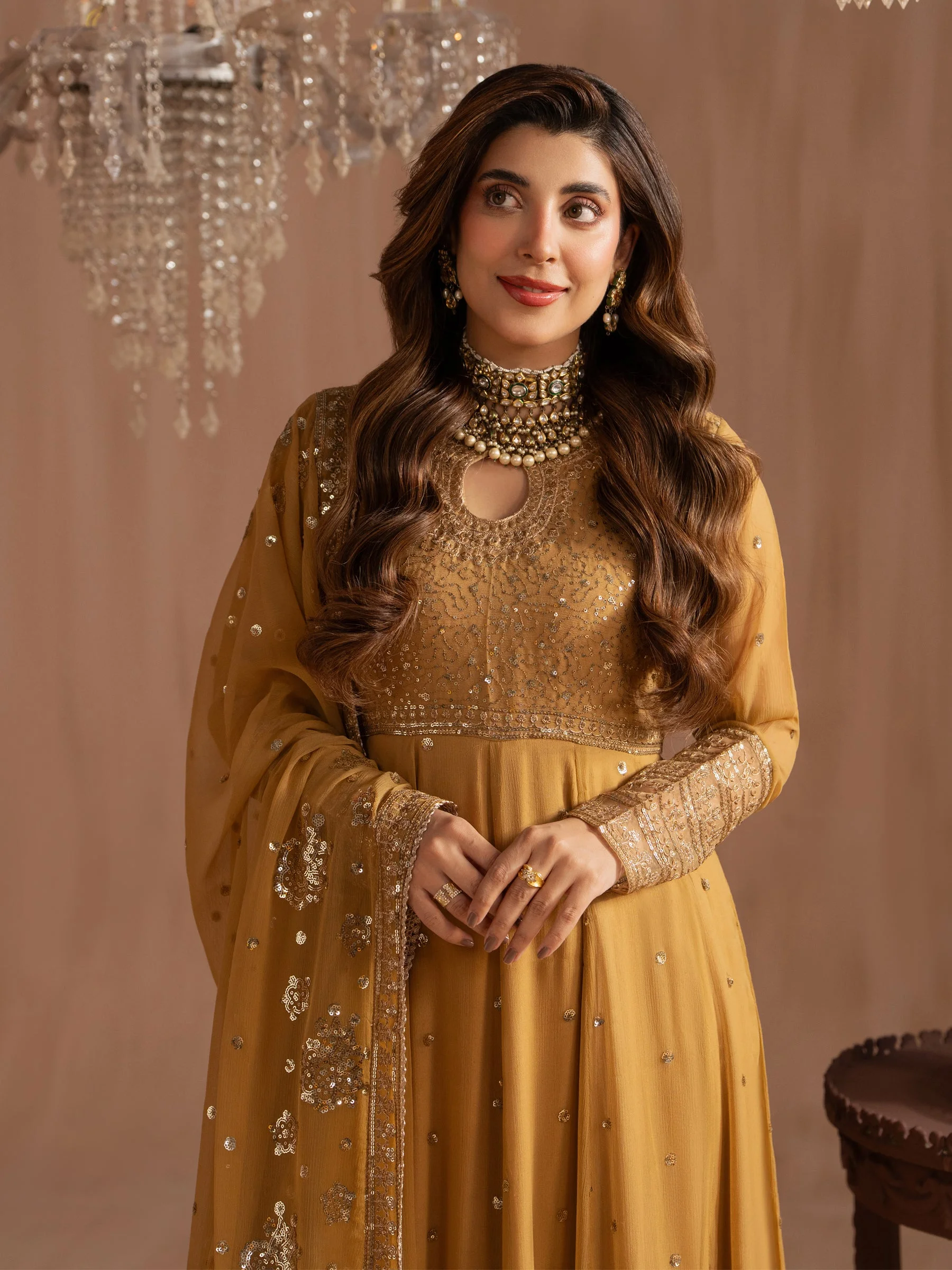 Pair this embroidered chiffon maxi with strappy heels or embellished khussas for a classic Pakistani formal look. Style your hair in a sleek updo or soft curls to let the dupatta drape elegantly over your shoulders. Add pearl drop earrings and a matching clutch to complete your ensemble. For bolder styling, drape the dupatta asymmetrically for a modern, fashion-forward silhouette that works beautifully for parties in Lahore, Karachi, and Islamabad.