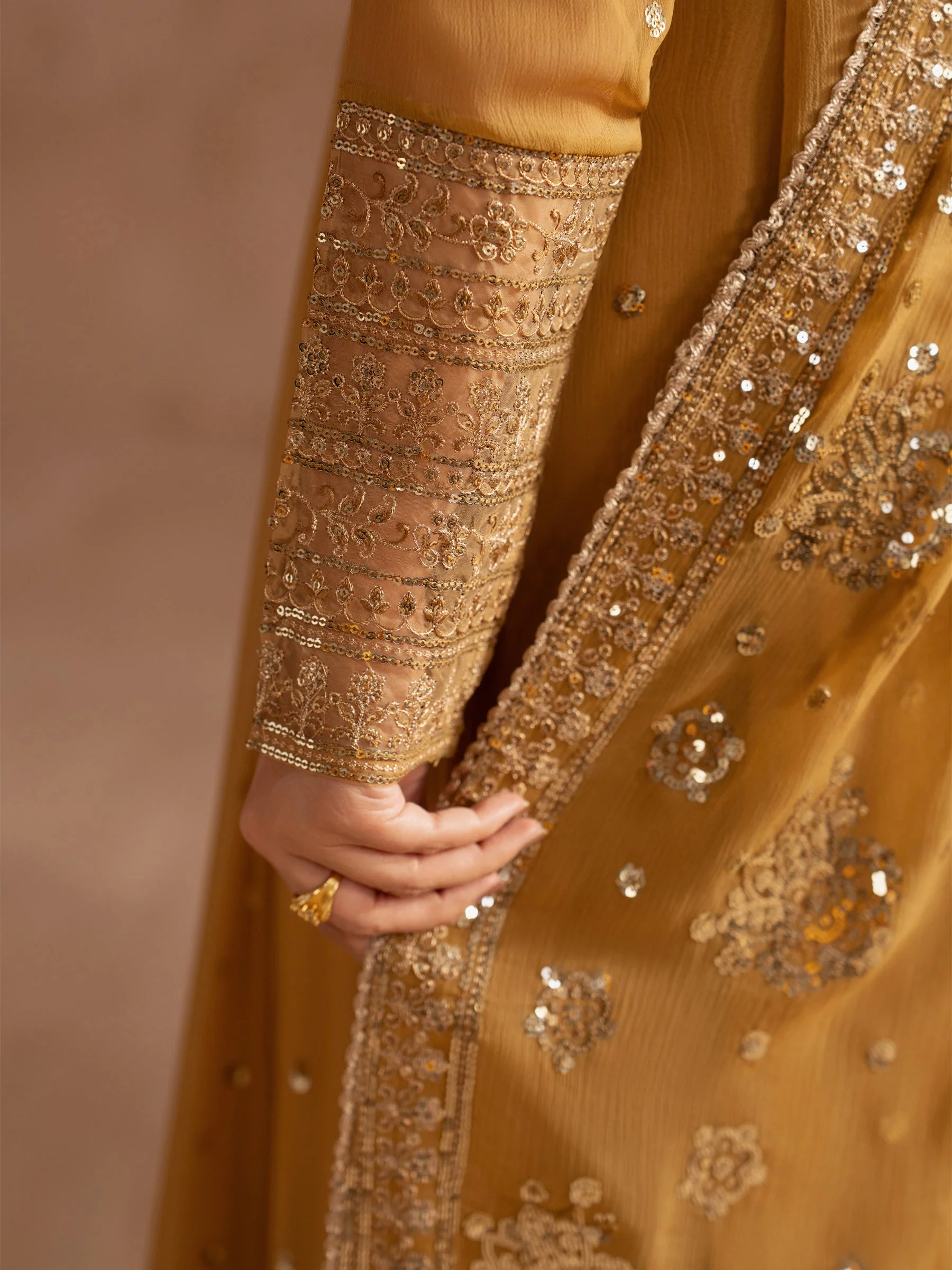 At Zilverah, we believe that luxury starts with quality fabric. This 3-piece set features a harmonious blend of premium dyed chiffon and raw silk — two fabrics beloved in Pakistani fashion for their elegance and comfort. The chiffon provides a lightweight, airy drape ideal for warm evenings and indoor events, while the raw silk trouser adds a structured, polished contrast that elevates the overall look.