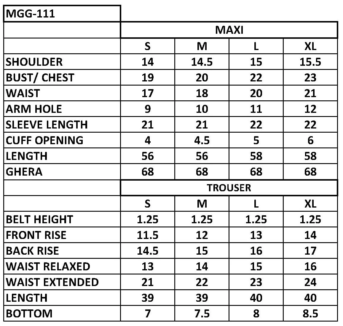 | Ghera (inches) | 68 | 68 | 68 | 68 |
