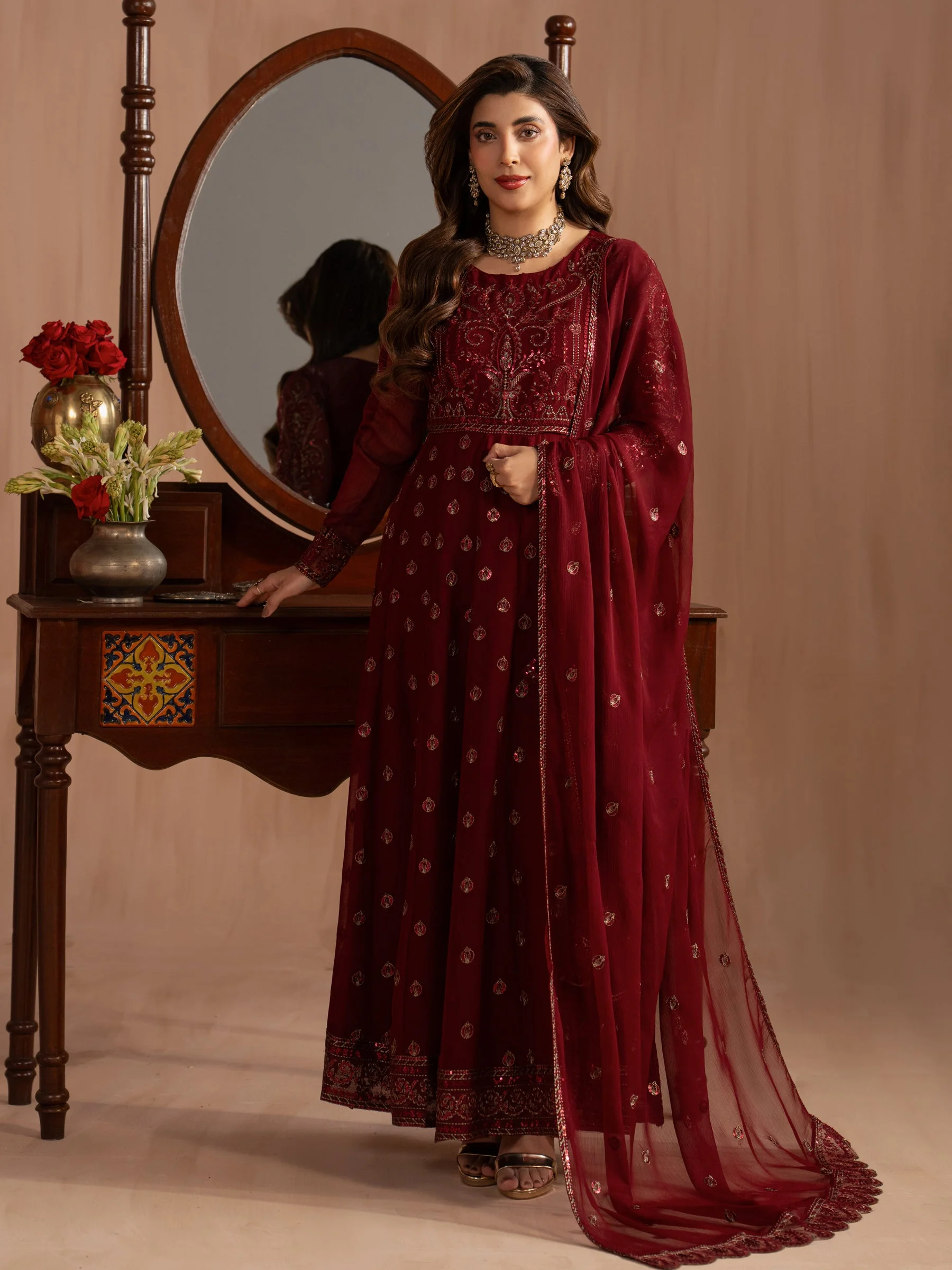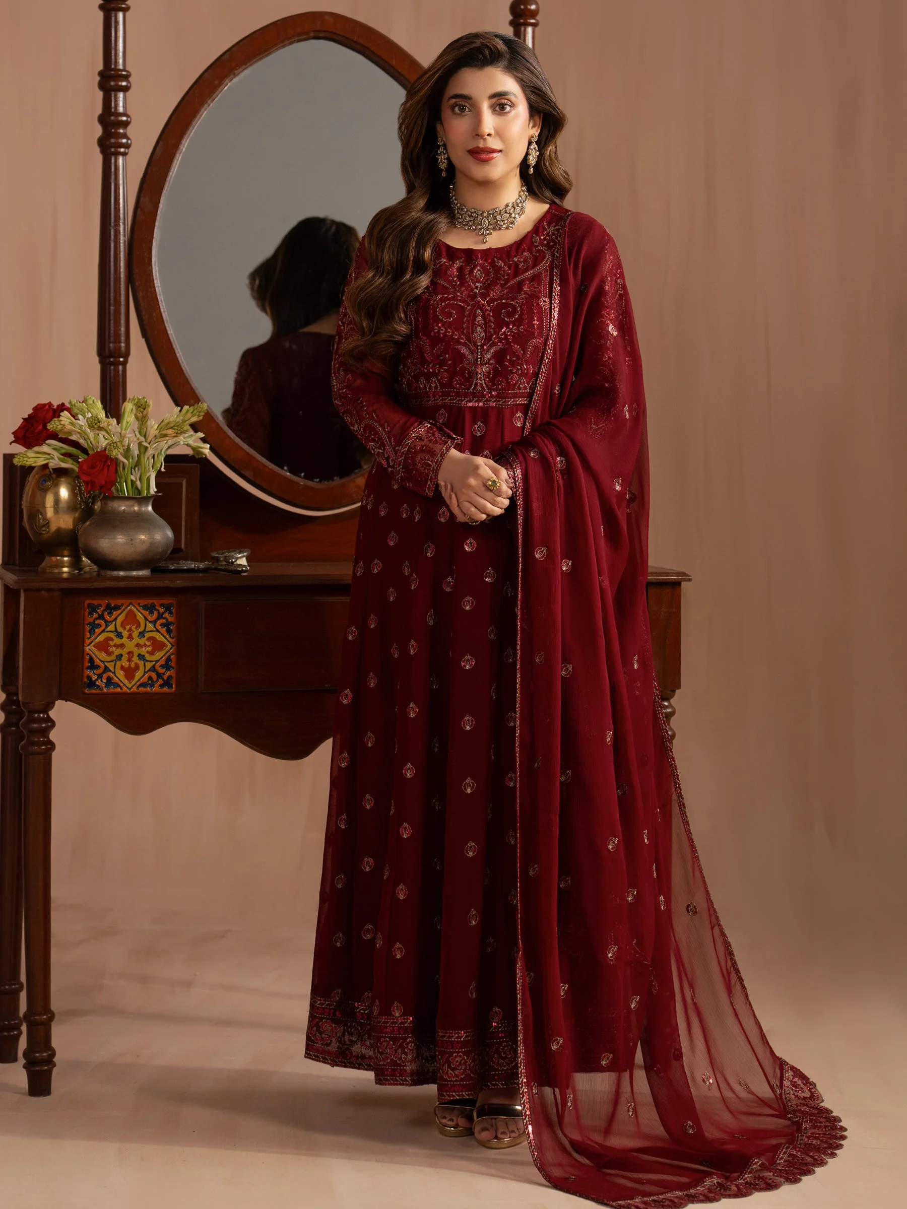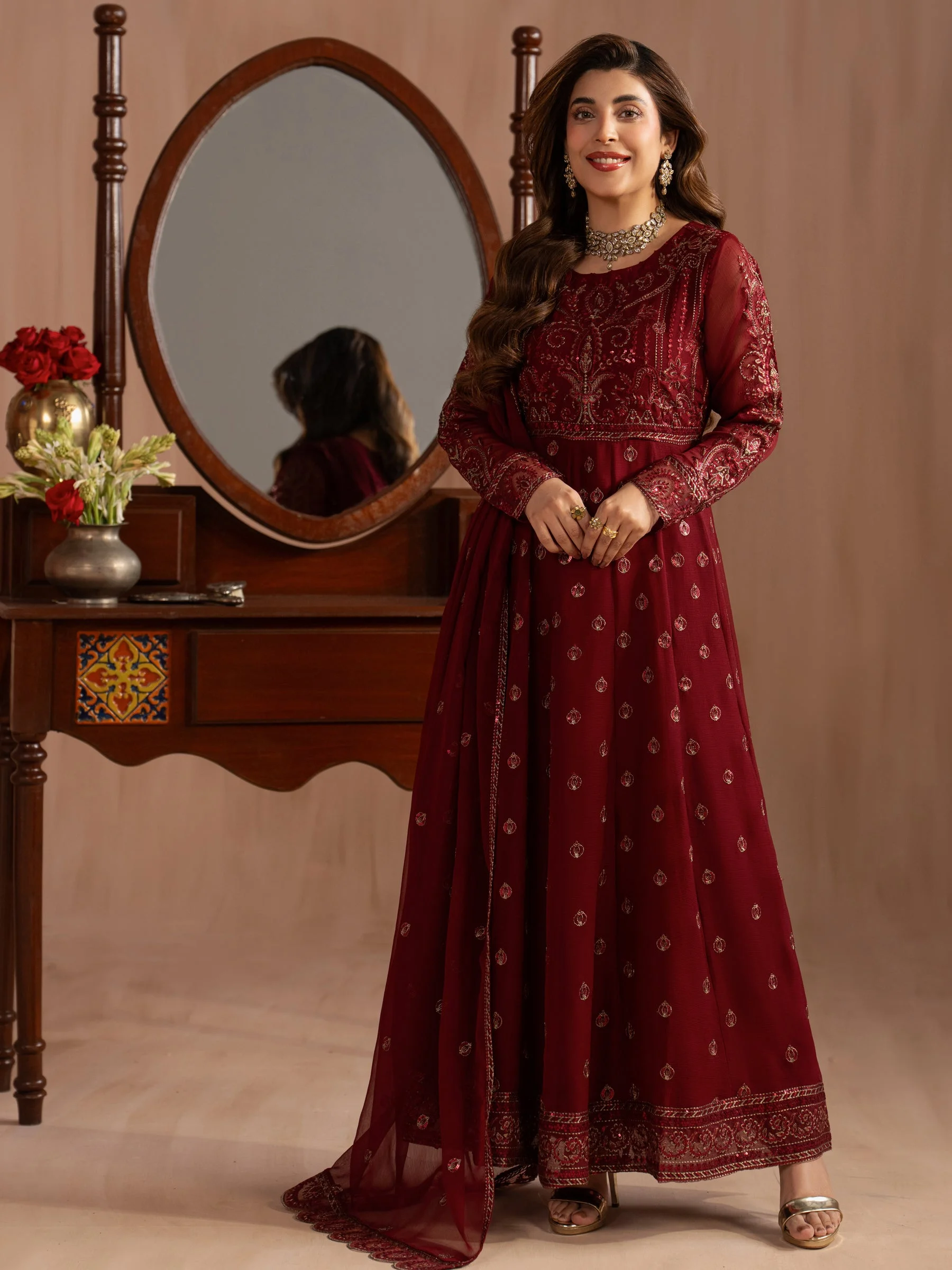 Pair this maxi with statement gold jhumkas and strappy heels for a classic formal look. Add a clutch in a complementary tone to complete the ensemble. Keep your makeup bold — a classic red or berry lip works beautifully against the richness of the embroidered chiffon. Whether styled traditionally or with a modern twist, this piece is endlessly versatile.