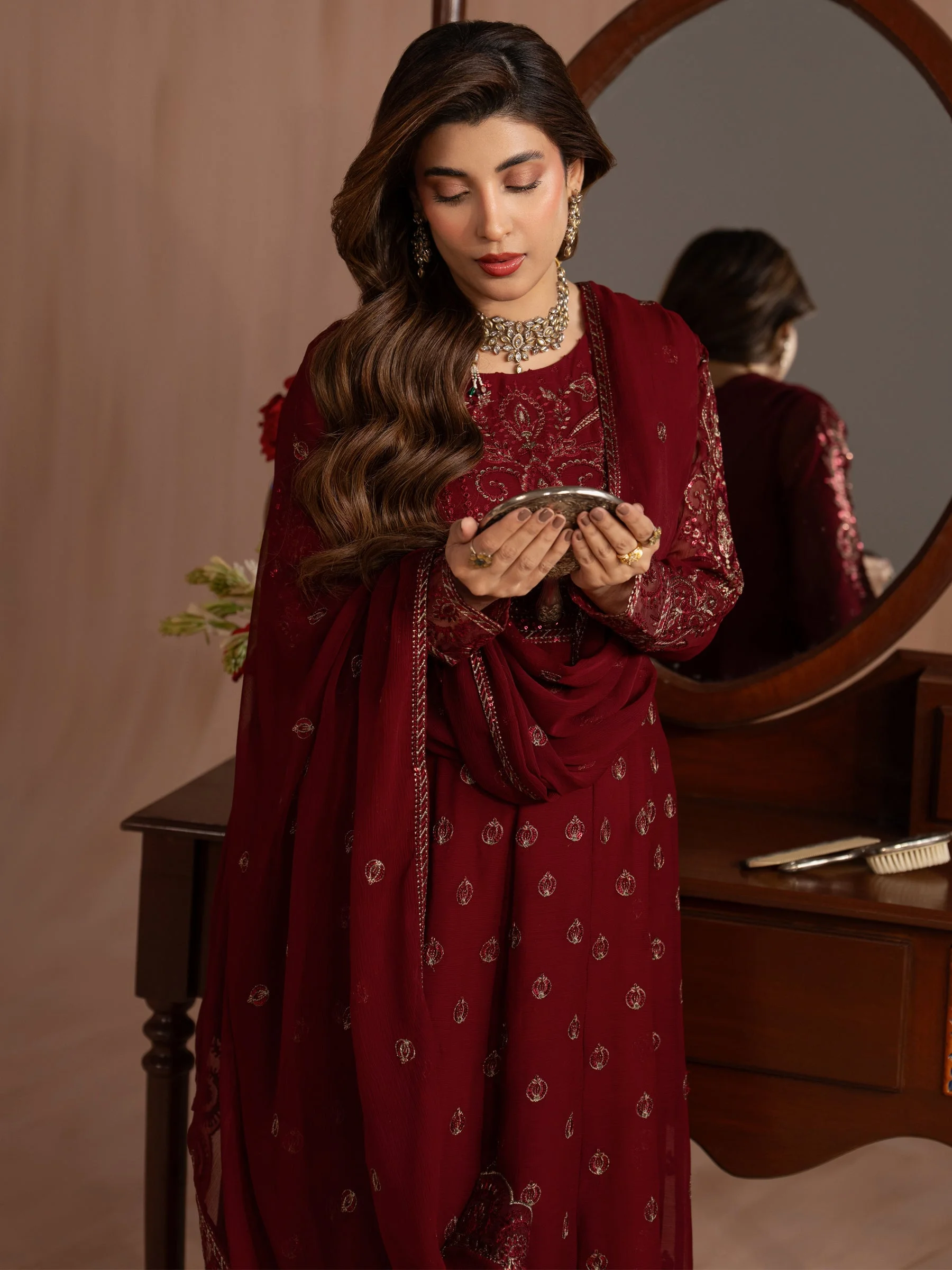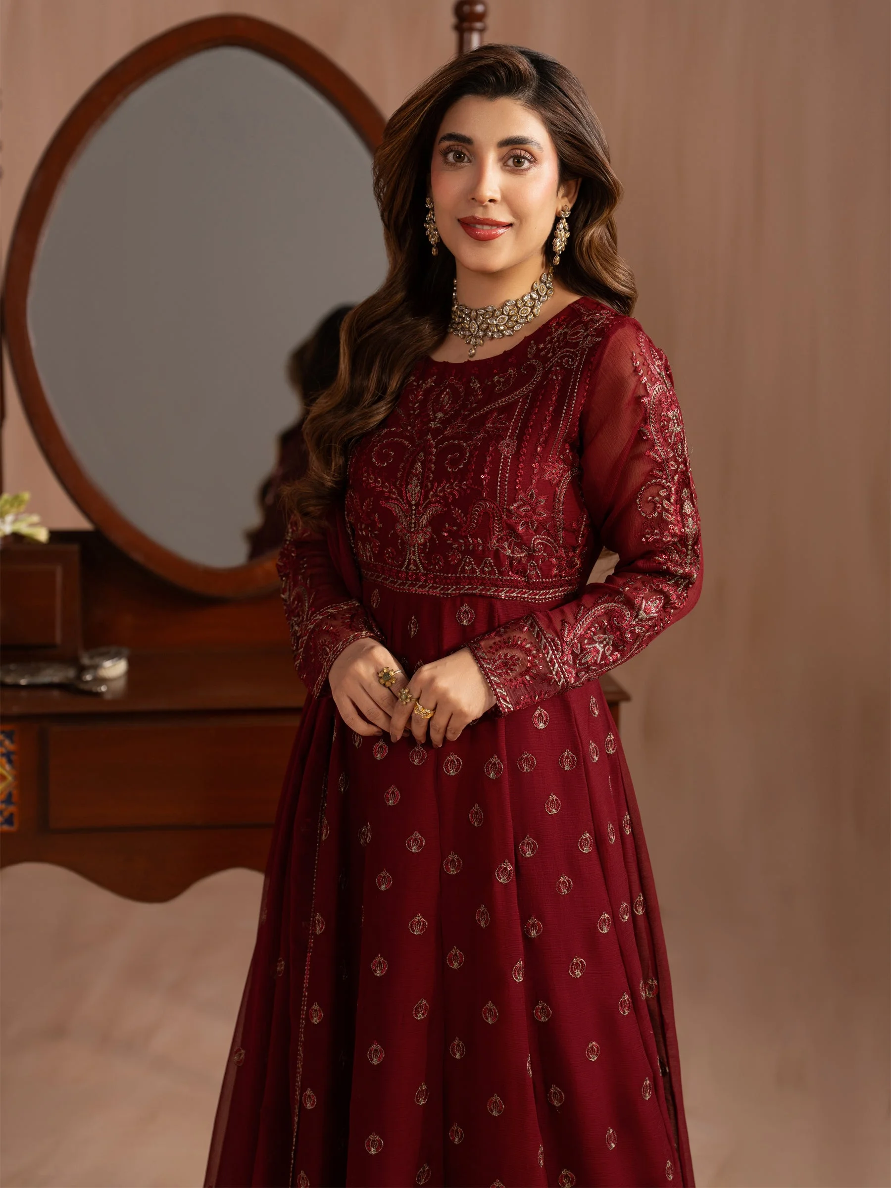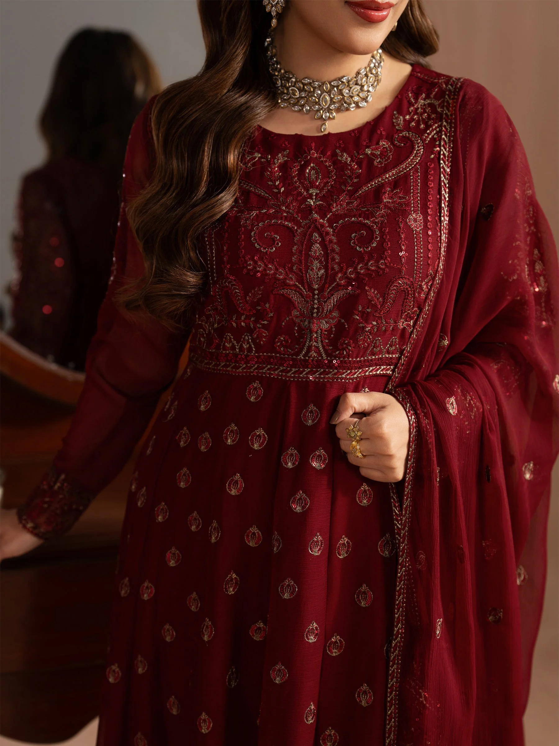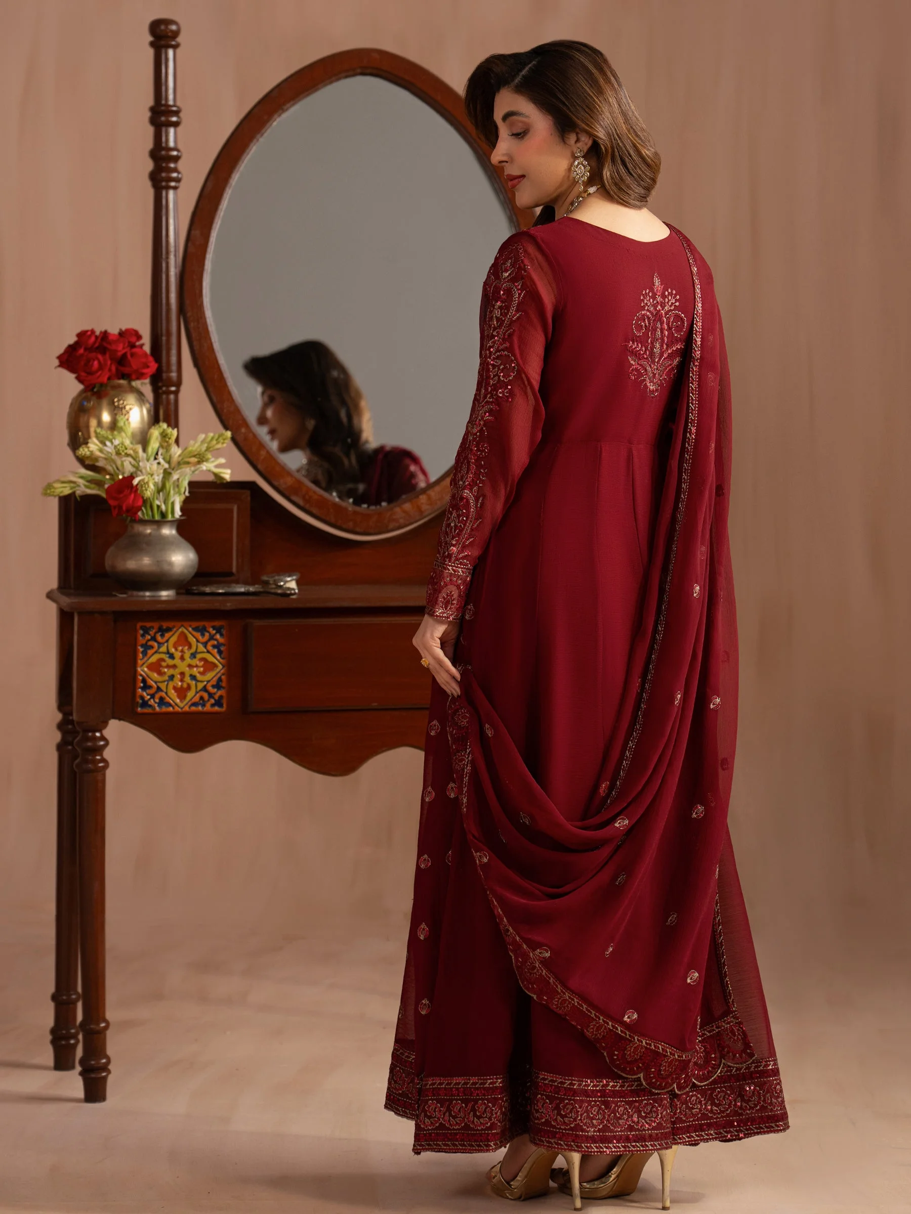 Pair this maxi with statement gold jhumkas and strappy heels for a classic formal look. Add a clutch in a complementary tone to complete the ensemble. Keep your makeup bold — a classic red or berry lip works beautifully against the richness of the embroidered chiffon. Whether styled traditionally or with a modern twist, this piece is endlessly versatile.