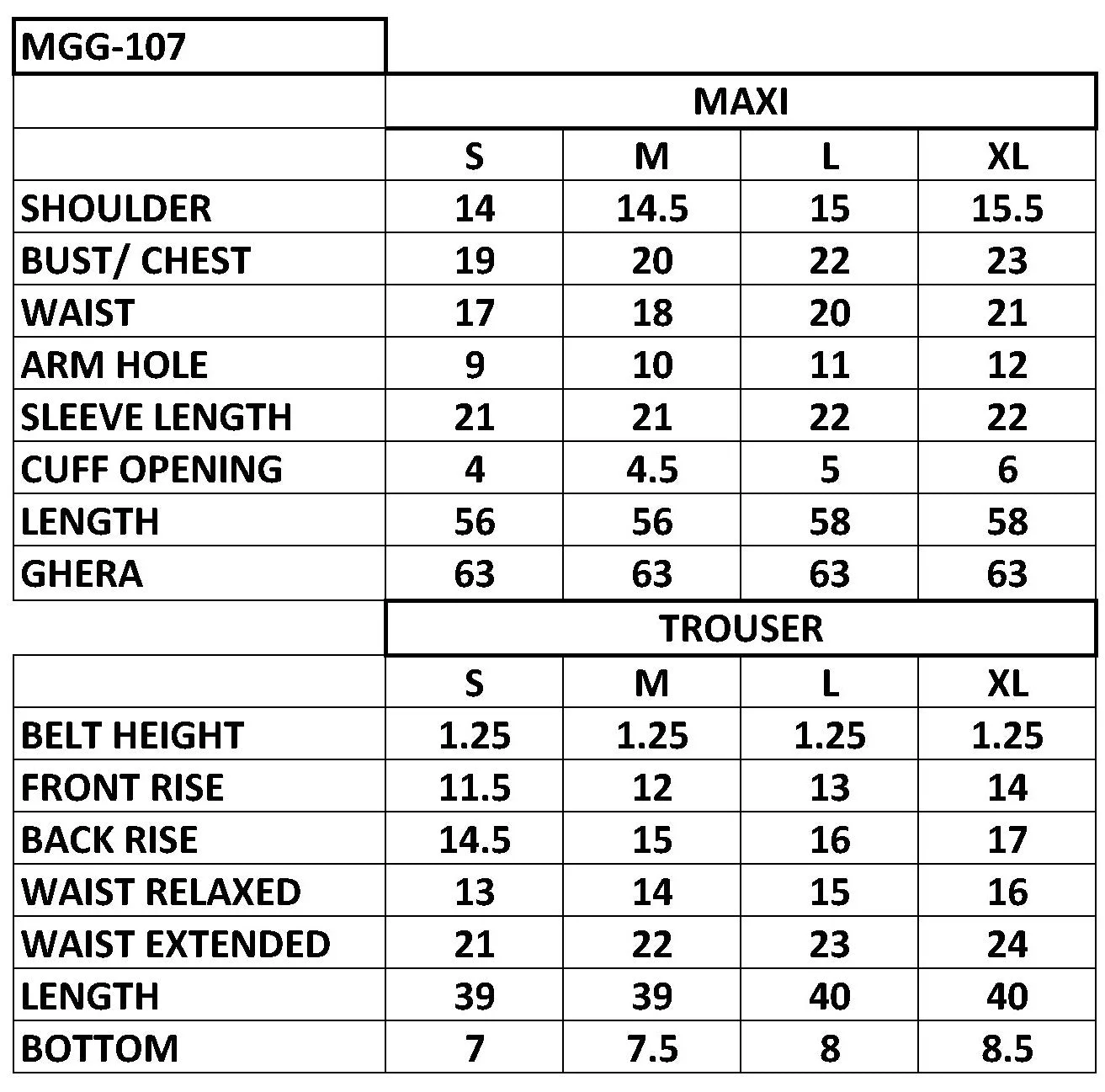| Ghera (inches) | 63 | 63 | 63 | 63 |
