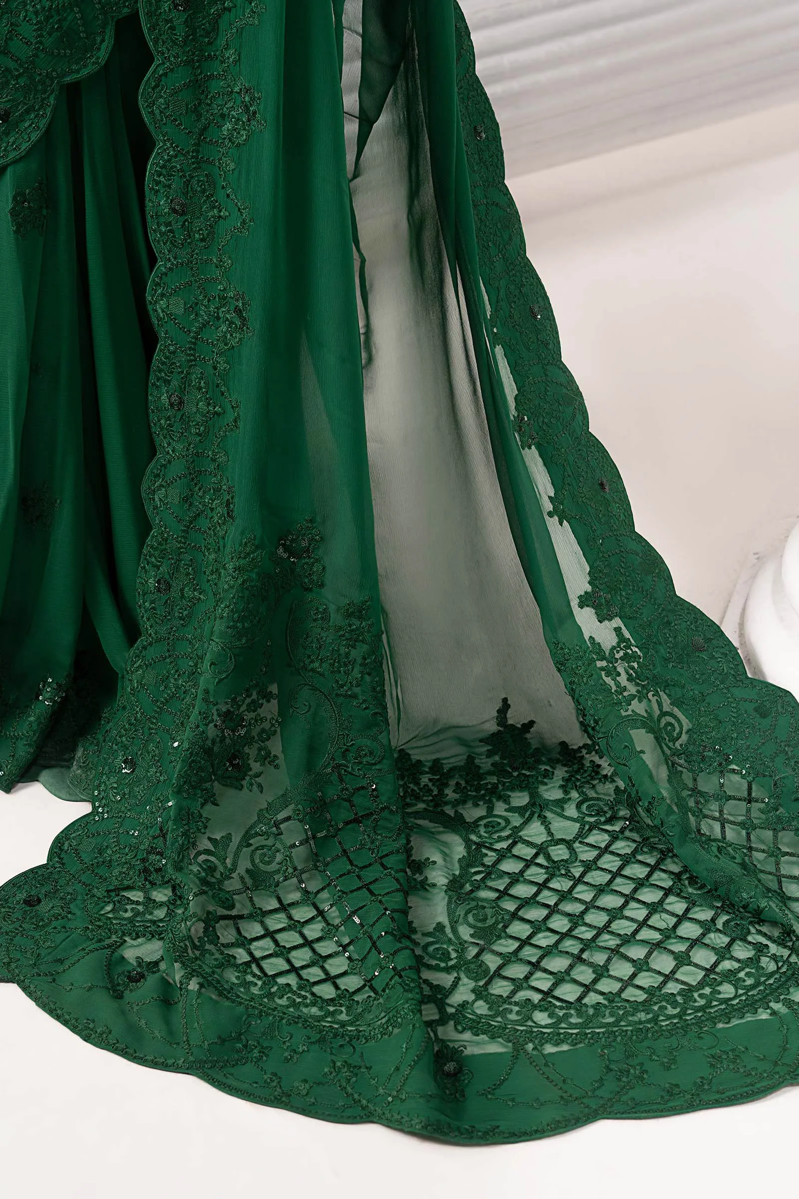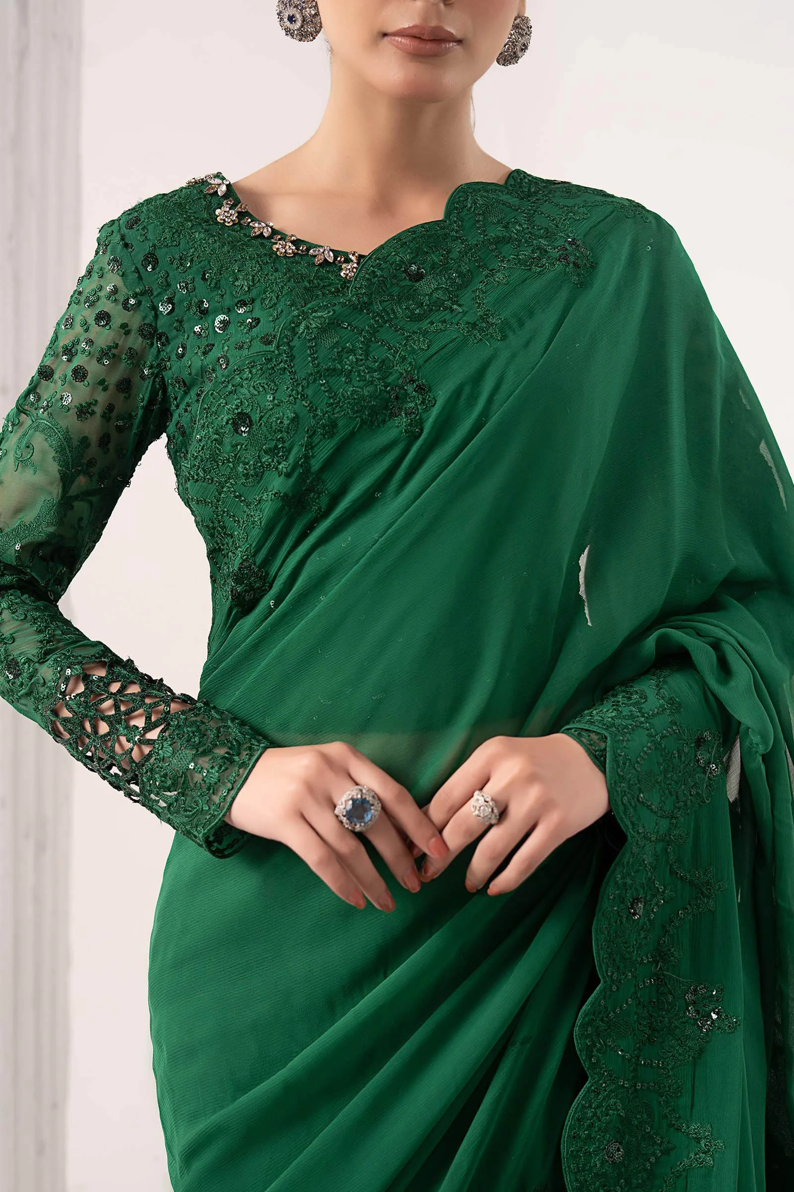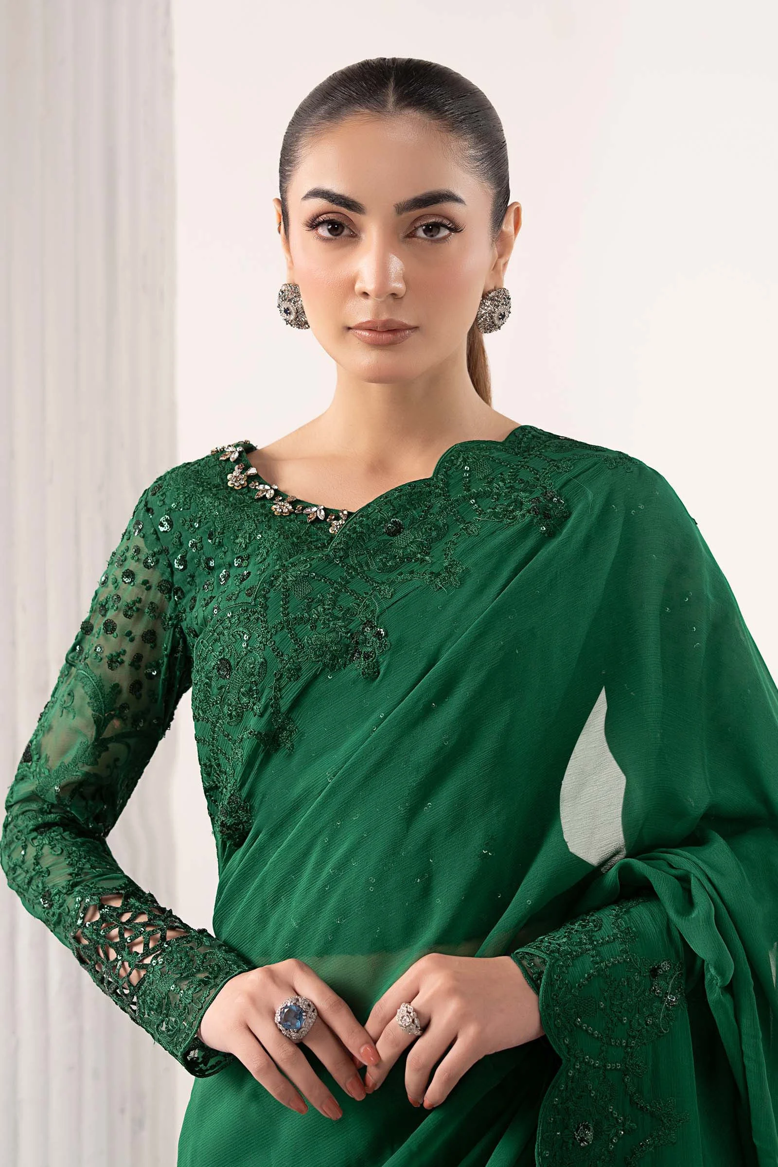 This breathtaking saree features delicate hand-guided embroidery across the chiffon drape, with ornate detailing that reflects the rich tradition of Pakistani craftsmanship. The rich emerald green hue is universally flattering and radiates regal charm at every formal occasion. The embroidered blouse is thoughtfully designed to complement the saree’s elegance, creating a cohesive and polished silhouette.