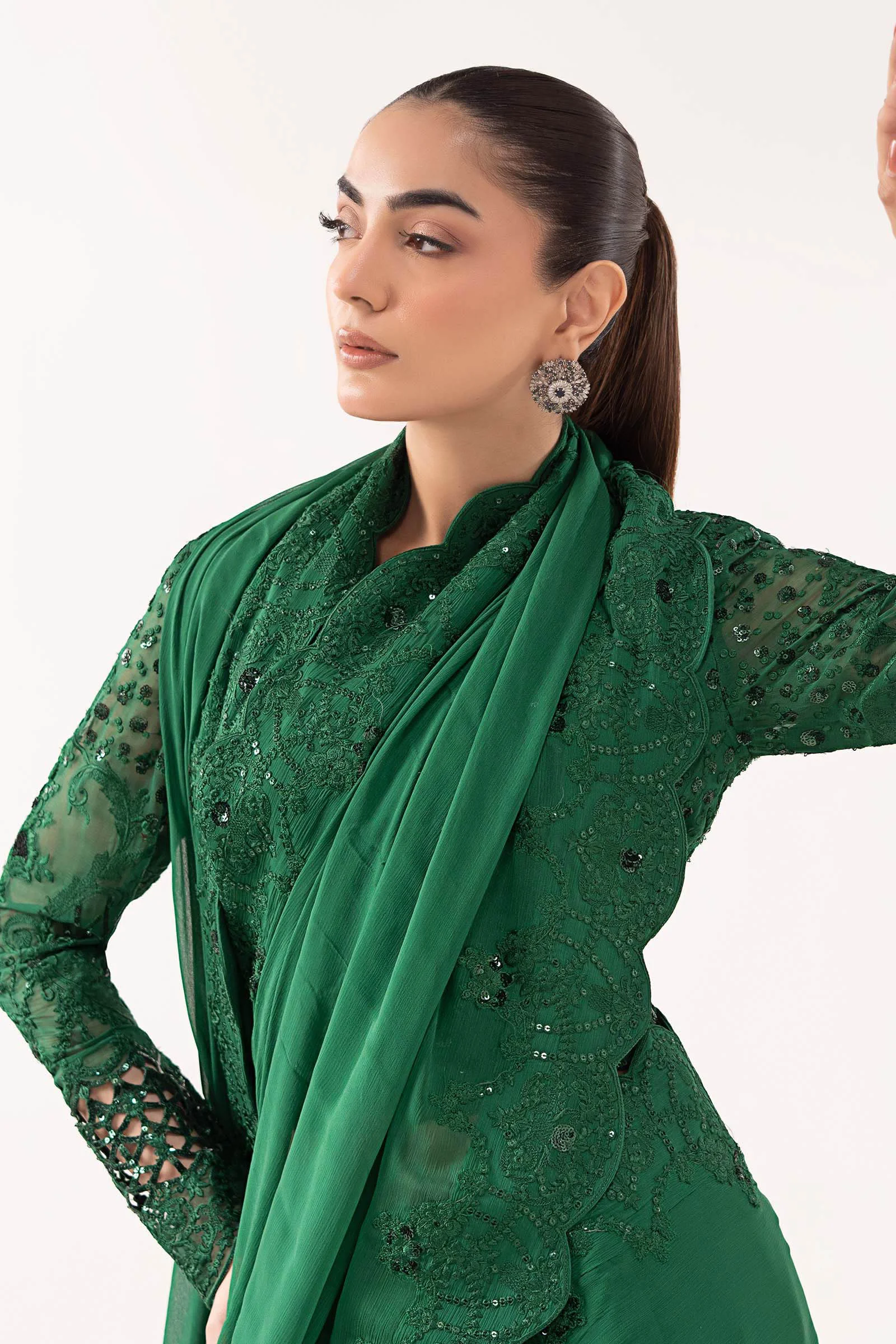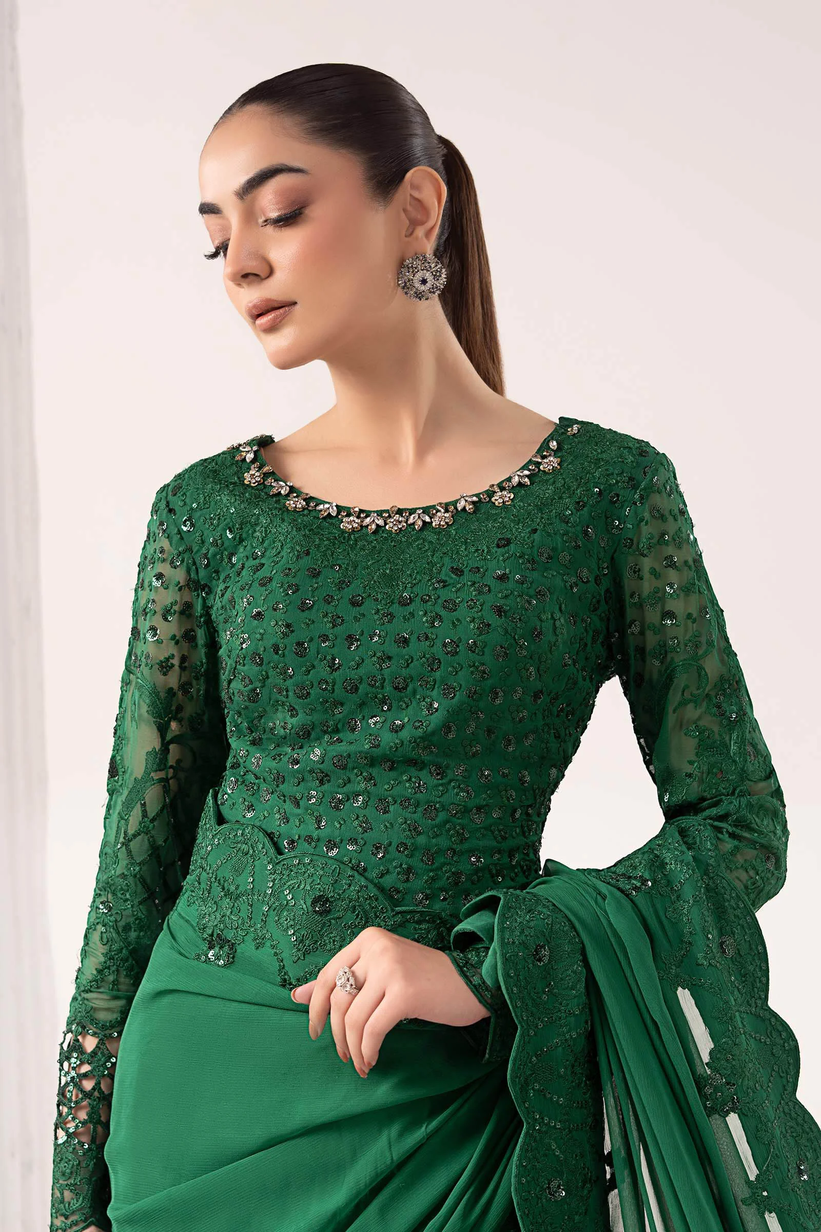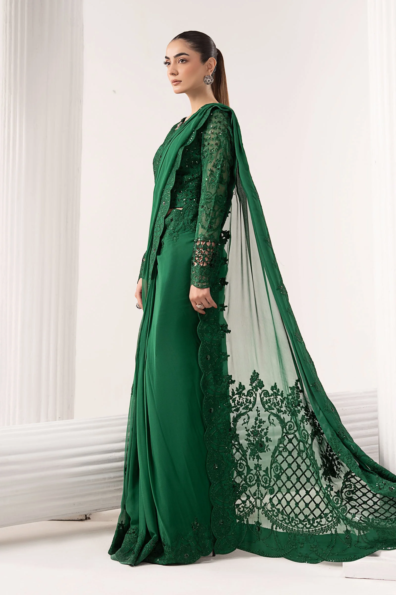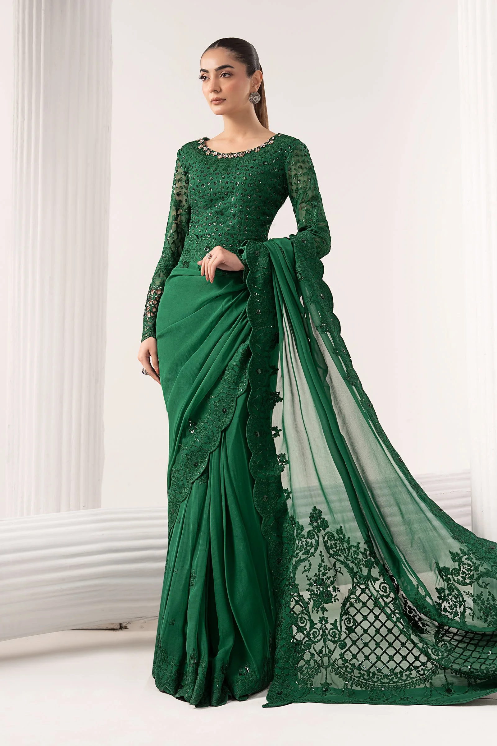 This breathtaking saree features delicate hand-guided embroidery across the chiffon drape, with ornate detailing that reflects the rich tradition of Pakistani craftsmanship. The rich emerald green hue is universally flattering and radiates regal charm at every formal occasion. The embroidered blouse is thoughtfully designed to complement the saree’s elegance, creating a cohesive and polished silhouette.
