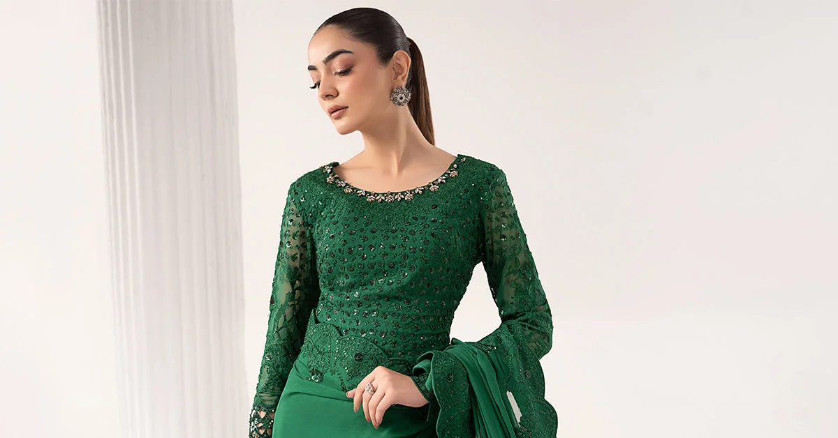 Elevate your wardrobe with the Zilverah Embroidered Chiffon Saree — a masterpiece in luxury formal wear that captures the essence of Pakistani elegance. Designed for the woman who commands attention at every gathering, this stunning green saree blends refined craftsmanship with sophisticated style, making it the perfect choice for brides, wedding guests, and festive celebrations across Pakistan. Whether you’re shopping in Lahore, Karachi, or Islamabad, this exclusive piece is just a click away through our seamless Pakistani dress online shopping experience.