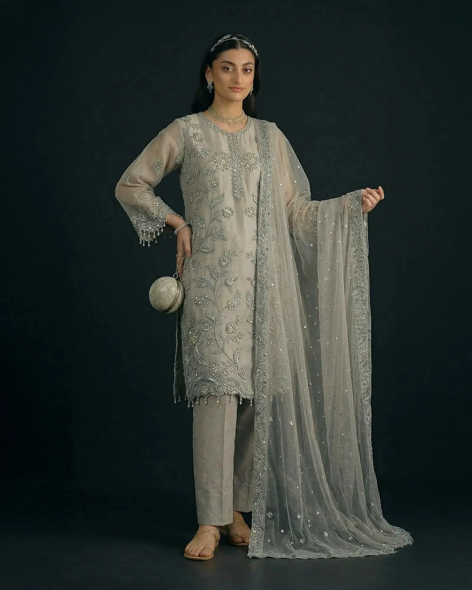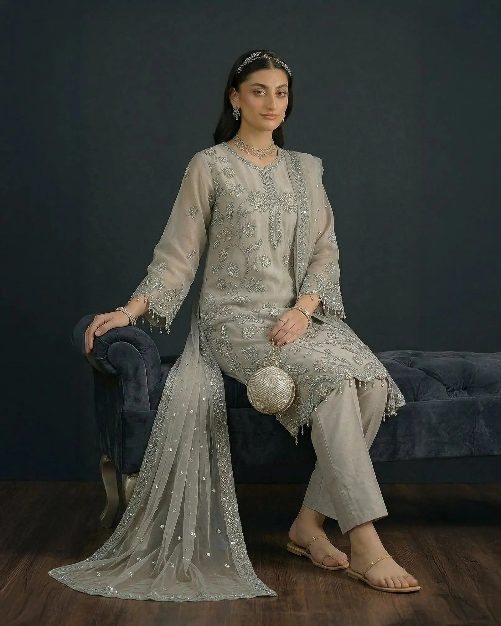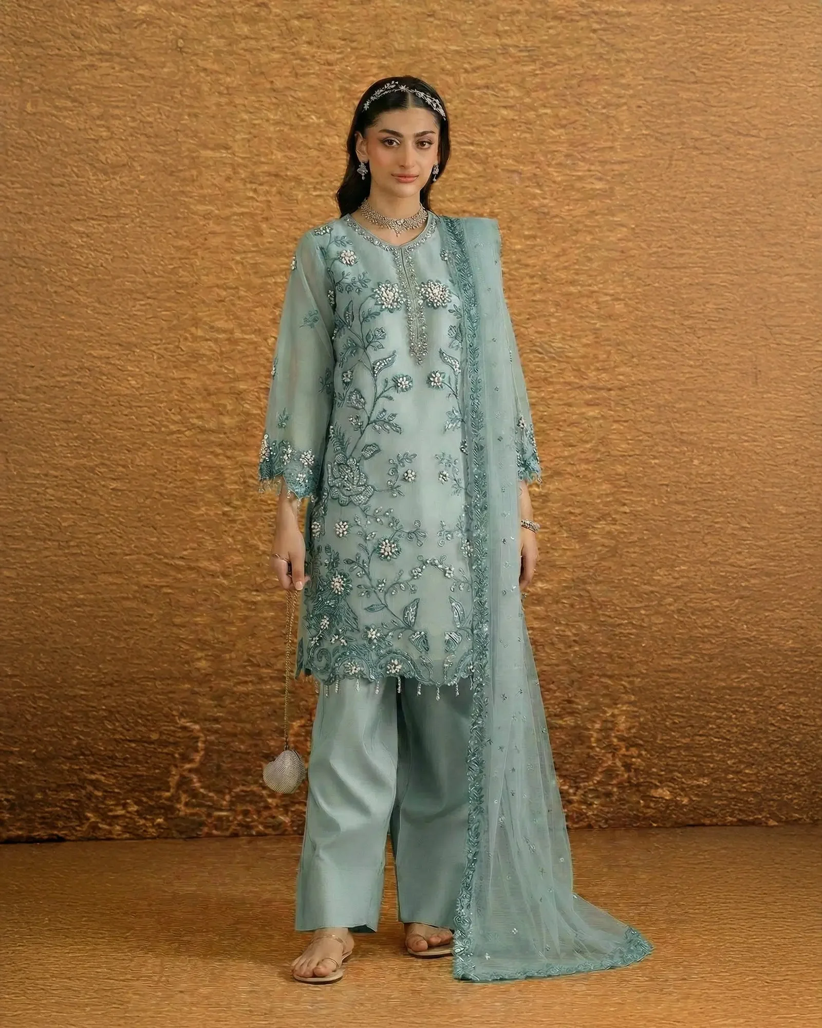Pair this organza suit with statement earrings and strappy heels for a polished bridal guest look. The Peach tone pairs beautifully with gold jewellery, while the Ferozi shade pops against silver or kundan accessories. The Grey is an ultra-versatile choice that works equally well for formal daytime events and evening soirees. Finish the look with a clutch in a complementary nude or metallic tone.