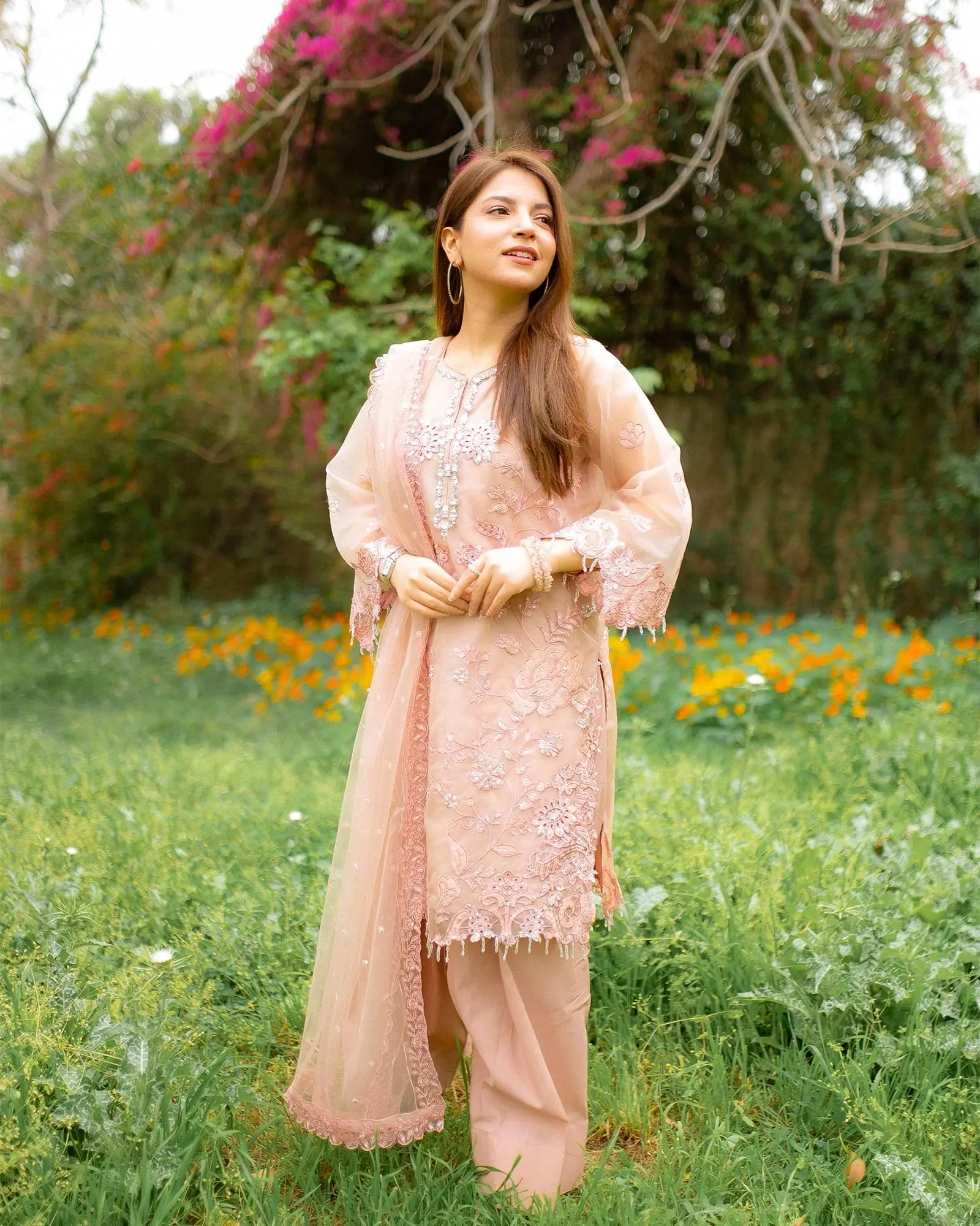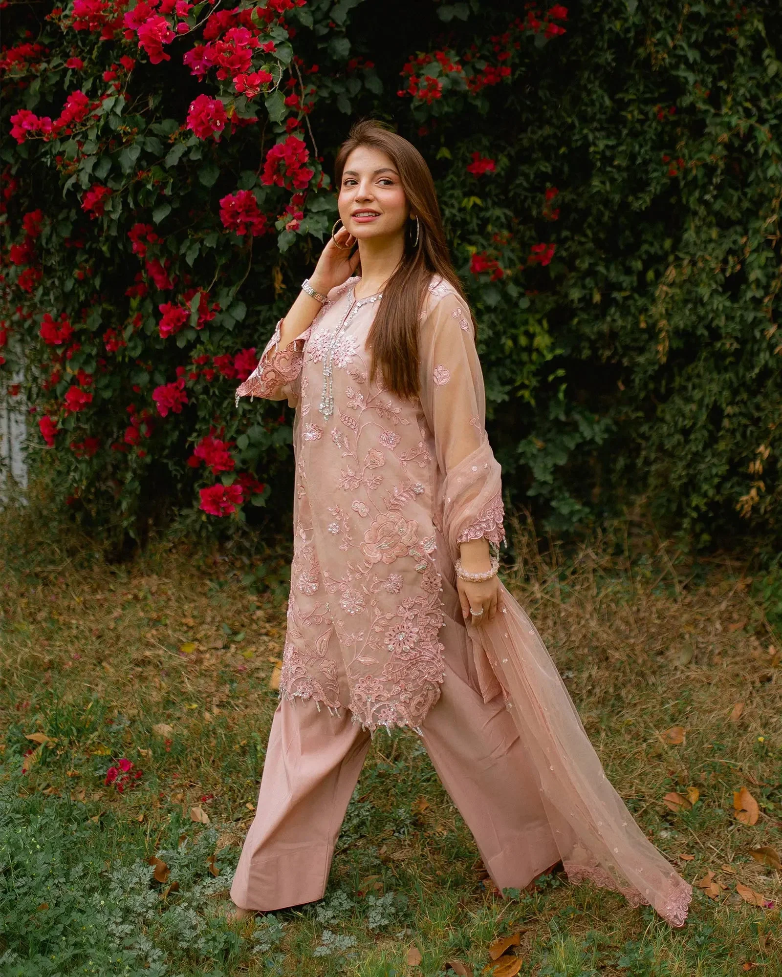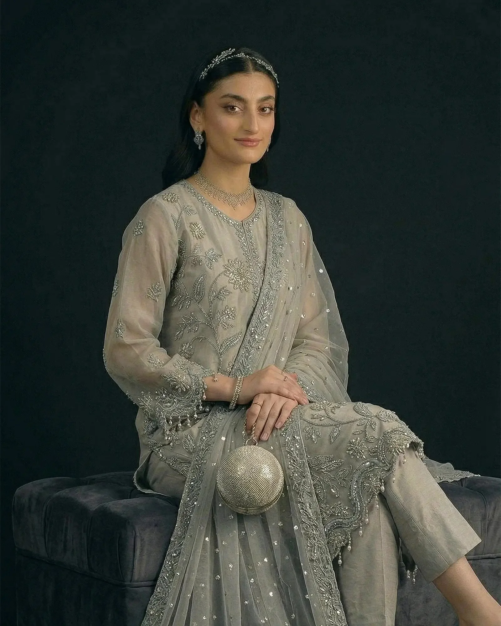 Pair this organza suit with statement earrings and strappy heels for a polished bridal guest look. The Peach tone pairs beautifully with gold jewellery, while the Ferozi shade pops against silver or kundan accessories. The Grey is an ultra-versatile choice that works equally well for formal daytime events and evening soirees. Finish the look with a clutch in a complementary nude or metallic tone.