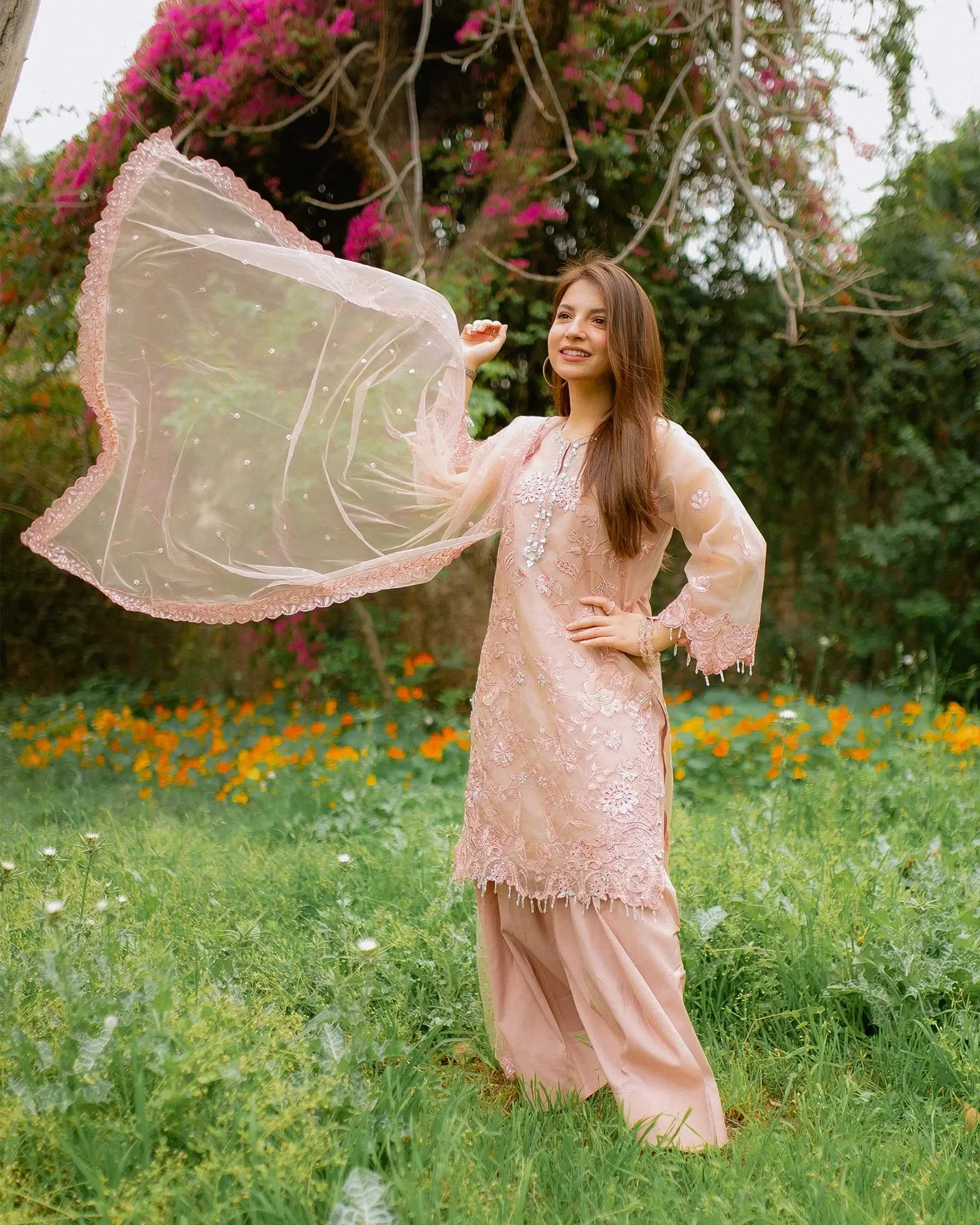 The embroidered organza shirt is the centerpiece of this stunning outfit, featuring delicate, finely worked embellishments that catch the light beautifully. The intricate threadwork adds depth and luxury to the ensemble, making it a true showstopper at any event. The clean, flowing silhouette flatters a wide range of body types and complements the overall regal aesthetic of this formal wear collection.