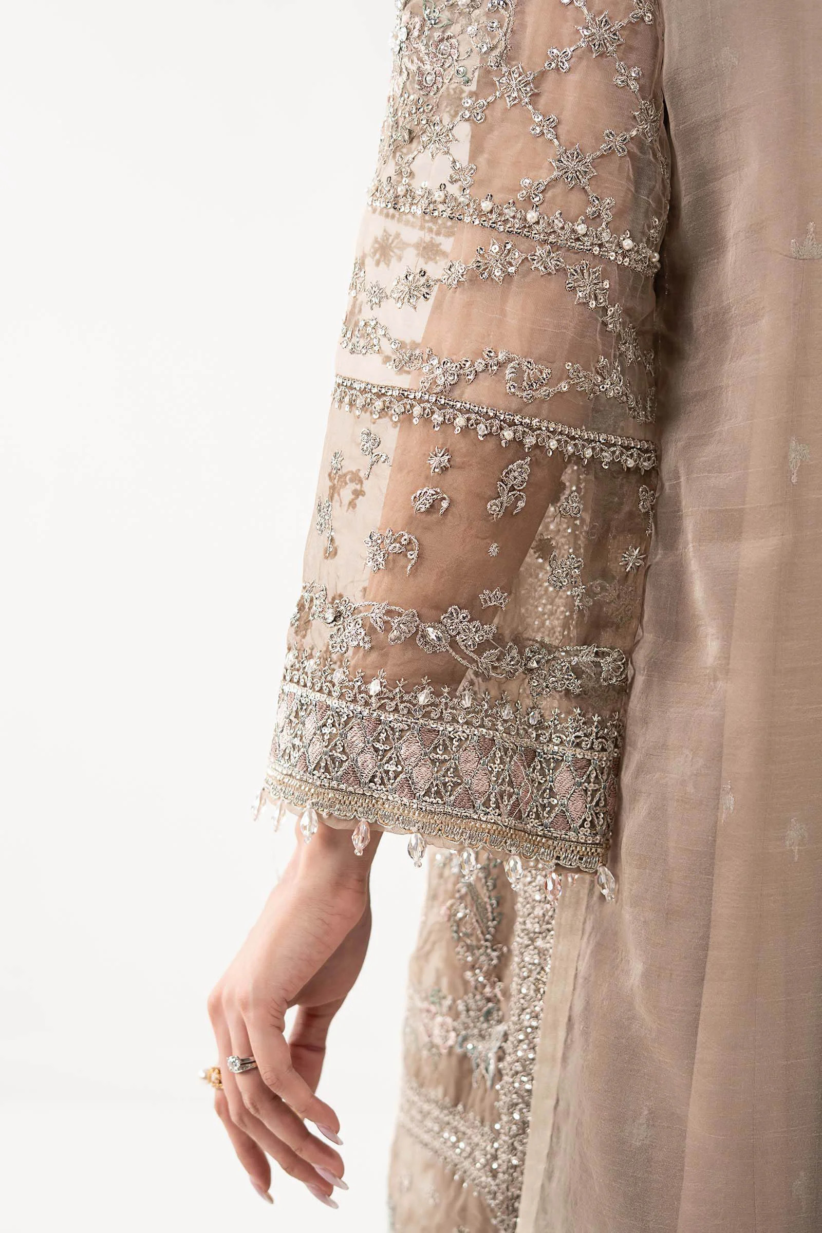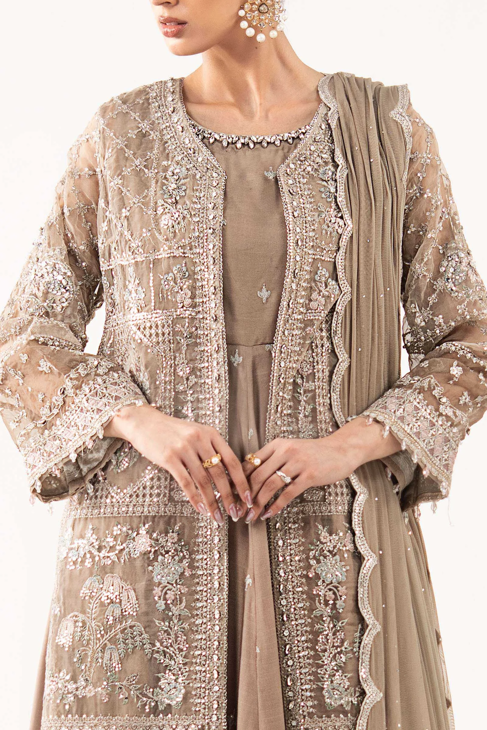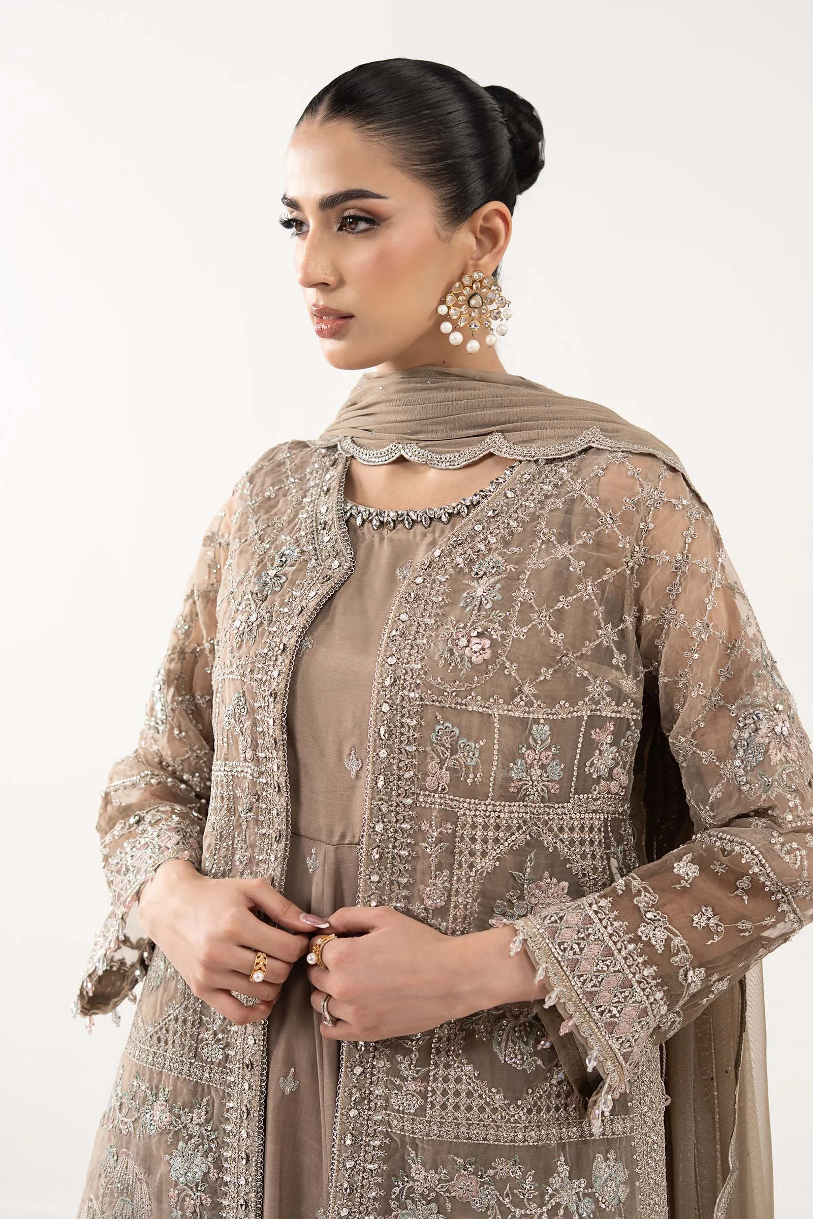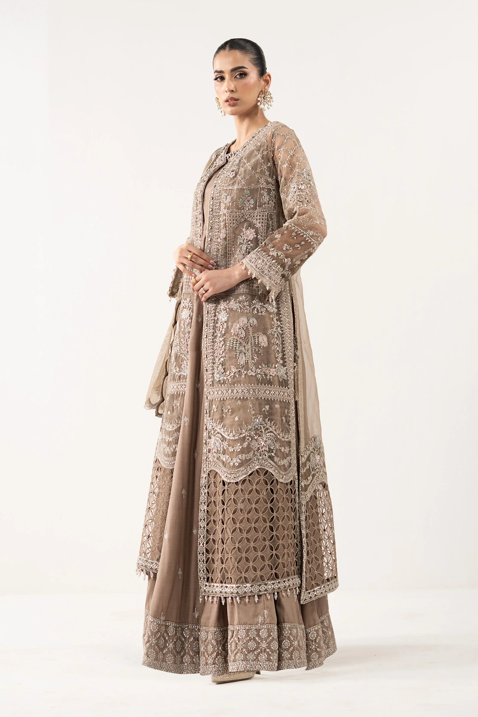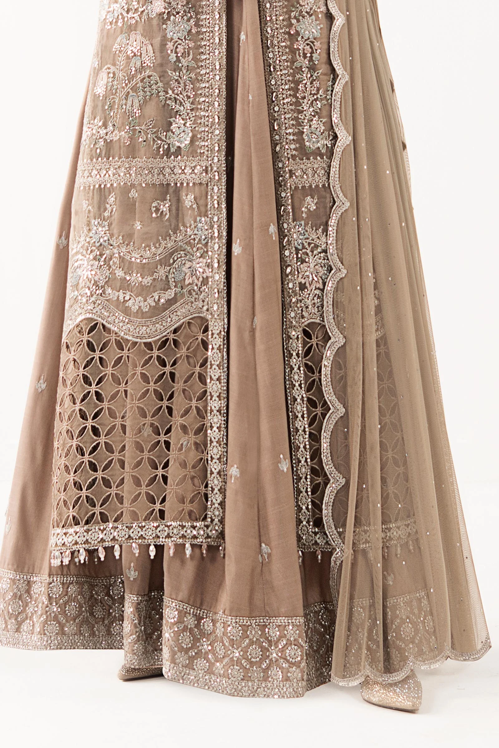 This stunning 3-piece suit features a beautifully embroidered front-open organza jacket paired with a graceful sleeveless raw silk frock. The jacket’s intricate embroidery work runs along the hemline and neckline, creating a regal layered look that is both modern and rooted in traditional Pakistani aesthetic. The warm coffee tone adds a sophisticated, understated glamour perfect for day-to-evening transitions.
