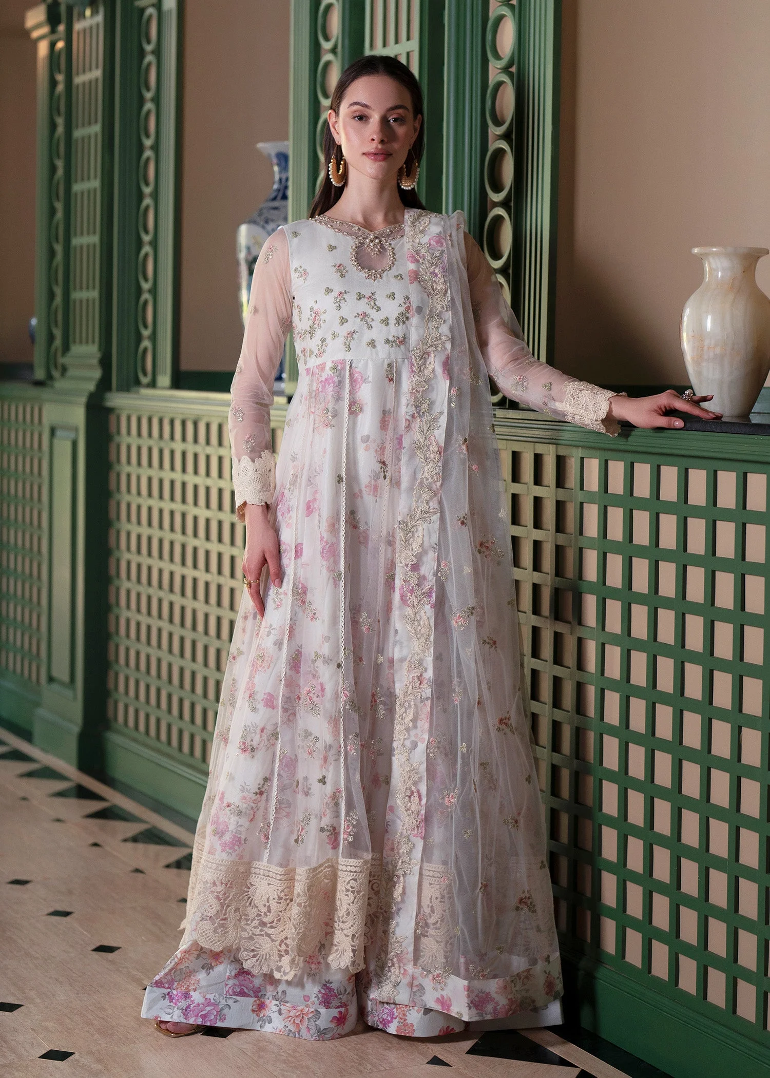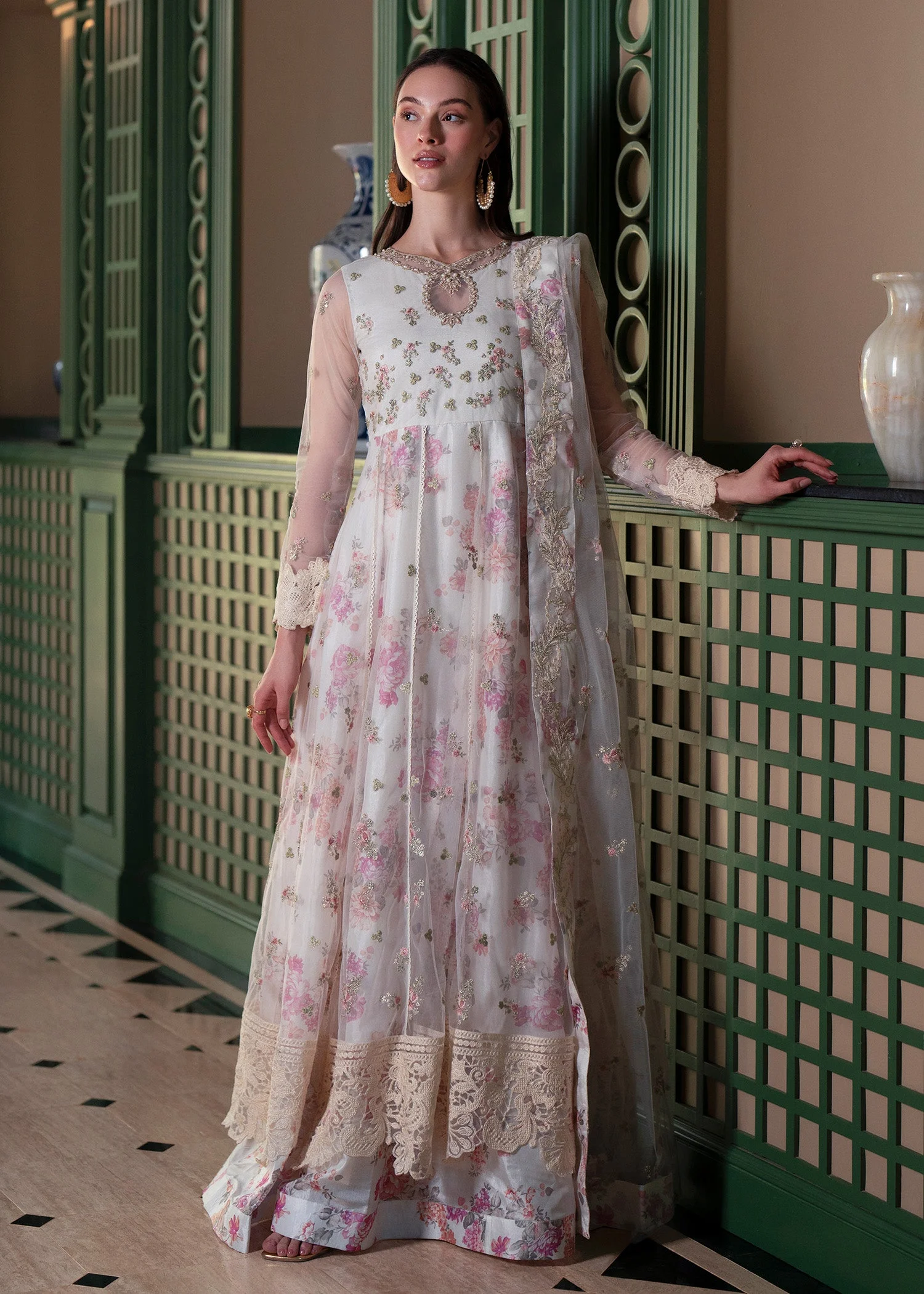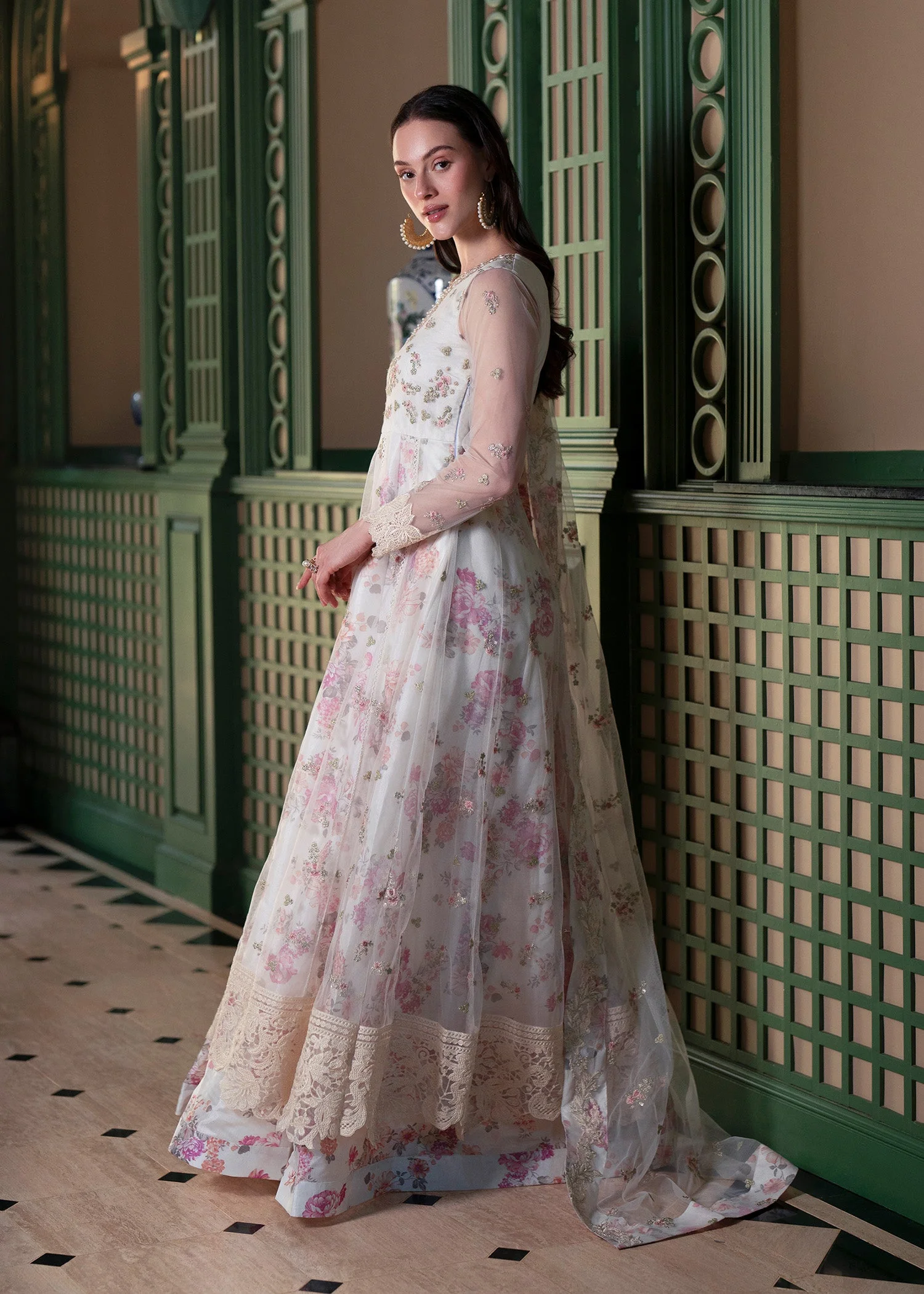 Discover the Kiara Embroidered Printed Gown by Zilverah — a breathtaking fusion of intricate all-over embroidery, a delicate floral print, and a beautifully crafted neckline that radiates pure elegance. Paired with an embroidered net dupatta, this ethereal party wear ensemble is your go-to choice for Eid celebrations, weddings, and festive occasions across Pakistan. Order now at PKR 34,000 and enjoy free delivery across Pakistan on orders above PKR 10,000.
