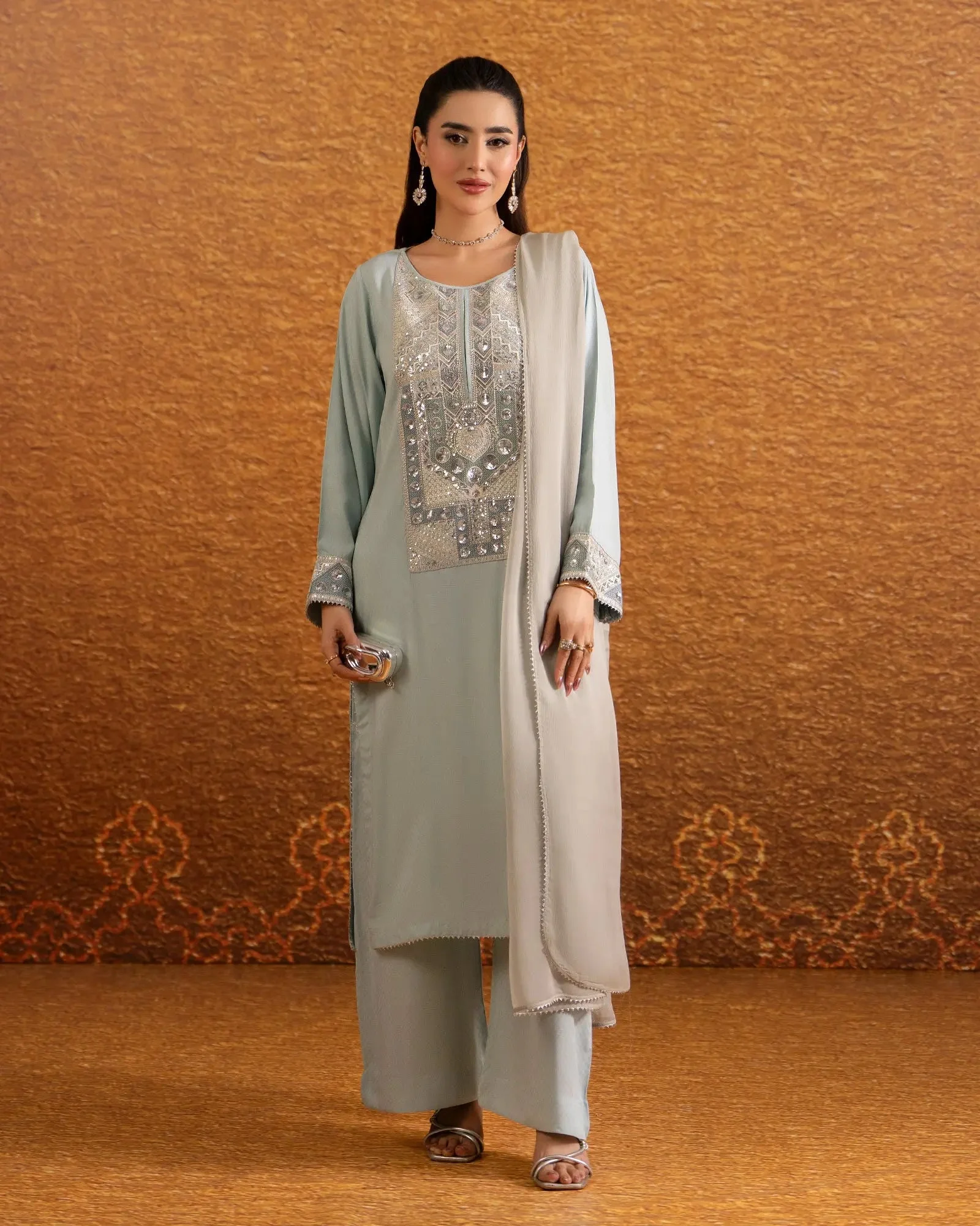 Elevate your wardrobe with the Zilverah Ferozi Dabbi Silk 3PC — a stunning formal wear ensemble crafted from luxurious imported Dabbi Silk, featuring intricate Tilla embroidery on the shirt and paired with an elegant Crinkle Chiffon dupatta. Perfect for weddings, Eid celebrations, and festive gatherings, this three-piece set delivers effortless grace and traditional charm. Order now for just PKR 17,000 and enjoy free delivery across Pakistan on orders above PKR 10,000.