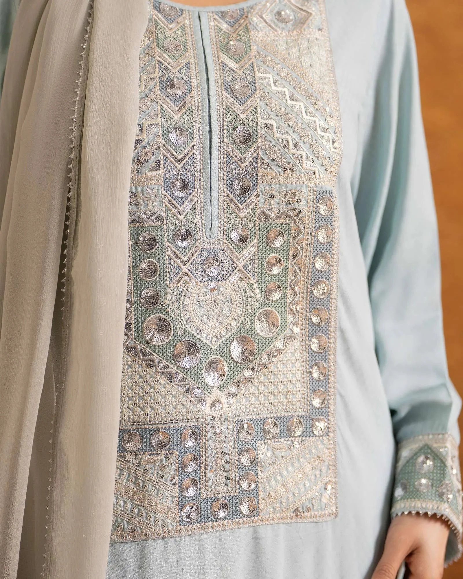 The centerpiece of this ensemble is the beautifully tailored Tilla embroidered shirt that showcases exquisite craftsmanship in a striking Ferozi hue. The fine embroidery adds a rich, festive character while maintaining an air of refinement suited for any upscale occasion. The silhouette is classic yet contemporary, making it an essential addition to your formal wear wardrobe.