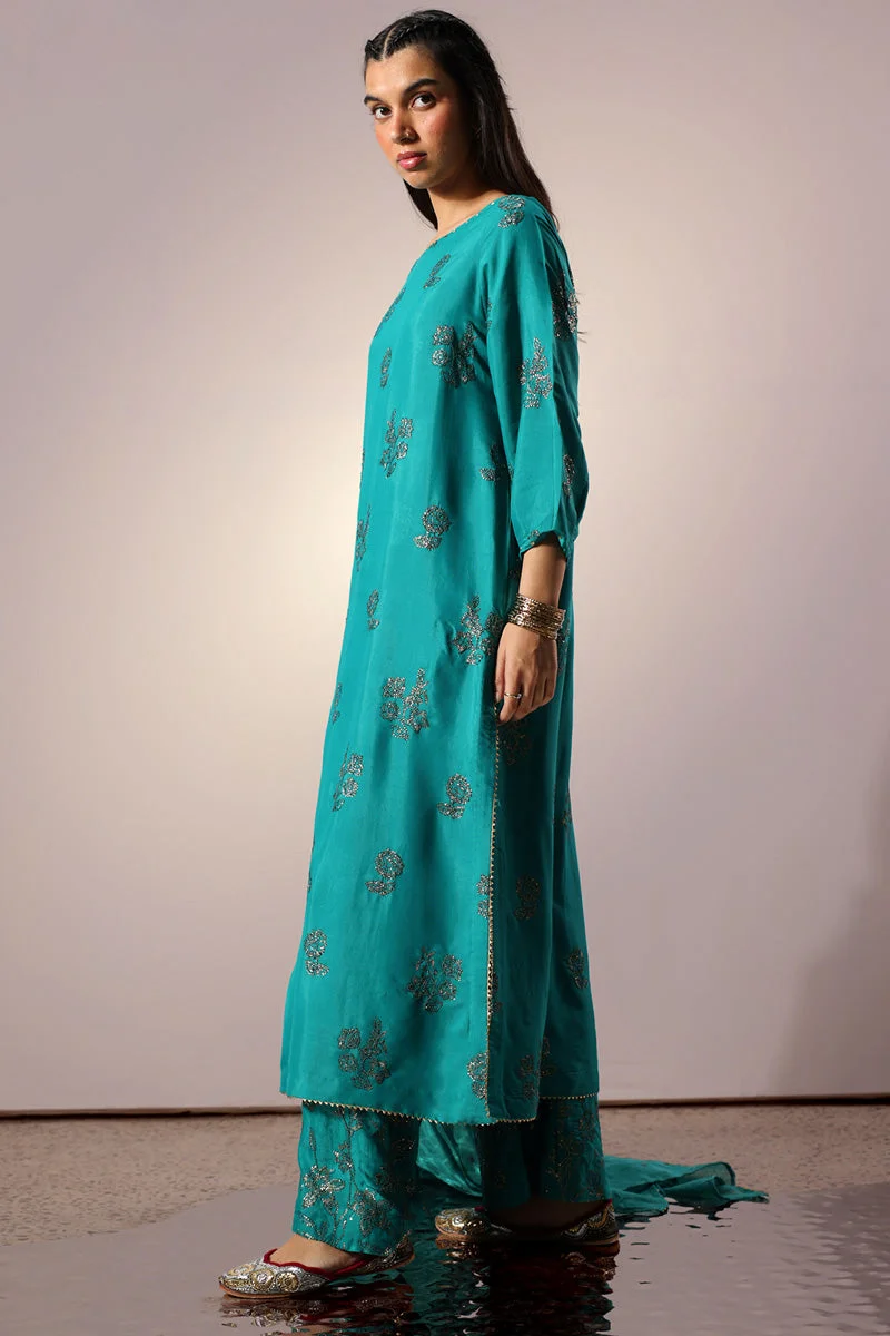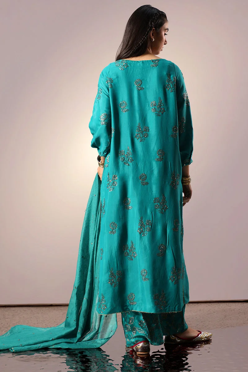 Pair this Ferozi suit with gold or antique jewellery to highlight the teal tones beautifully. Nude or metallic heels work best with the culotte silhouette, elongating the legs and adding polish to your overall look. Style the Cotton Net dupatta draped across one shoulder for a classic Pakistani formal aesthetic, or pin it at both ends for a structured bridal party look.