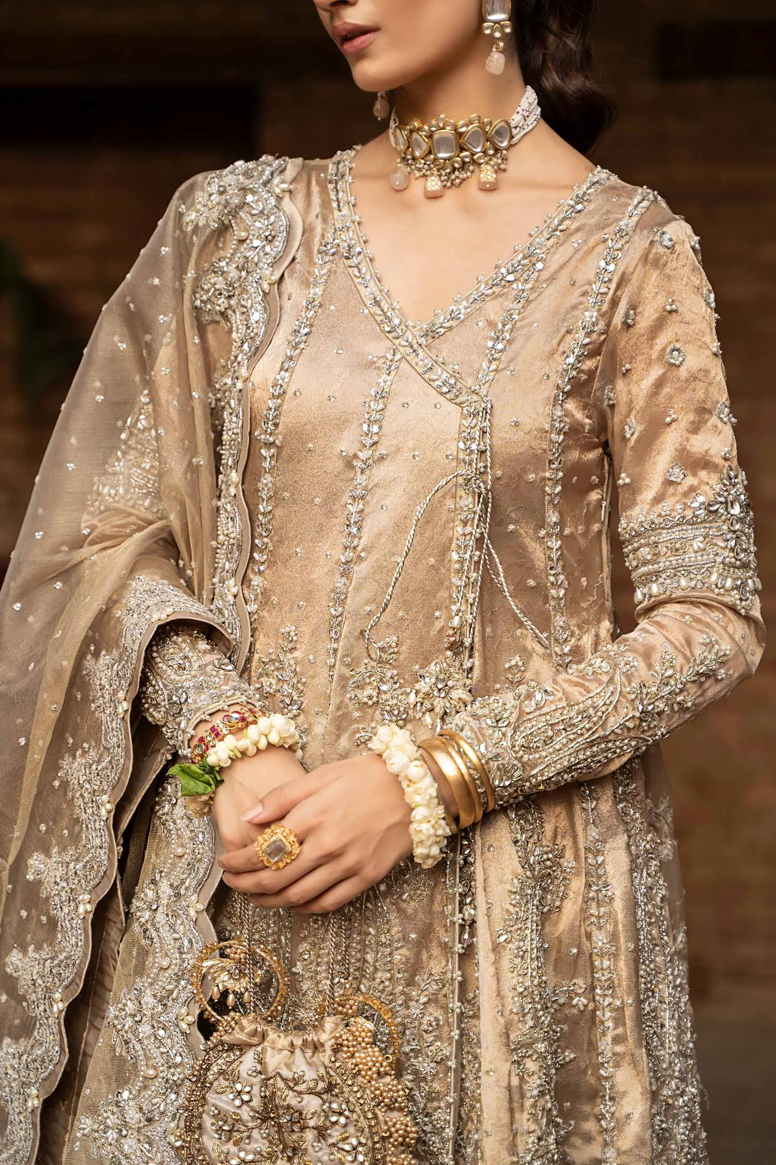 Pair this gold angrakha gharara with traditional jhumkas and a statement maang tikka for a bridal guest or event look. Opt for strappy heeled sandals in nude or gold to let the embroidery take center stage. Minimal makeup with a bold lip completes this look for women in Lahore, Karachi, and beyond who love authentic Pakistani fashion.