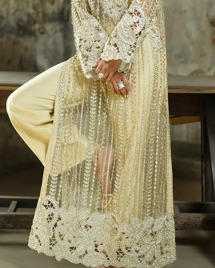This breathtaking 3-piece set is a celebration of classic Pakistani craftsmanship elevated with contemporary silhouettes. The straight-cut embroidered net shirt features intricate golden embroidery across the bodice and hemline, creating a rich, regal appearance that catches the light beautifully. Paired with wide-leg raw silk trousers in a complementary golden tone, the silhouette is both graceful and modern. The look is completed with a delicate organza dupatta adorned with subtle embellishments for a truly polished finish.