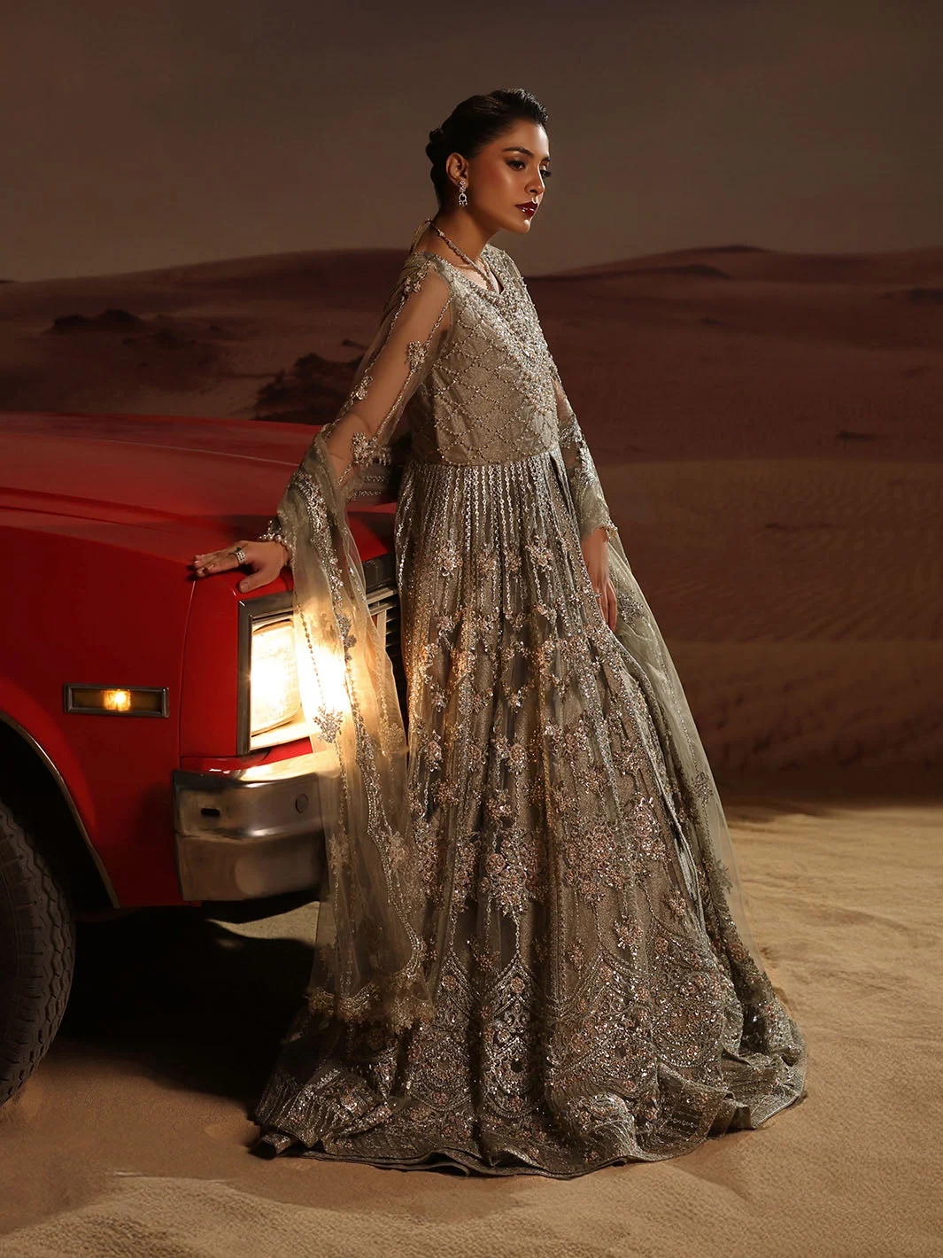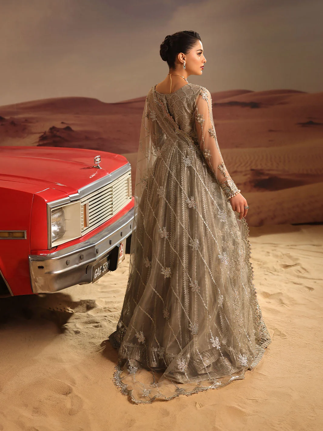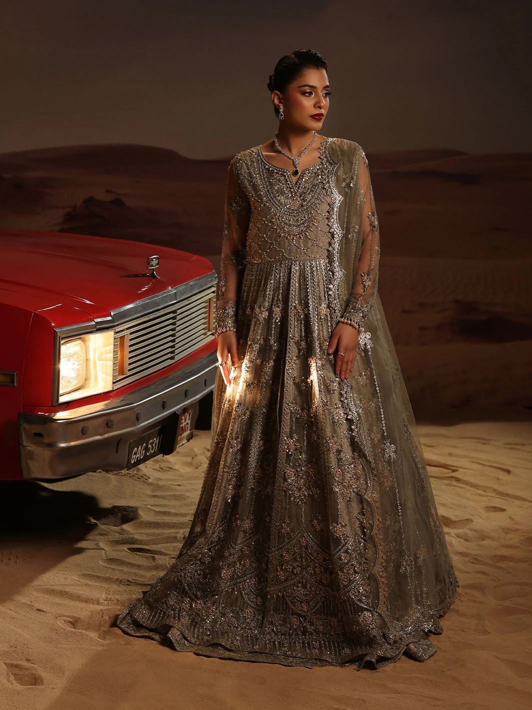 Pair this gray luxury maxi with silver jhumkas and a delicate maang tikka for a bridal guest look that steals the spotlight. Opt for nude or silver strappy heels to let the dress take center stage. A subtle smoky eye and soft contour will complement the muted elegance of the gray palette. Women in Lahore, Karachi, and Islamabad are already styling this piece as their go-to for luxury formal events — now it is your turn.