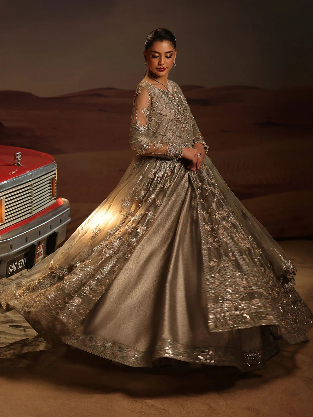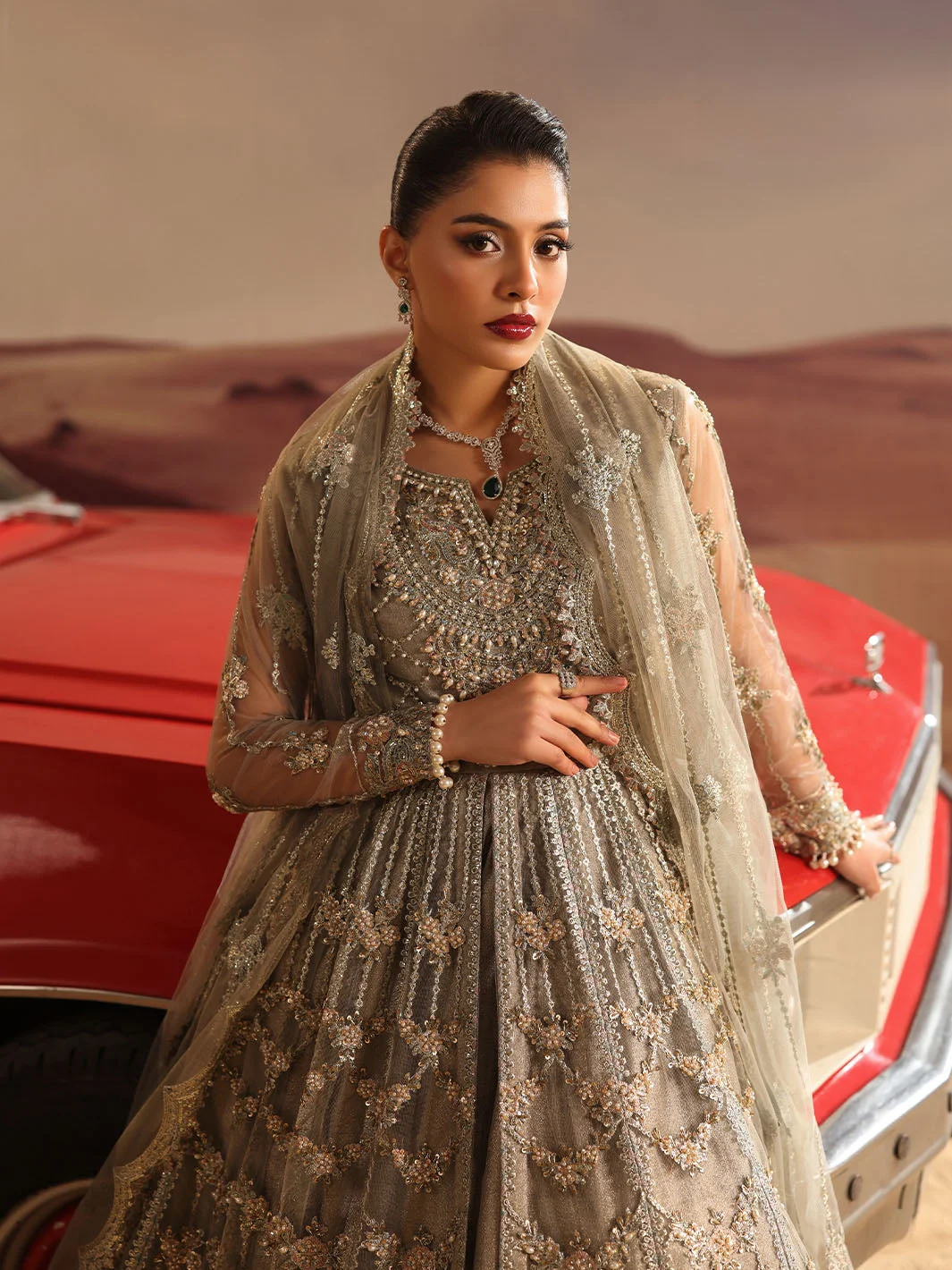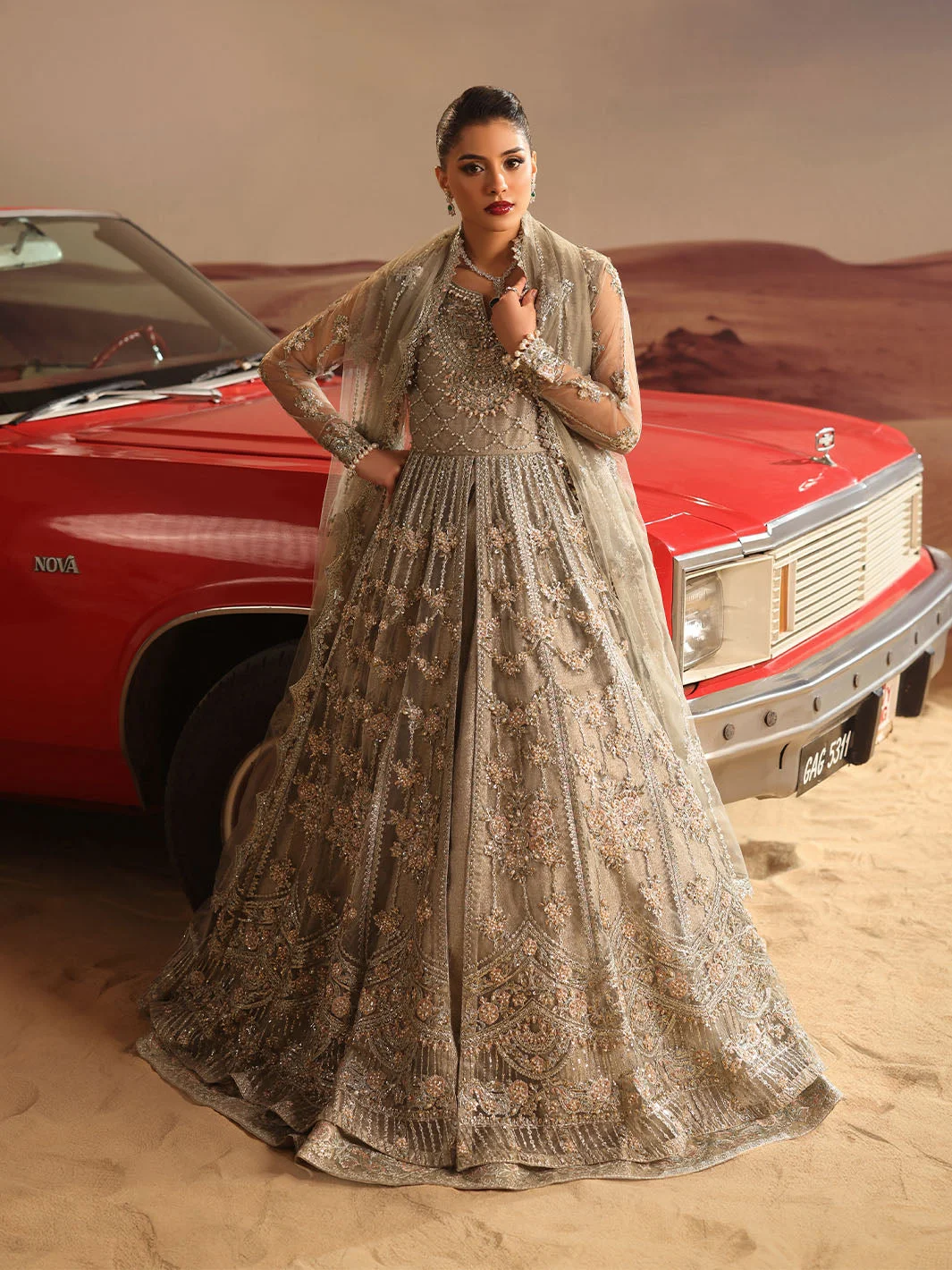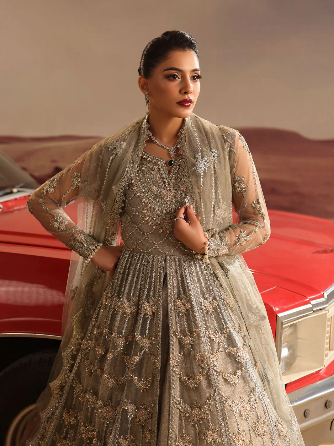 Pair this gray luxury maxi with silver jhumkas and a delicate maang tikka for a bridal guest look that steals the spotlight. Opt for nude or silver strappy heels to let the dress take center stage. A subtle smoky eye and soft contour will complement the muted elegance of the gray palette. Women in Lahore, Karachi, and Islamabad are already styling this piece as their go-to for luxury formal events — now it is your turn.
