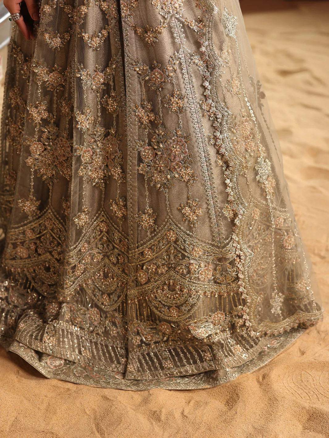 This opulent maxi is a celebration of intricate artistry. The outer maxi is adorned with elaborate adda work embellishments across premium net fabric, creating a richly textured surface that catches light beautifully. The tonal gray palette lends a sophisticated, timeless charm — making it ideal for weddings, formal events, and bridal functions where understated luxury speaks the loudest. Every detail, from the neckline to the hem, is meticulously finished to reflect luxury pret standards.