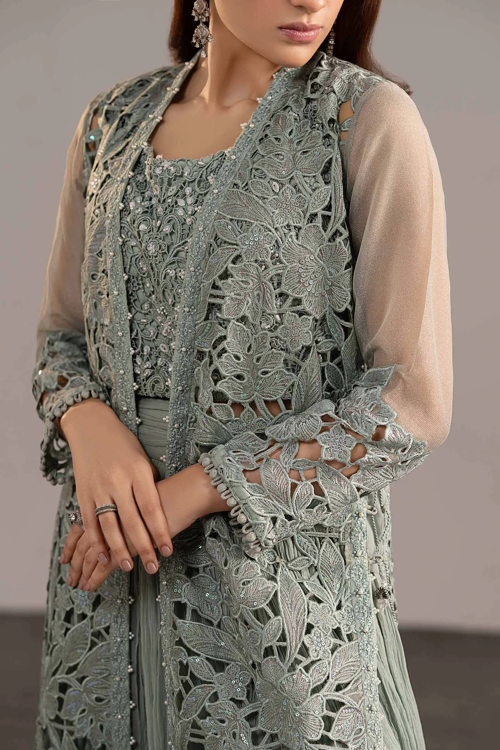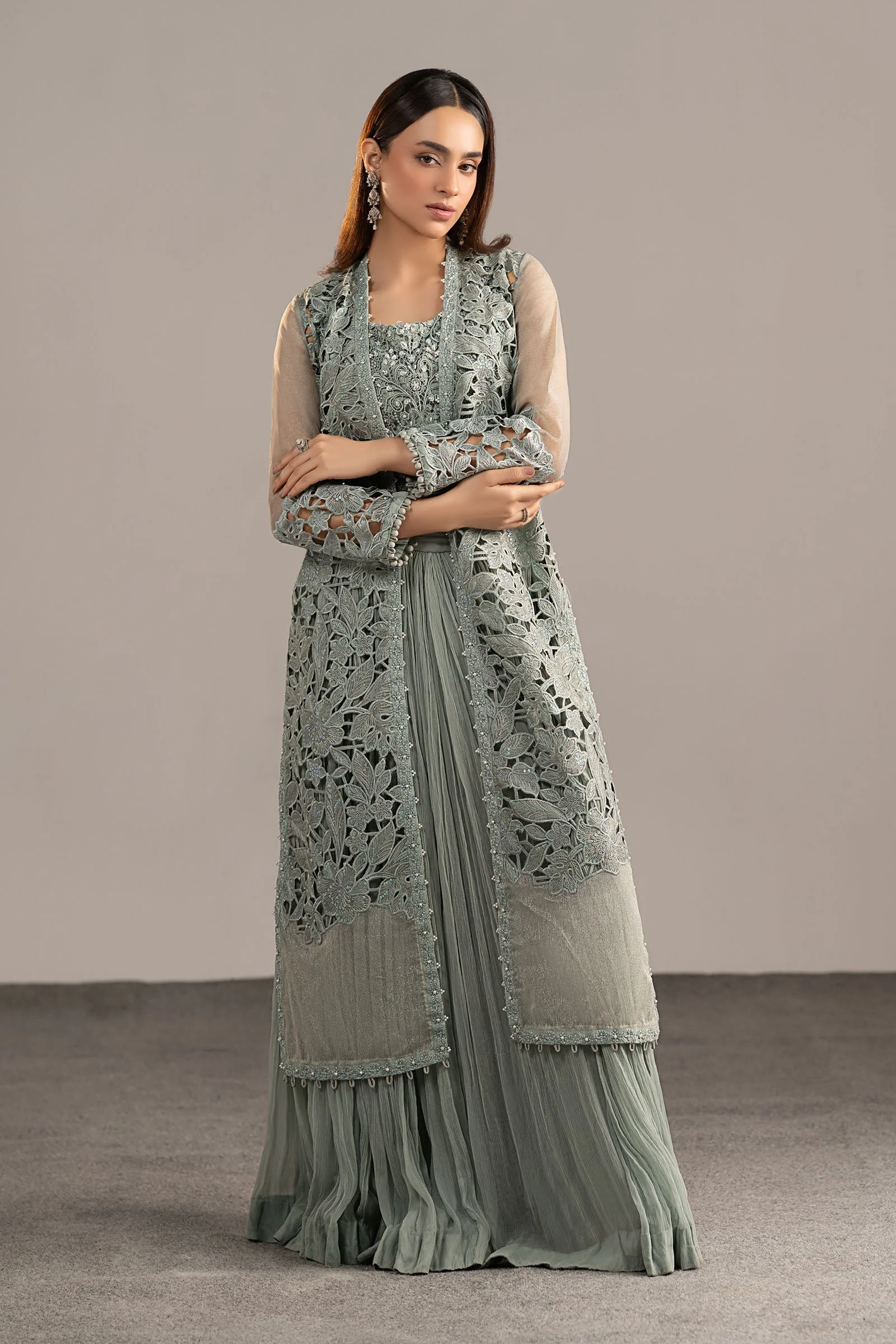 • Style: Front-Open Embroidered Shirt with Crushed Sharara and Blouse