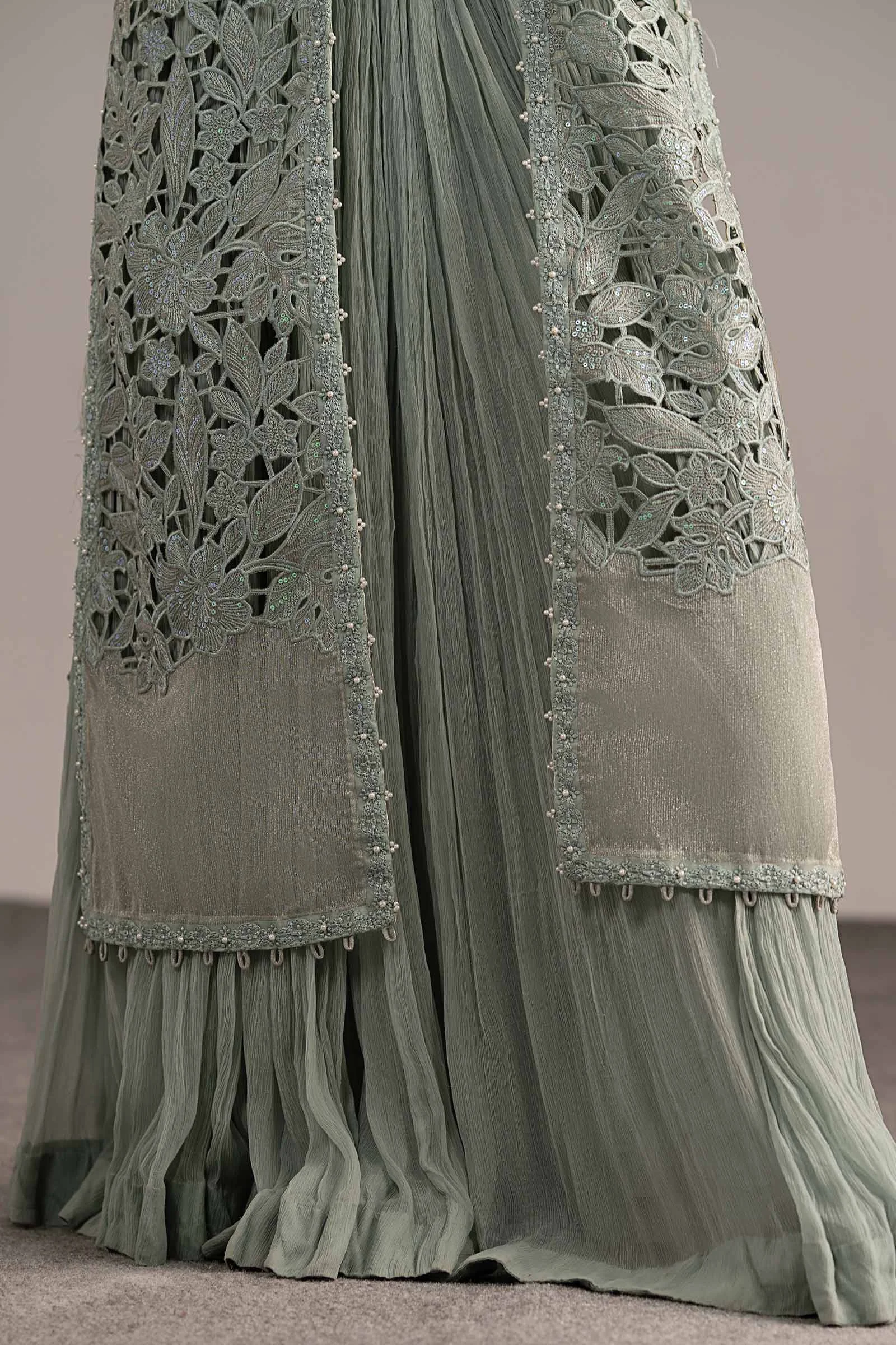 The suit features a beautifully tailored front-open embroidered shirt adorned with delicate zari threadwork that catches the light with every step. Paired with an intricately embroidered blouse and a fluid crushed sharara trouser, the silhouette strikes the perfect balance between traditional grandeur and contemporary style. The ethereal ice blue tone lends the outfit a soft, regal quality that photographs beautifully — perfect for your next event look.