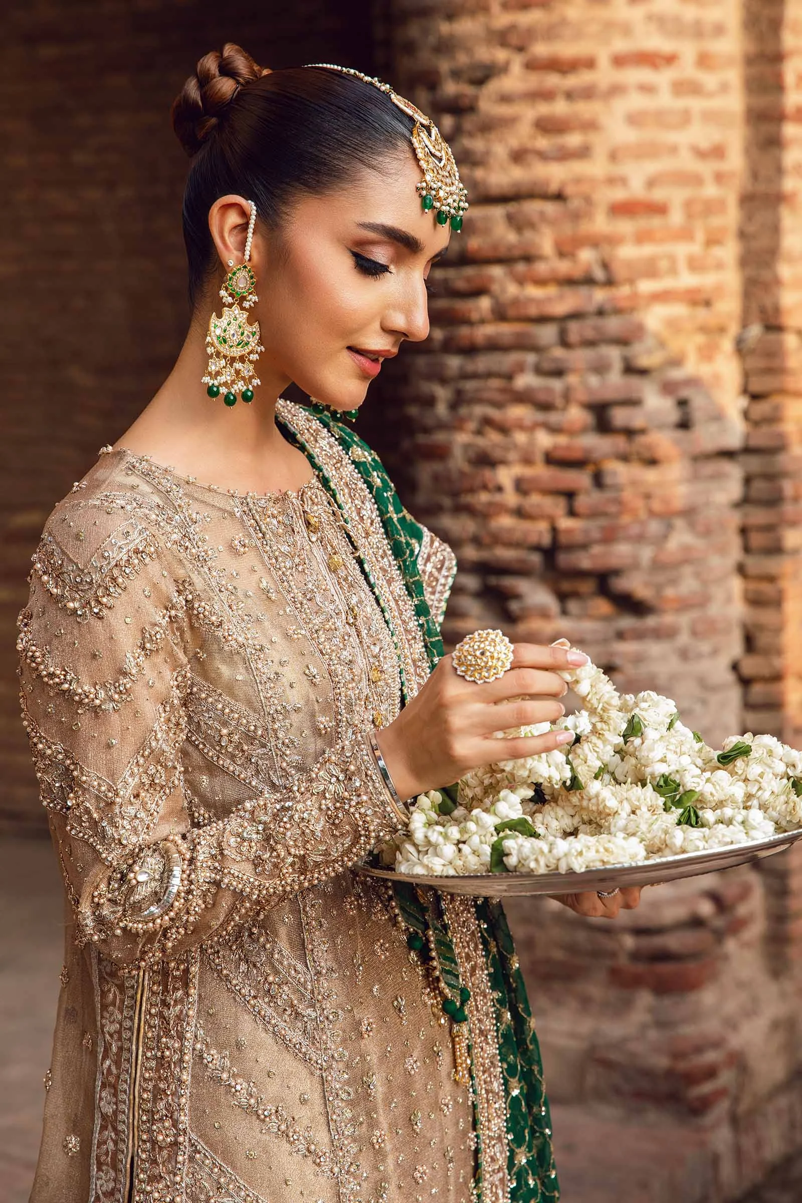 Pair this ivory churidar set with gold or antique jadau jewellery to complement the Zari embroidery. Nude or champagne heels elongate the look, while a sleek bun or loose waves both work beautifully. For brides-to-be shopping for pre-wedding functions, this ensemble is an ideal choice that photographs stunningly.