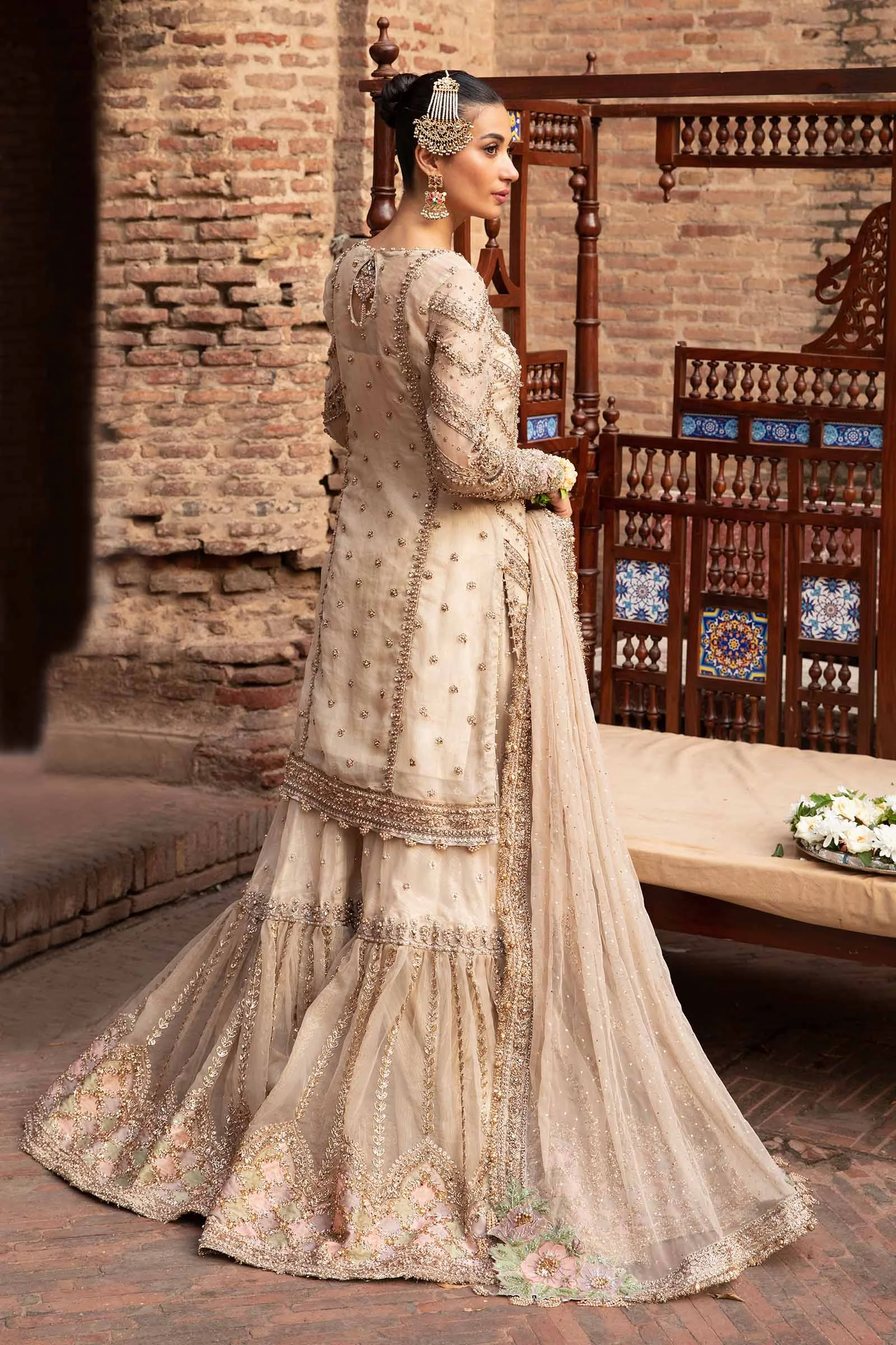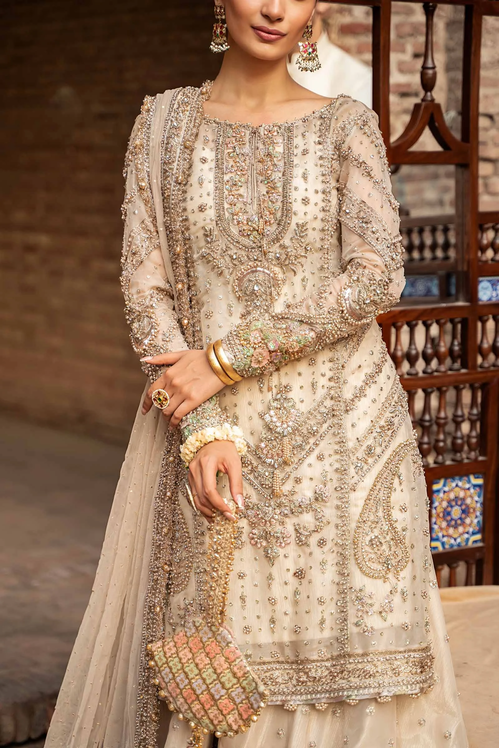 Pair this ivory gharara set with statement gold jhumkas and a classic bun adorned with floral pins for a bridal-inspired look. Opt for nude or gold strappy heels to elongate the silhouette. Minimal base makeup with a bold lip in soft rose or nude will let the embroidery speak for itself. This ensemble is styled to perfection for women who appreciate the art of Pakistani dress online shopping.