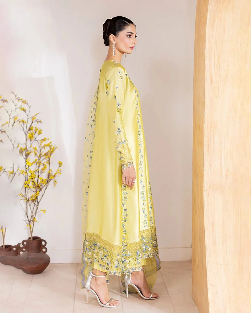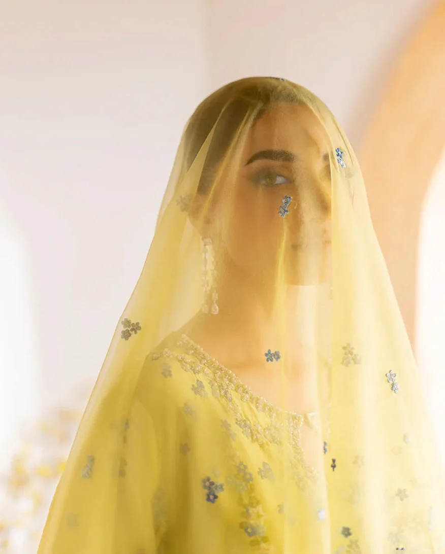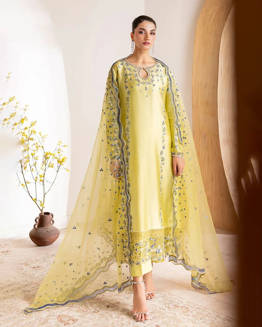 Step into the spotlight with the Zilverah Lumiere, a radiant party wear creation that fuses contemporary silhouette with timeless Pakistani craftsmanship. Dressed in a bold and refreshing lime yellow hue, this three-piece luxury pret ensemble is your ultimate answer to standout dressing for every festive season. Whether you are shopping for Pakistani dress online or searching for that perfect wedding guest outfit, Lumiere delivers elegance without compromise.