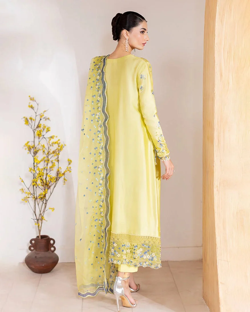 Illuminate every celebration in the Zilverah Lumiere — a stunning 3-piece party wear ensemble crafted from luxurious Sheesha Silk, flowing Organza dupatta, and refined Raw Silk trousers. This lime yellow masterpiece is designed for the modern Pakistani woman who commands attention at weddings, Eid gatherings, mehndi nights, and formal events.