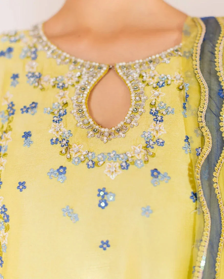 The Lumiere collection celebrates the beauty of structured femininity. The straight-cut silk shirt features exquisite Sheesha Silk construction with fine embellishments that catch light effortlessly — true to its name. Paired with tailored straight trousers and a dreamy organza dupatta, this ensemble strikes the perfect balance between regal and wearable. The lime yellow tone is vibrant yet sophisticated, making it a head-turning choice for any occasion.