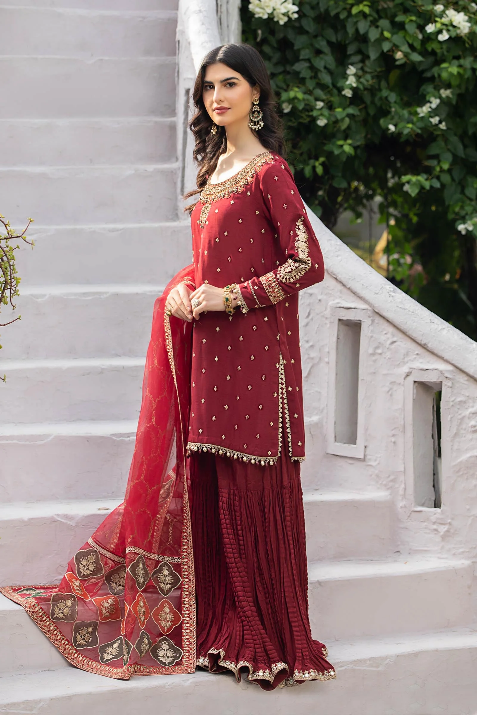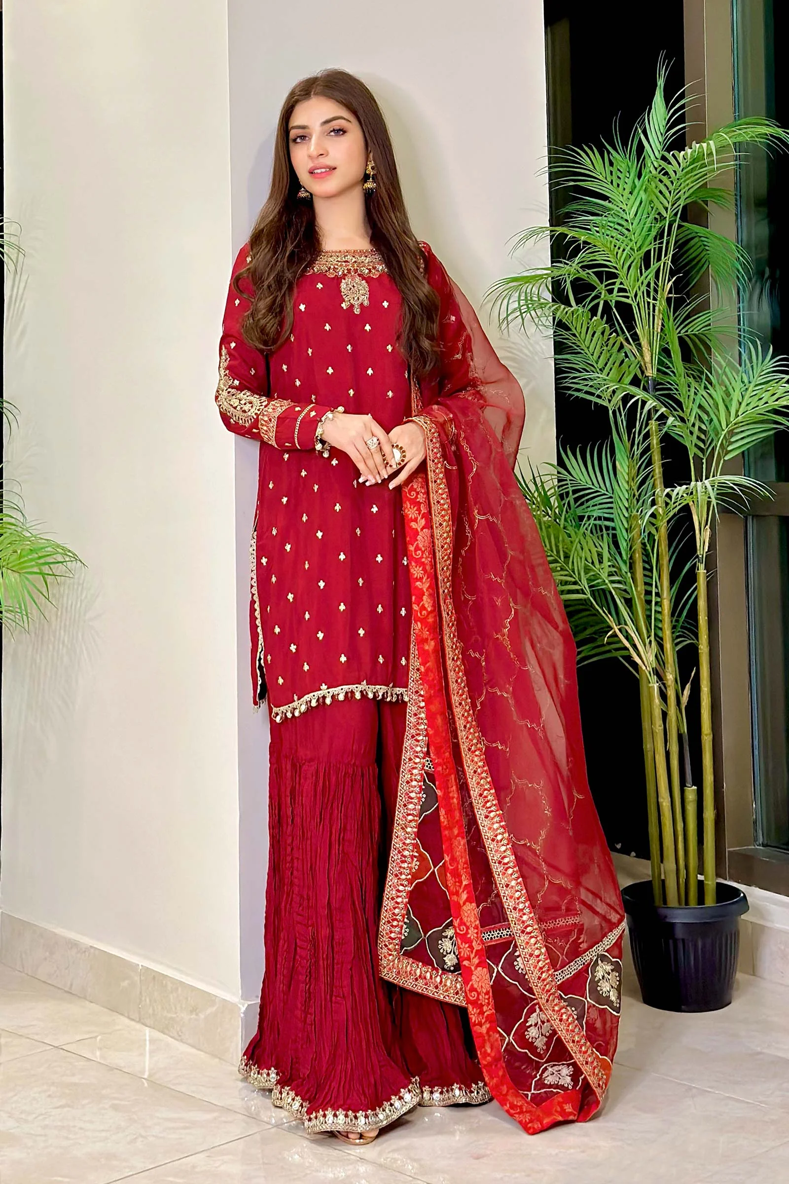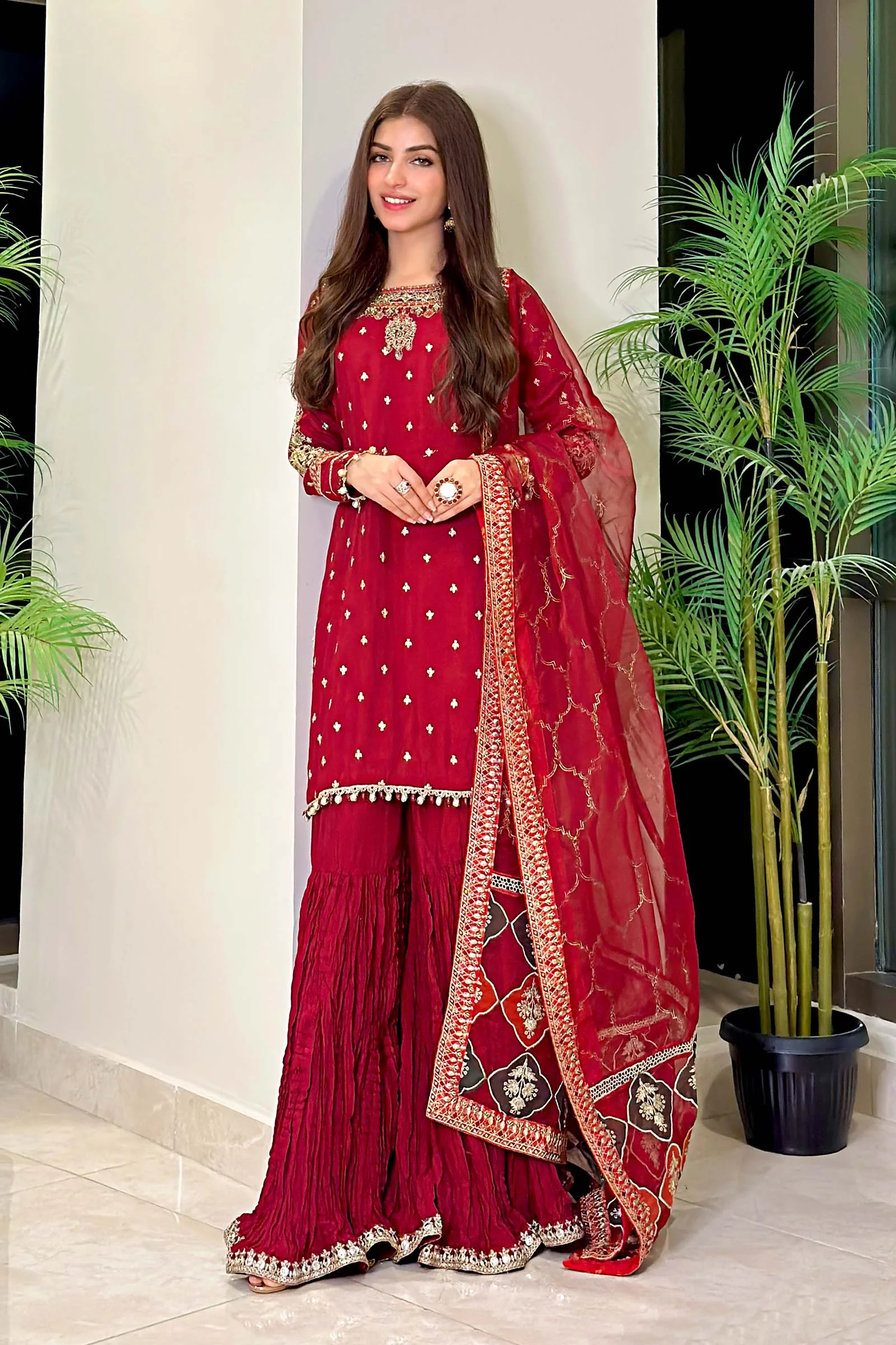 This showstopping maroon gharara suit is designed to command attention at every formal gathering. The embroidered short shirt features intricate needlework that frames the neckline and hem with opulent detail, while the crushed gharara flows with regal movement that complements both standing and seated silhouettes. The block-printed organza dupatta adds a refined finishing touch, making this ensemble a complete statement look for weddings, Eid, and special events across Lahore, Karachi, Islamabad, and beyond.