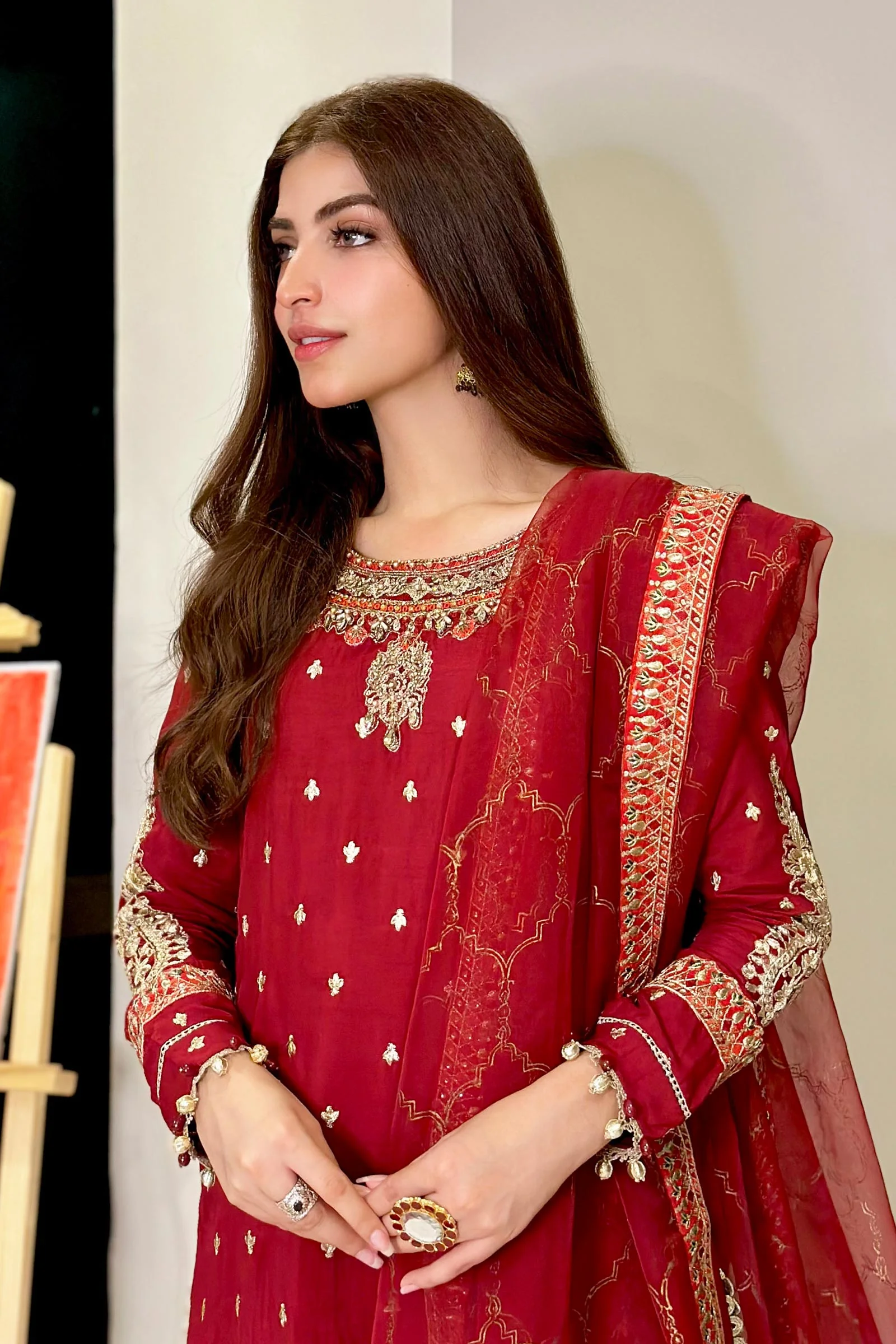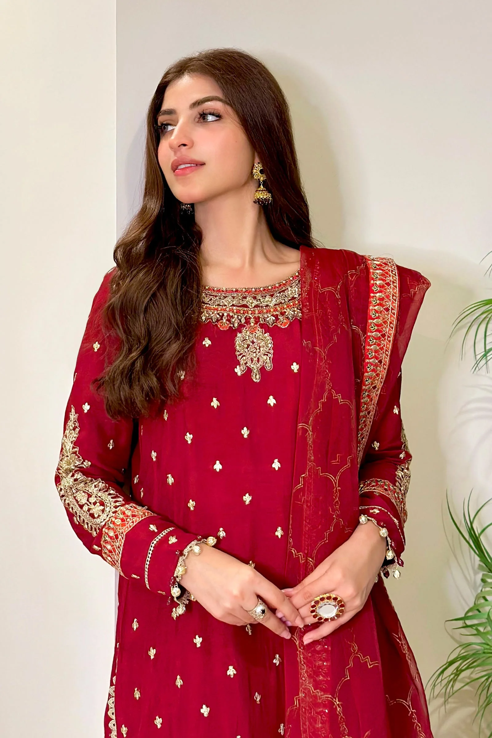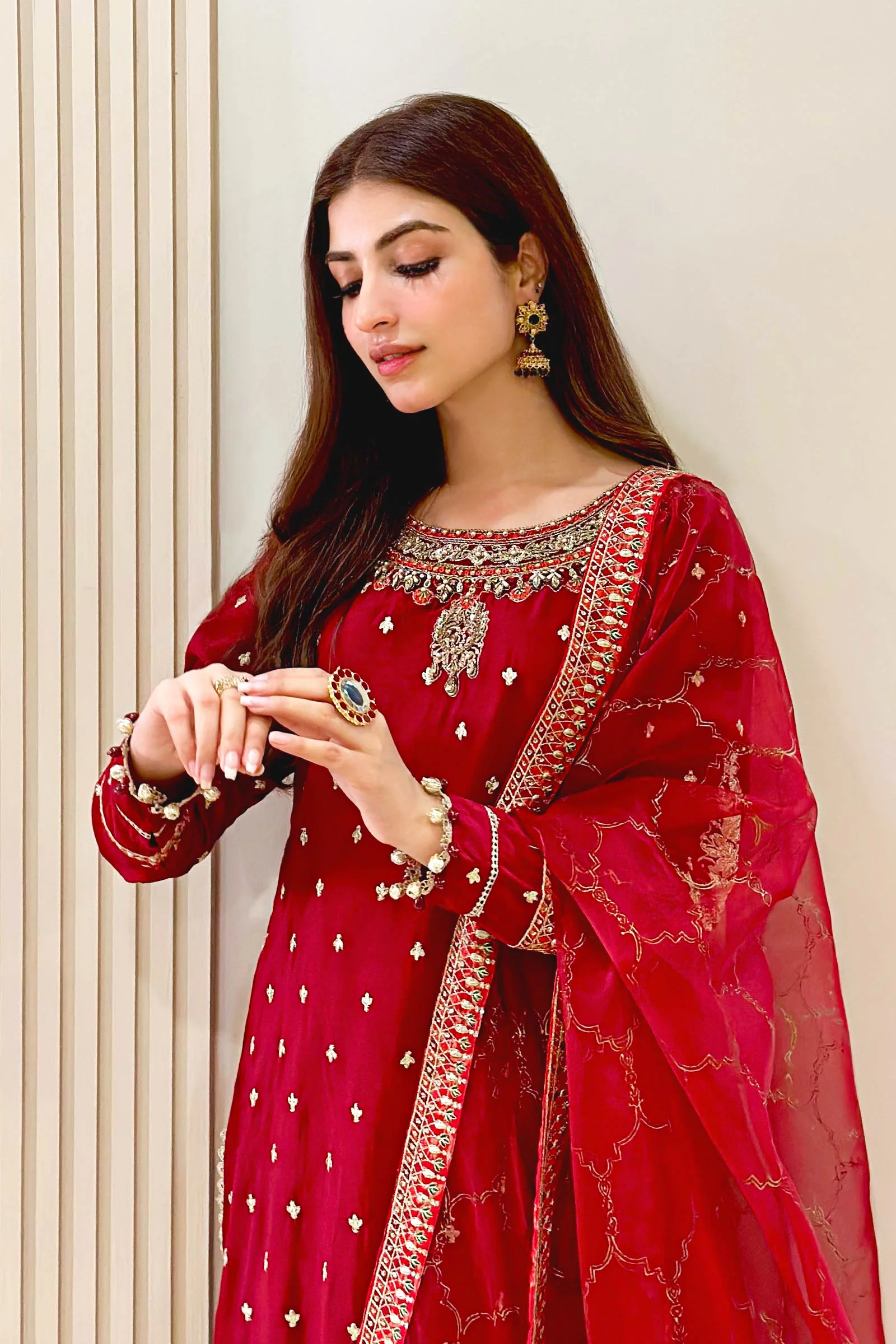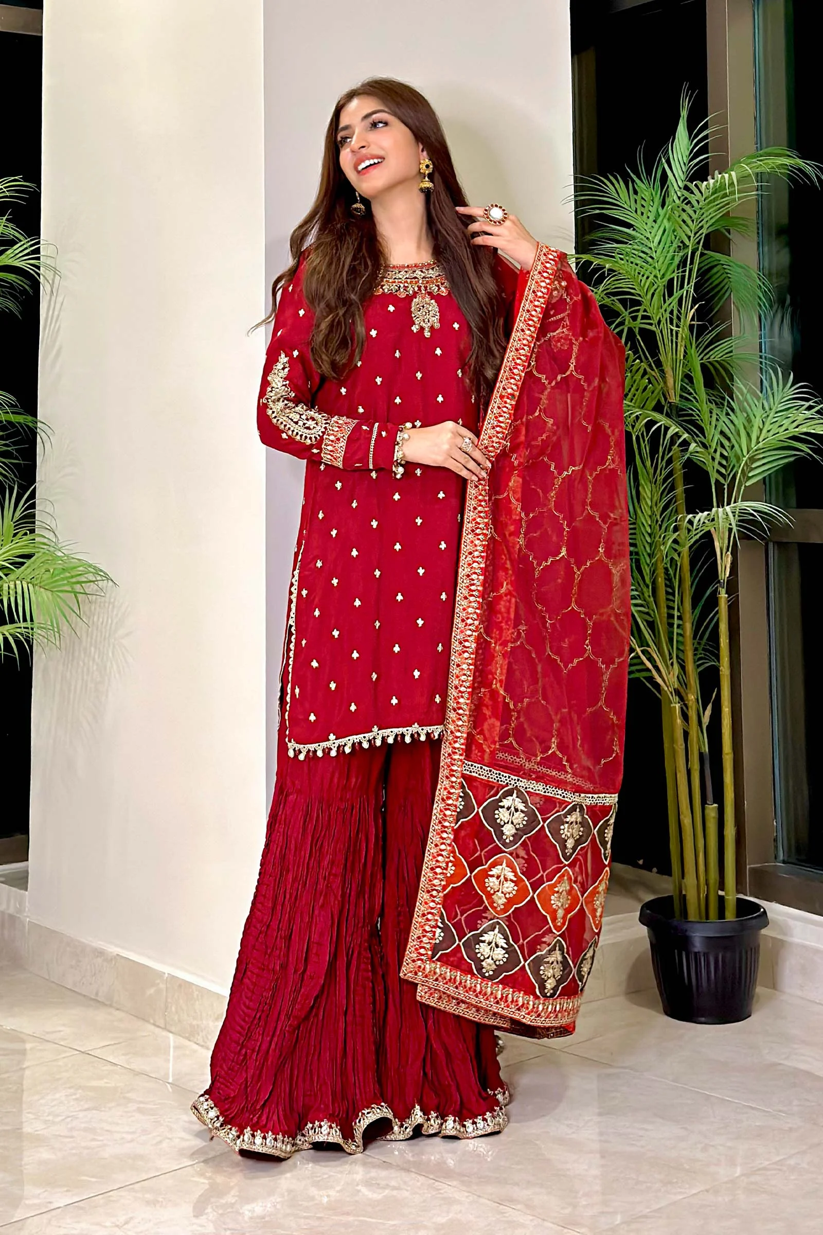 This showstopping maroon gharara suit is designed to command attention at every formal gathering. The embroidered short shirt features intricate needlework that frames the neckline and hem with opulent detail, while the crushed gharara flows with regal movement that complements both standing and seated silhouettes. The block-printed organza dupatta adds a refined finishing touch, making this ensemble a complete statement look for weddings, Eid, and special events across Lahore, Karachi, Islamabad, and beyond.
