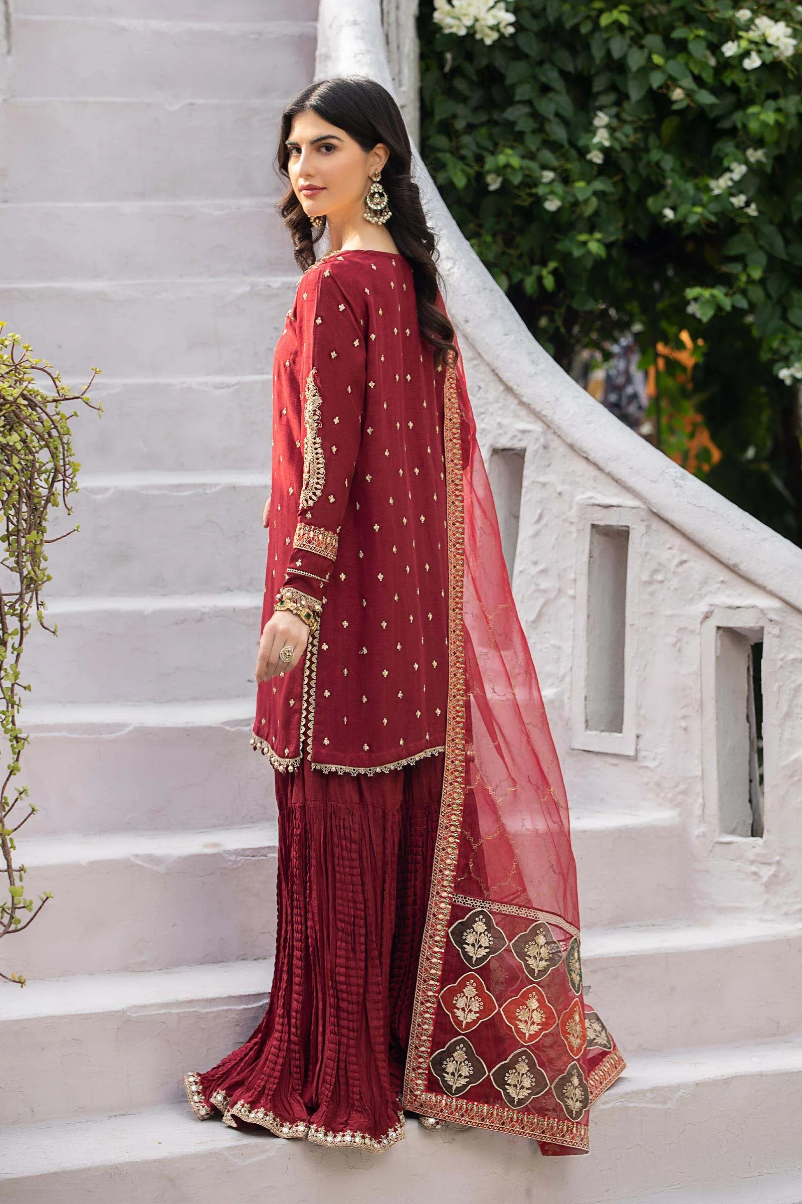 Step into every celebration with effortless grace wearing this exquisite Zilverah Maroon Embroidered Raw Silk Gharara Suit — a breathtaking choice in formal wear for the modern Pakistani woman. Whether you’re dressing for Eid, a wedding function, or a formal dinner, this 3-piece luxury ensemble delivers the perfect balance of tradition and contemporary elegance. Available for easy Pakistani dress online shopping, this gharara suit is now delivered across Pakistan with free shipping on orders above PKR 10,000.