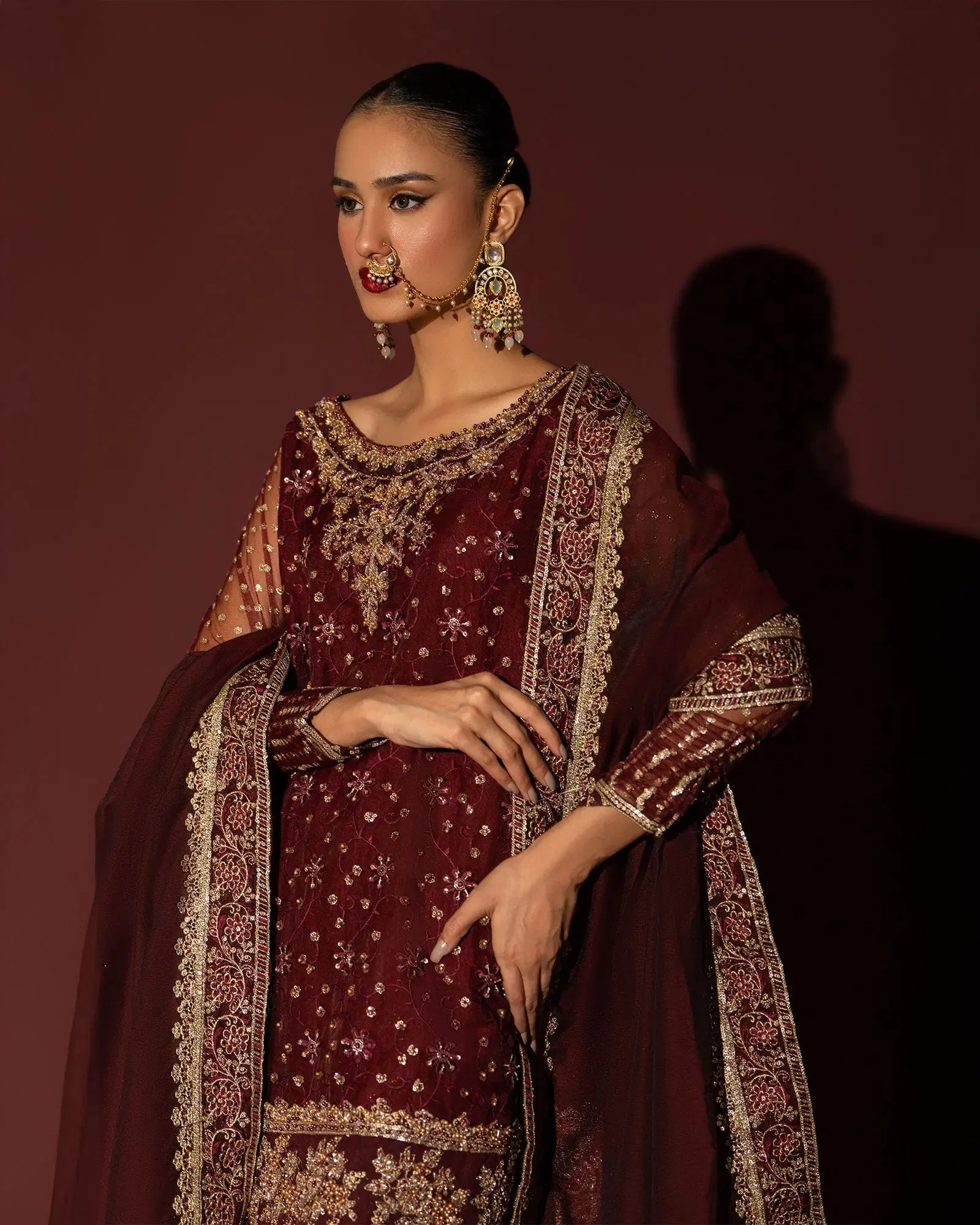 This regal maroon set is a celebration of timeless Pakistani artistry. The rich color palette of deep maroon radiates sophistication and bridal-adjacent glamour, making it the perfect statement outfit for every wedding function. Intricate detailing on the gharara and shirt elevates the look from beautiful to truly breathtaking.