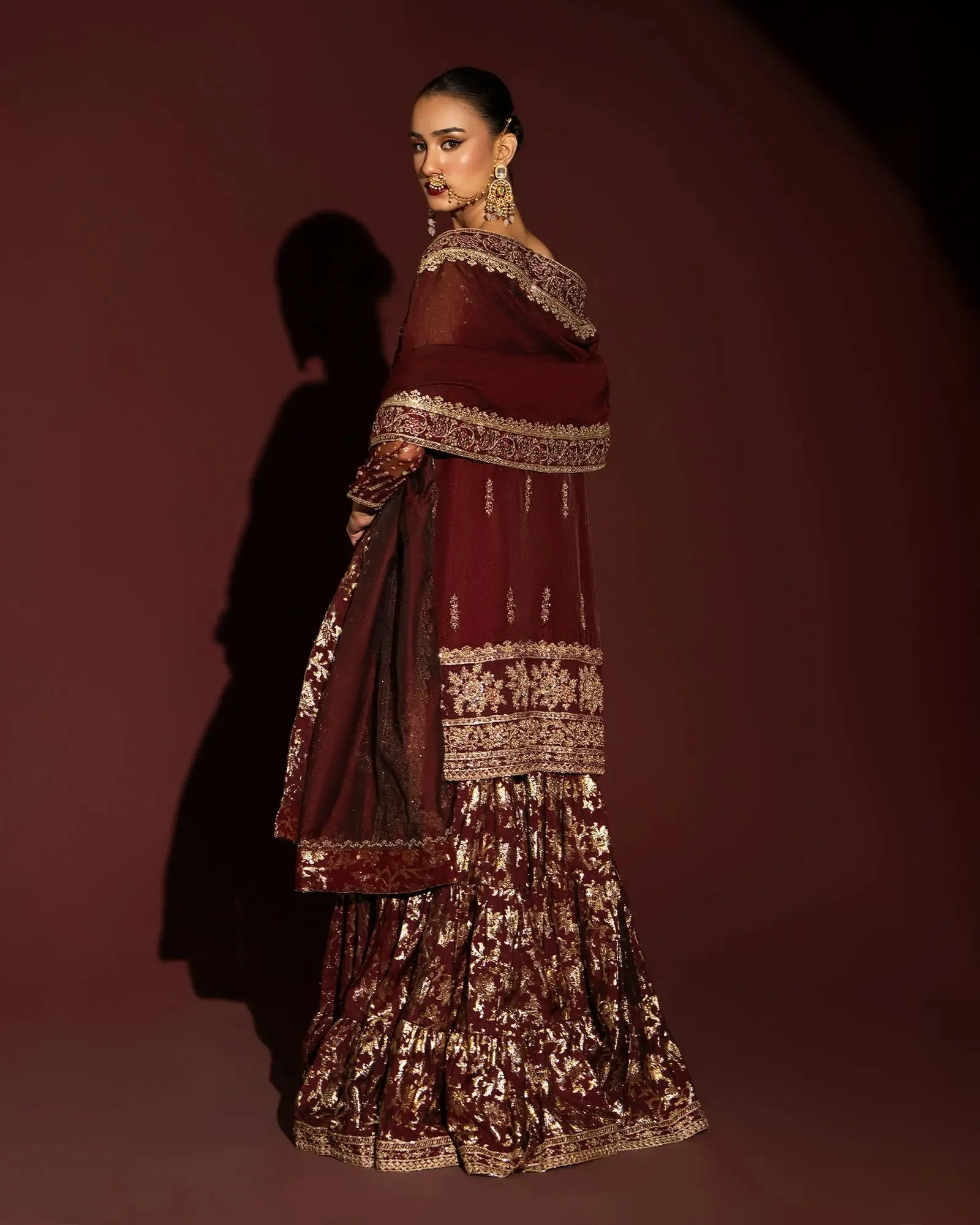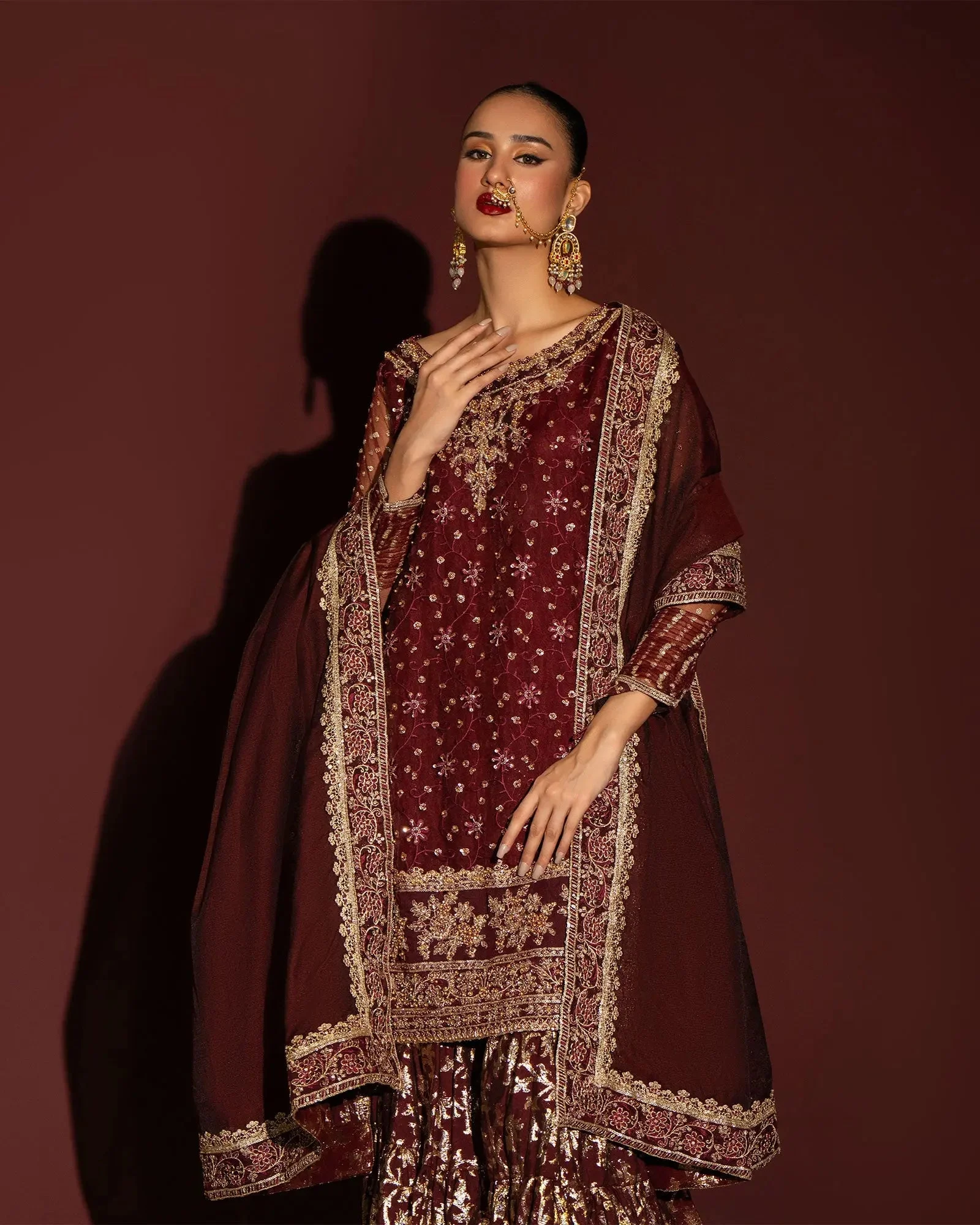 Pair this maroon gharara set with antique gold or kundan jewellery to amplify its regal charm. Opt for a high bun or soft waves to let the neckline detail shine. Complete the look with embellished heels in gold or nude to keep the focus on this magnificent ensemble.