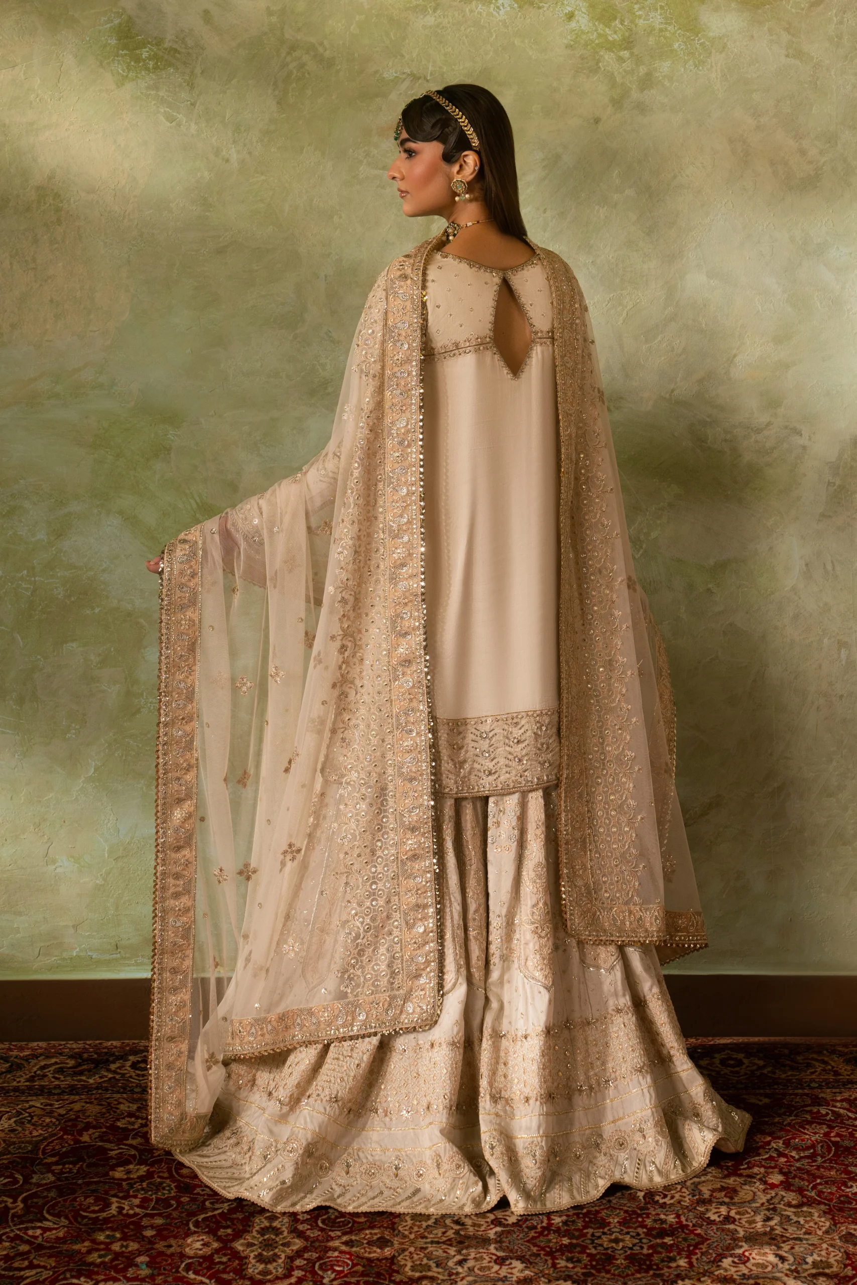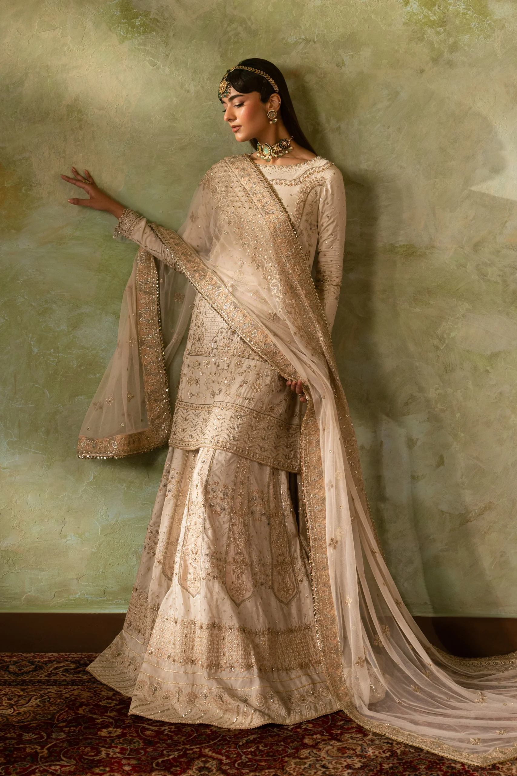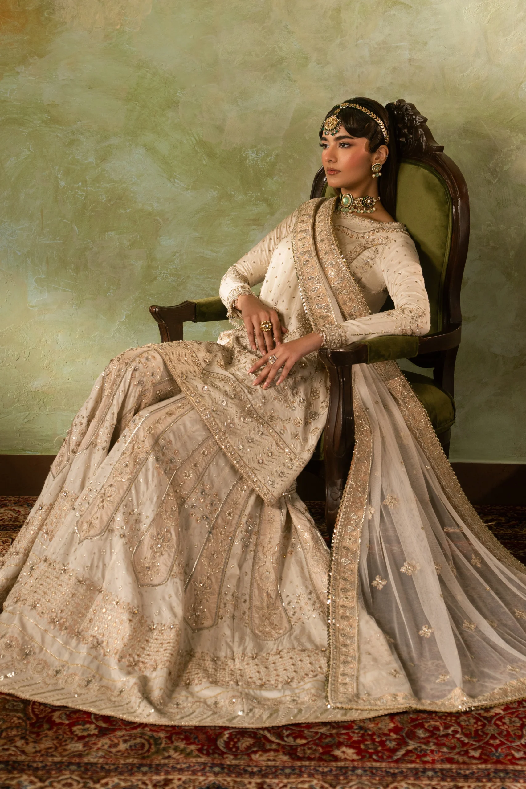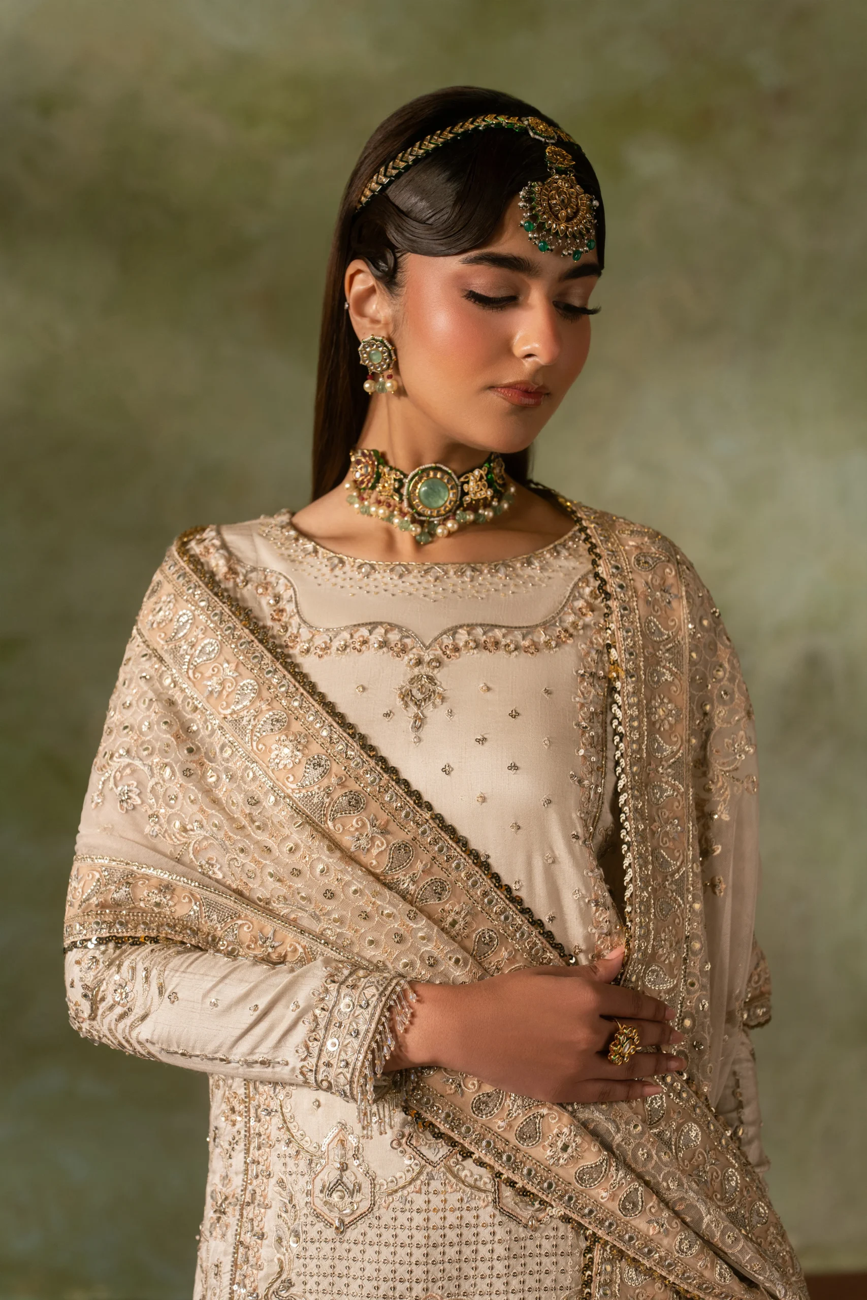 The Damiya is a masterclass in refined bridal aesthetics. The A-line frock silhouette flatters all body types while maintaining the soft, flowing elegance expected of a Nikkah look. Intricate embroidery is spread evenly across the shirt, with clean, detailed patterns that add visual interest without making the ensemble feel heavy or overdone. The neckline and sleeves are thoughtfully adorned, completing a look that is both modern and timelessly Pakistani.